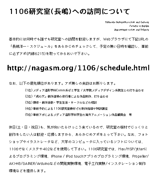 有史以前の静岡文化芸術大学 担当講義シラバス一覧 (開学前・文部省提出資料) 開学7ヶ月前のパンフレット 開学5ヶ月前のパンフレット 開学23日前のSUAC風景(2000年3月) 開学前日のSUAC風景(2000年4月) 新聞に載りました 「技術造形1期生へ」 数学に関するアンケート 「軽音」立上げ支援ポスター 技術造形・数学補講 「芸術文化1期生へ」 一般公開デーに向けて 特別展示企画案(1) 特別展示企画案(2) 「虎の穴」とは (2000version) センサオブジェ(佐藤先生) ロボットアーム製作記 2000年公開デー10日前の風景 公開デー5日前の風景 公開デー4日前の風景 公開デー前日の風景 2000年公開デー当日の風景 軽音ゴスペル隊ライブ 公開デーの新聞記事 「森海」システム解説 「森海」パンフレット 「森海」学生CG作品集 「森海」センサオブジェ写真集 第1期「虎の穴」学生レポート集 大山真澄Director第1号作品 1106長嶋研究室への訪問について 2000年オープンキャンパスに向けて オープンキャンパス技術造形企画 第2期「虎の穴」募集 第3期「虎の穴」募集 Photoshopで遊んでみました 第2期「虎の穴」学生CG作品集 Photoshopの「フィルタ」集 オープンキャンパス学生CG作品 2000年オープンキャンパス展示風景 「情報処理III」履修登録について 富山国体夏期大会開会式を視察しました 赤虎合宿 新作 "Wandering Highlander" ↑その準備・公演風景↑ LEGOロボット製作記 Sensors for Interactive Music Performance 「情報処理III」受講者選抜 ↑その講義初日の配布物 2000年後期開講「情報処理III」 第2期「虎の穴」学生レポート集 富山国体秋期大会開会式を視察しました "Wandering Highlander" Max Patch 富山国体秋期大会閉会式を視察しました きらりんぴっく開会式を視察しました 「情報処理III」受講者へ 第1回碧風祭 第4期「虎の穴」募集 第5期「虎の穴」募集 静岡文化芸術大学スタジオレポート 怪しさ全開1106研究室(1) Team「風虎」作品制作風景 第3期「虎の穴」リハーサル風景 インターカレッジコンサート2000参加 インタラクティブ・メディアアートのためのヒューマンインターフェース技術造形 第3期「虎の穴」学生レポート集 「DTM秘伝講座」特講のお知らせ 赤虎2合宿(→第12話-第16話) ふじっぴーアニメ作品集(1) メディア・インスタレーションを用いたインタラクティブ・パフォーマンスについて MiniBioMuse-I MiniBioMuse-II MiniBioMuse-III ( 2001年4月 → 2002年3月 )