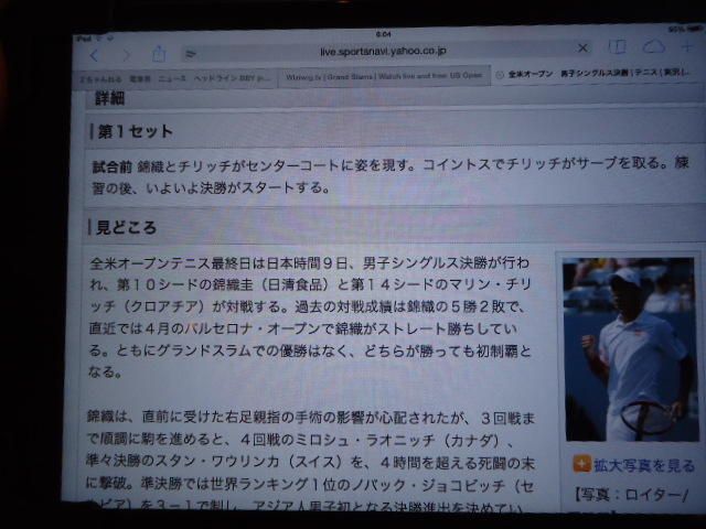 ホテルの部屋に戻り、テレビの錦織選手の全米オープン決勝のライヴ中継と、あとはiPadを触るだけ