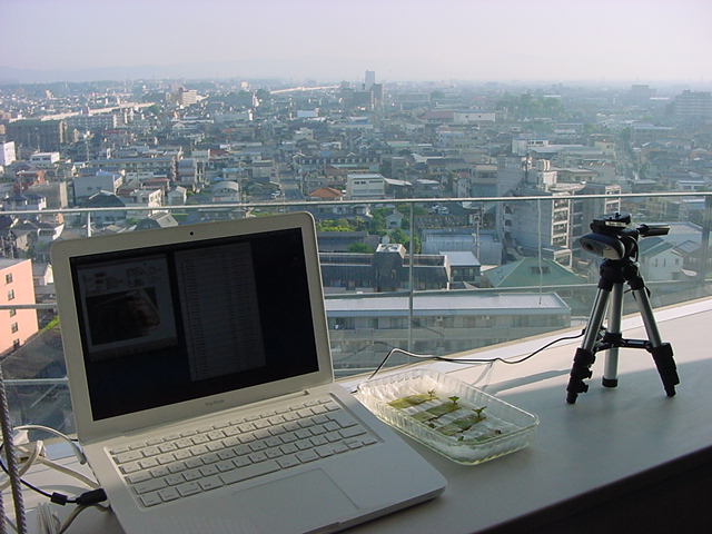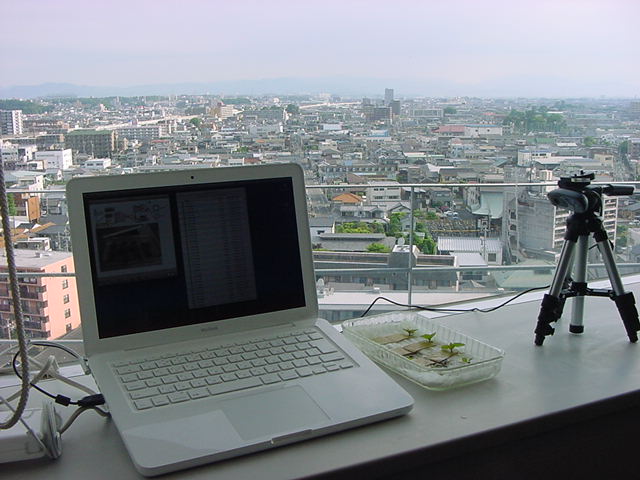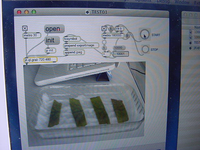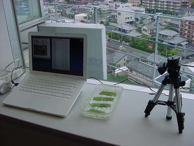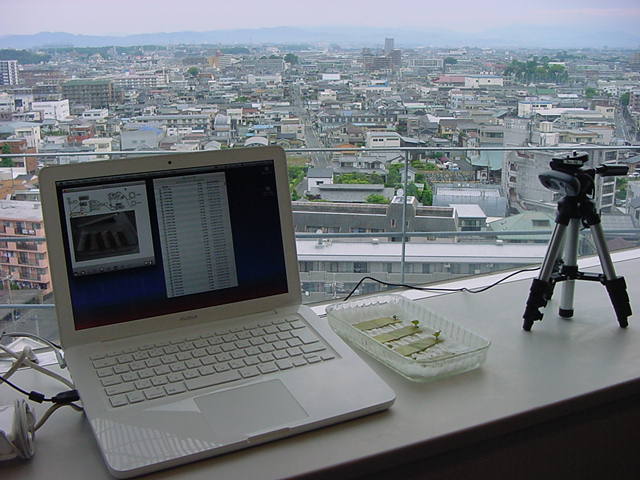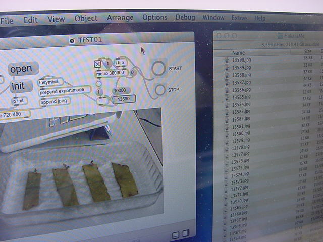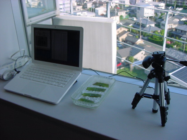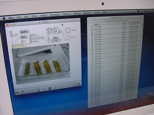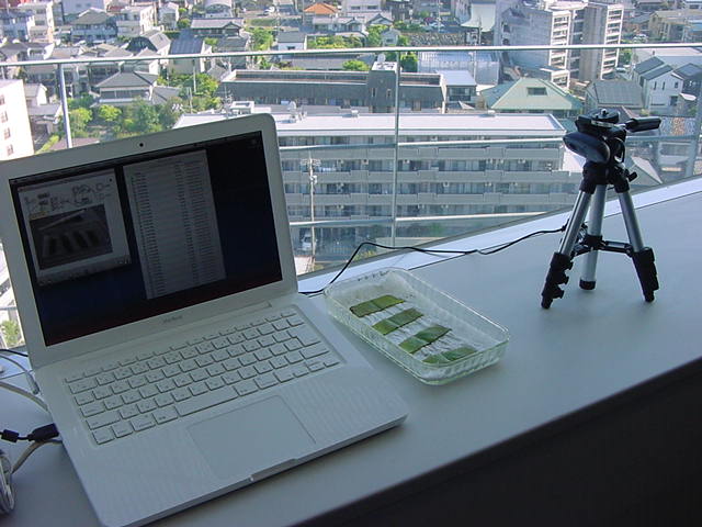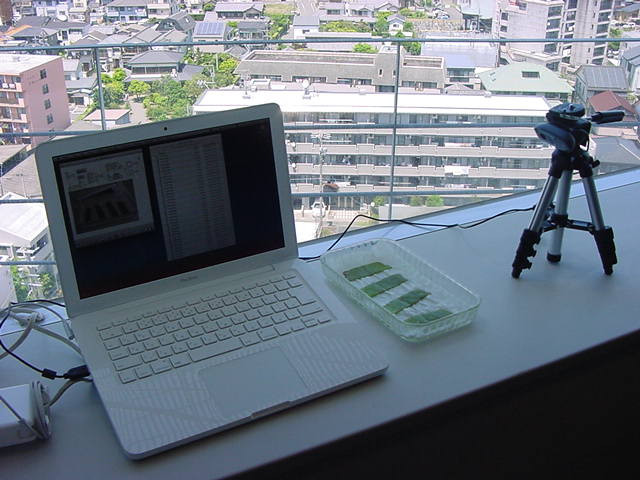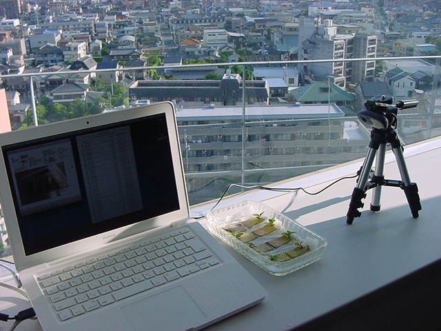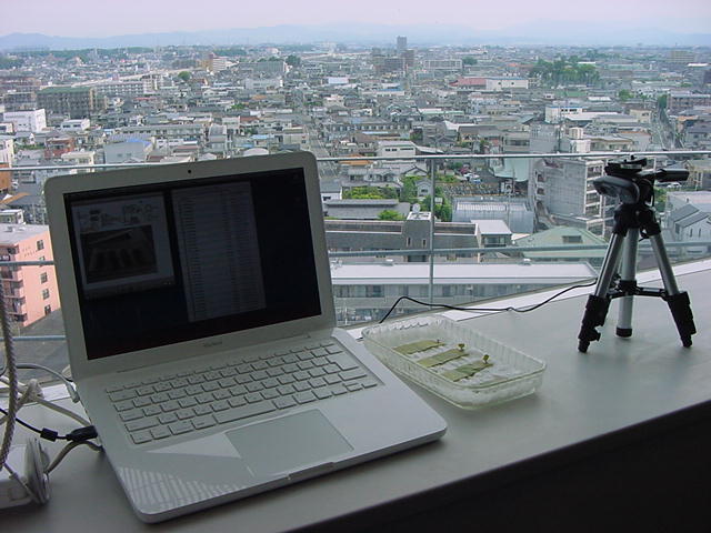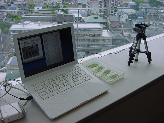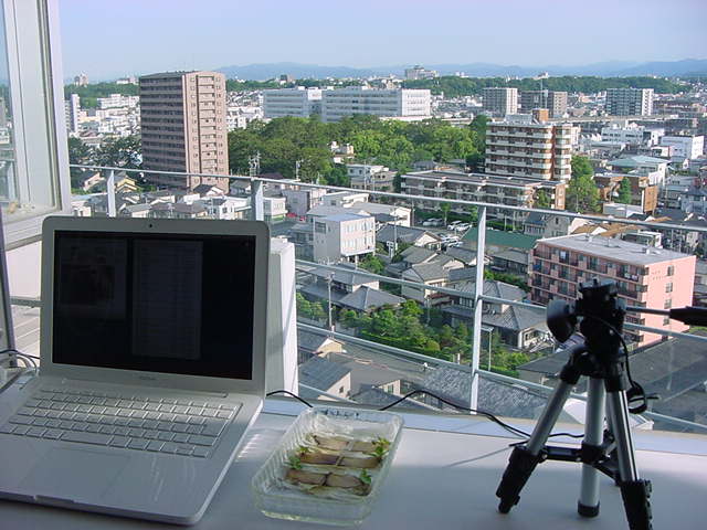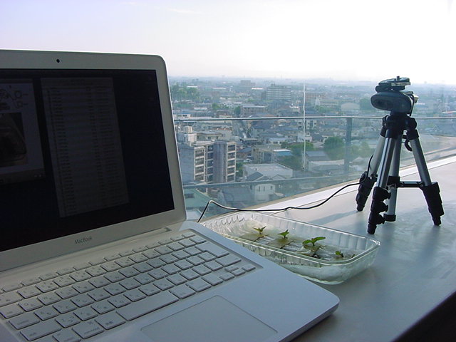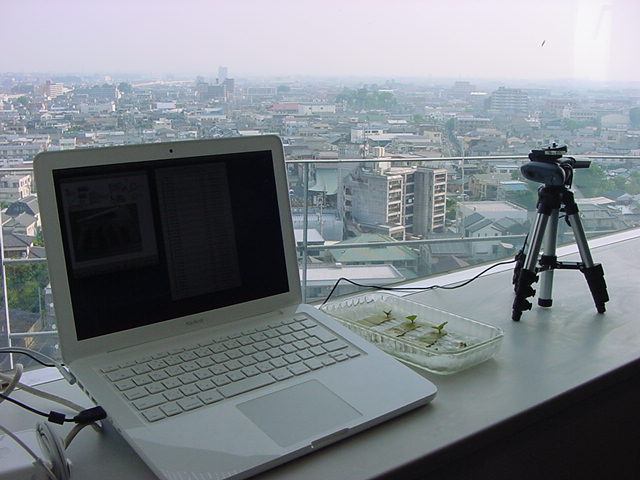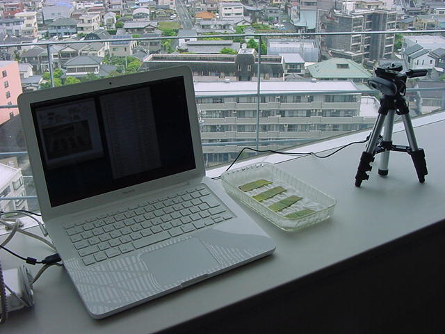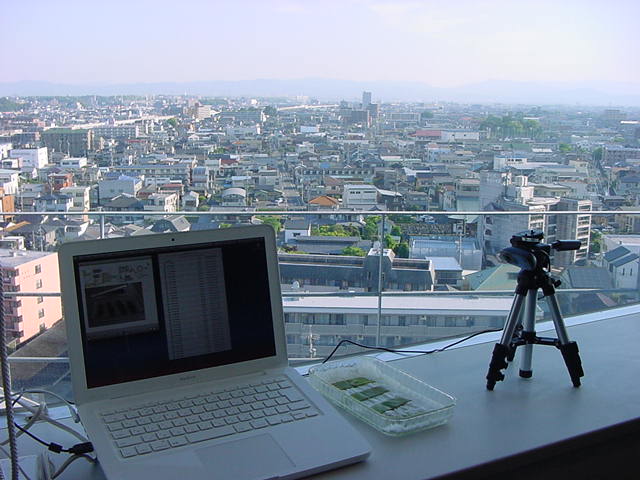・・・そしてそれから1年ちょっと、南国の植物なのに浜松の寒風にも耐えて、幅1cm程に切って濡れティッシュの上に置かれた葉っぱから芽が出て茎が伸びて、ベランダのプランターで元気に育ったうちの1本を、 研究室に持ってきた のですが、ここで再び「葉から芽」をやってみよう、と思い立ちました。思い付いたもう一つの理由は、いま書いている Xcode日記 に関係します。 新学期となって、新2回生が「サウンドデザイン」で新たに触れる、あるいは新3回生が「音楽情報科学」でさらに深める、 Max を使って、久しぶりに「 定点観測 」をしようかな、と思い立ったのです。 ただし、これまでの定点観測(ストップモーションアニメーション作成Maxパッチ)は、15秒に1枚の静止画を自動撮影するものでしたが、葉から芽では人間のように動かないので、Maxパッチを「360秒に1枚」と変更しました。 6分ごとに1枚、つまり1時間で10コマ、1日(24時間)で240コマとなり、繋げたムービーを24fpsで再生すると「1日が10秒」となります。 以下はその初日、研究室の窓際にシステムを設置して準備した模様です(写真は180秒ですが後で360秒に変更)。 果たしてうまく行くかどうか、乞う御期待。