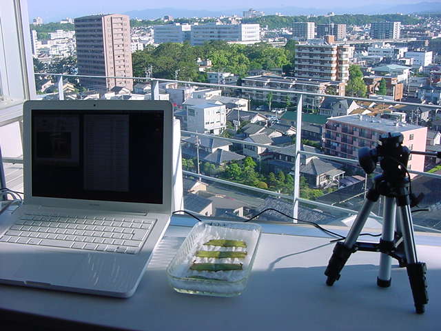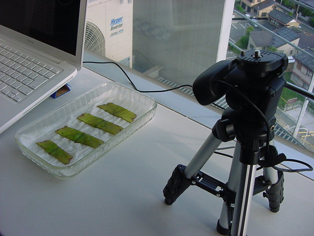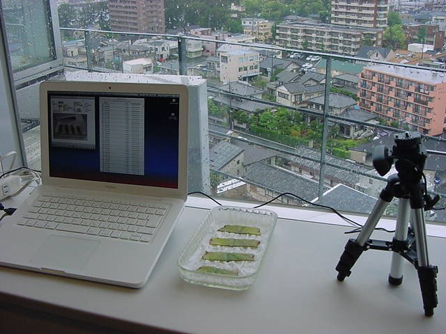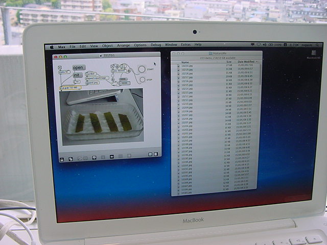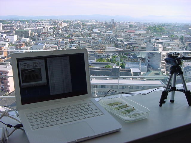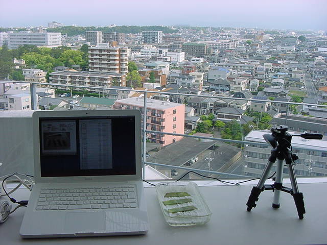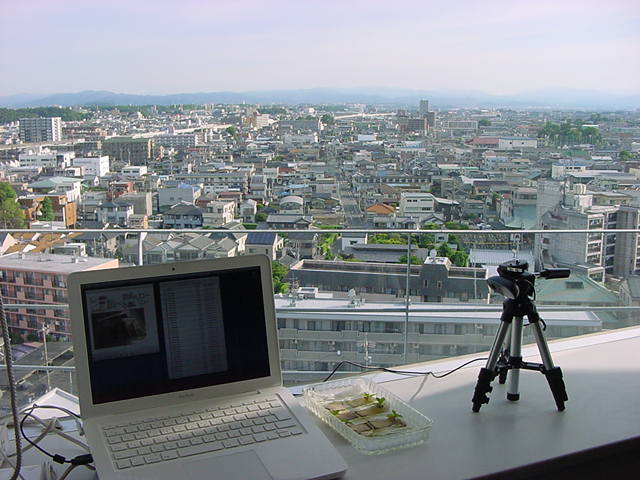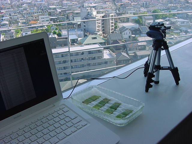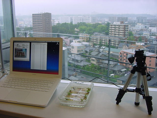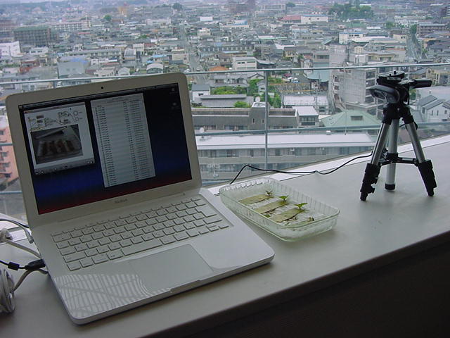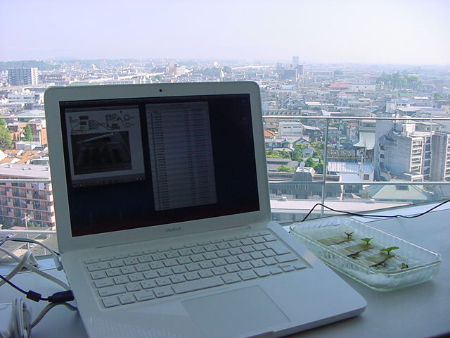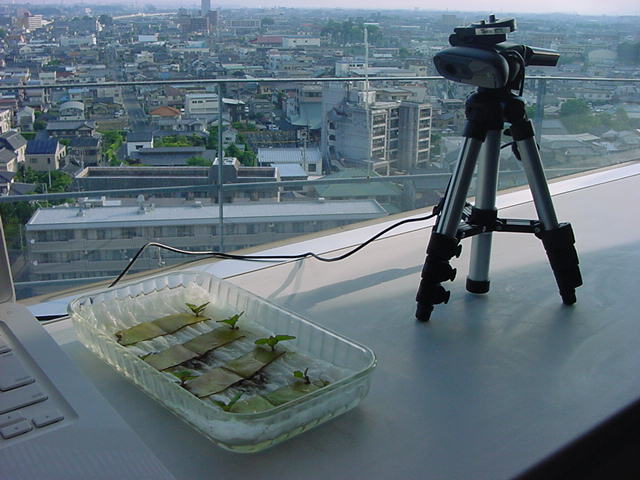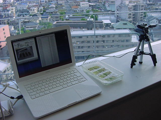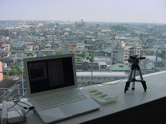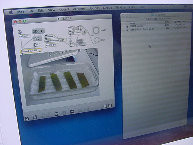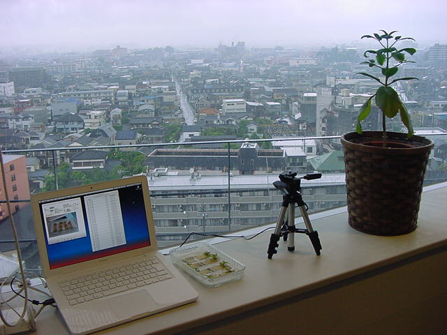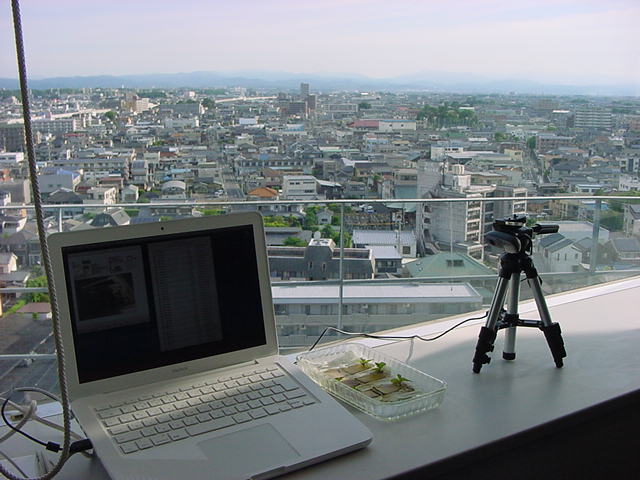 ・・・そしてそれから1年ちょっと、南国の植物なのに浜松の寒風にも耐えて、幅1cm程に切って濡れティッシュの上に置かれた葉っぱから芽が出て茎が伸びて、ベランダのプランターで元気に育ったうちの1本を、 研究室に持ってきた のですが、ここで再び「葉から芽」をやってみよう、と思い立ちました。思い付いたもう一つの理由は、いま書いている Xcode日記 に関係します。 新学期となって、新2回生が「サウンドデザイン」で新たに触れる、あるいは新3回生が「音楽情報科学」でさらに深める、 Max を使って、久しぶりに「 定点観測 」をしようかな、と思い立ったのです。 ただし、これまでの定点観測(ストップモーションアニメーション作成Maxパッチ)は、15秒に1枚の静止画を自動撮影するものでしたが、葉から芽では人間のように動かないので、Maxパッチを「360秒に1枚」と変更しました。 6分ごとに1枚、つまり1時間で10コマ、1日(24時間)で240コマとなり、繋げたムービーを24fpsで再生すると「1日が10秒」となります。 以下はその初日、研究室の窓際にシステムを設置して準備した模様です(写真は180秒ですが後で360秒に変更)。 果たしてうまく行くかどうか、乞う御期待。