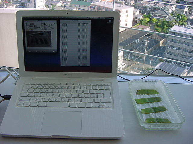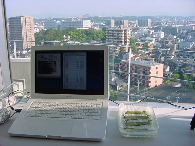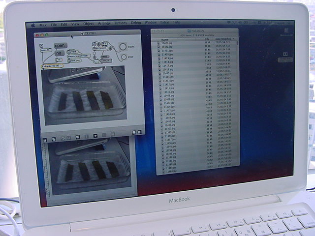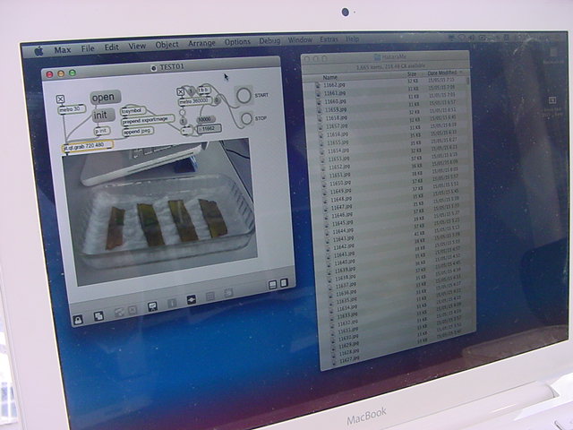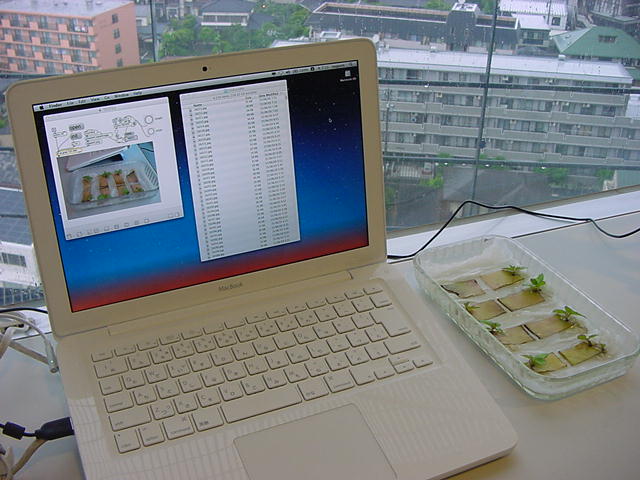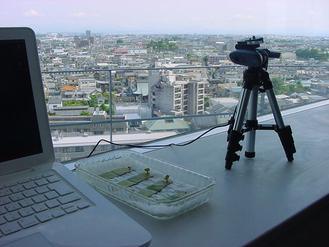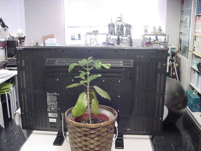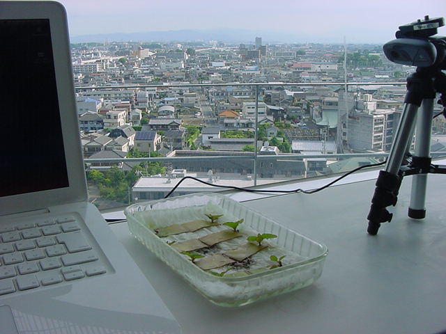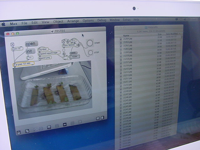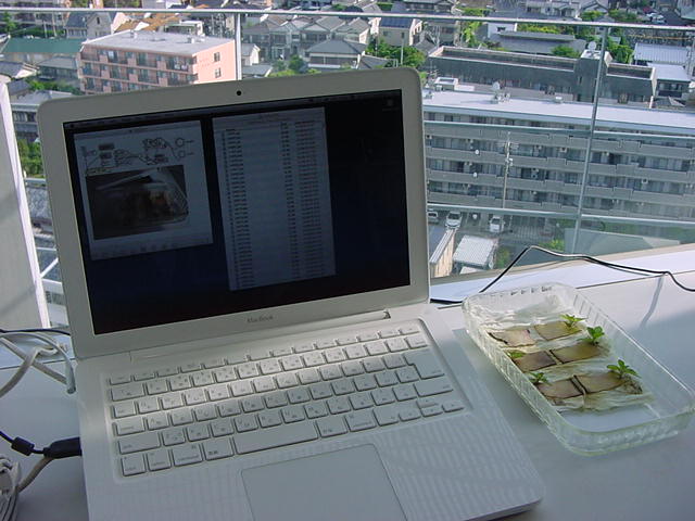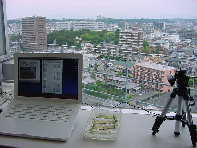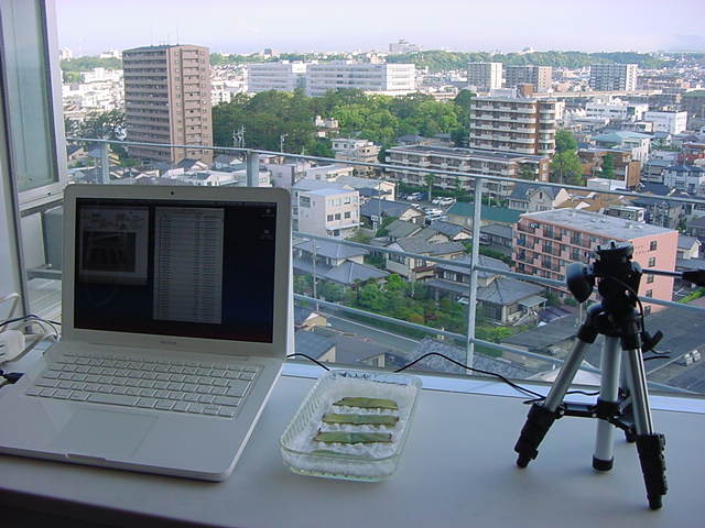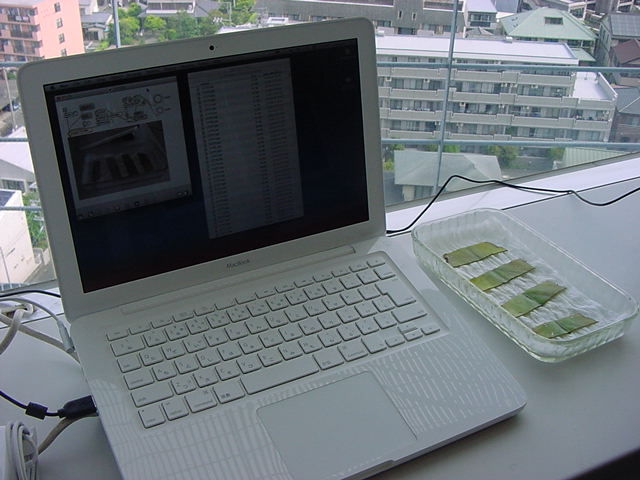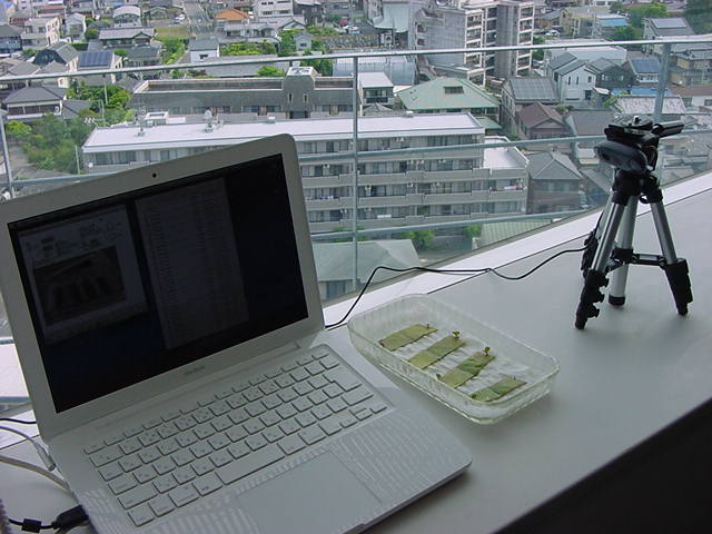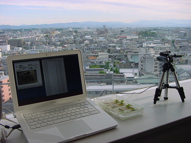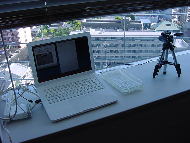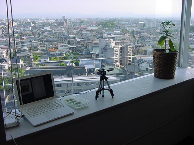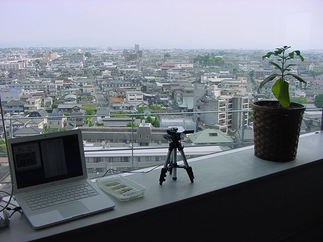 ・・・そしてそれから1年ちょっと、南国の植物なのに浜松の寒風にも耐えて、幅1cm程に切って濡れティッシュの上に置かれた葉っぱから芽が出て茎が伸びて、ベランダのプランターで元気に育ったうちの1本を、 研究室に持ってきた のですが、ここで再び「葉から芽」をやってみよう、と思い立ちました。思い付いたもう一つの理由は、いま書いている Xcode日記 に関係します。 新学期となって、新2回生が「サウンドデザイン」で新たに触れる、あるいは新3回生が「音楽情報科学」でさらに深める、 Max を使って、久しぶりに「 定点観測 」をしようかな、と思い立ったのです。 ただし、これまでの定点観測(ストップモーションアニメーション作成Maxパッチ)は、15秒に1枚の静止画を自動撮影するものでしたが、葉から芽では人間のように動かないので、Maxパッチを「360秒に1枚」と変更しました。 6分ごとに1枚、つまり1時間で10コマ、1日(24時間)で240コマとなり、繋げたムービーを24fpsで再生すると「1日が10秒」となります。 以下はその初日、研究室の窓際にシステムを設置して準備した模様です(写真は180秒ですが後で360秒に変更)。 果たしてうまく行くかどうか、乞う御期待。