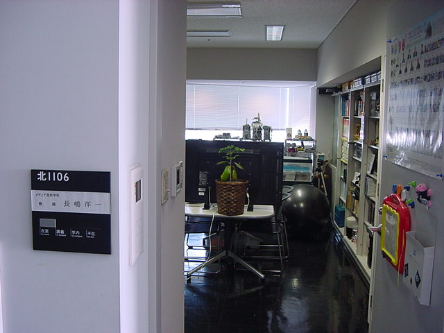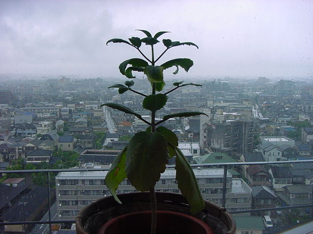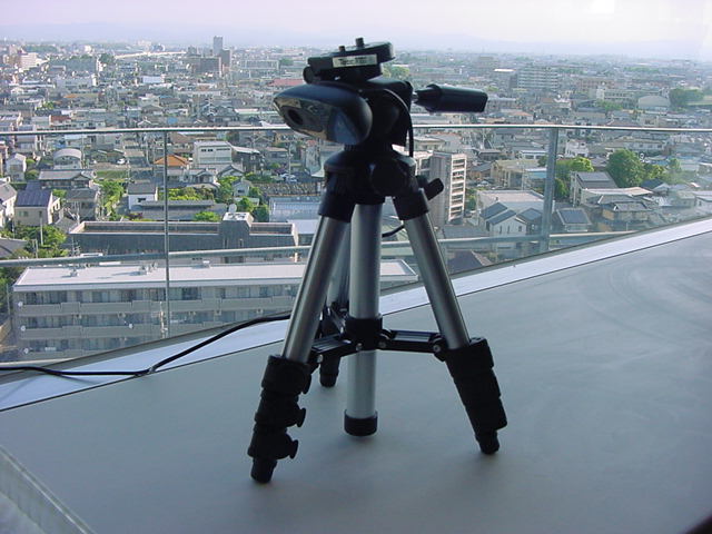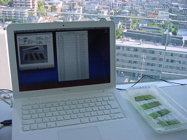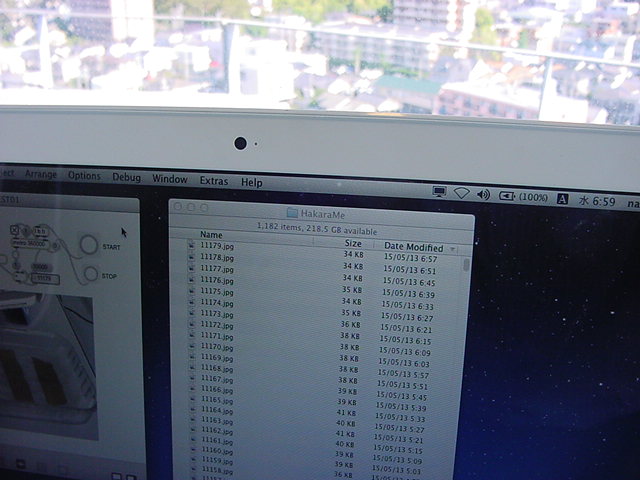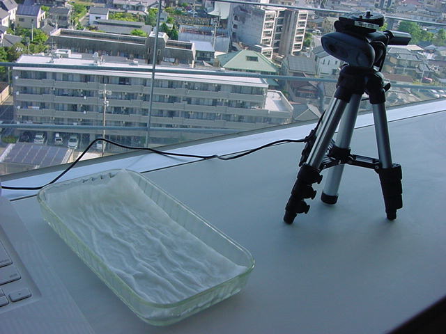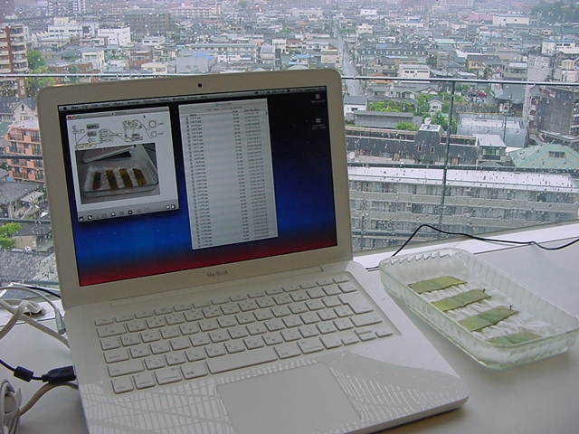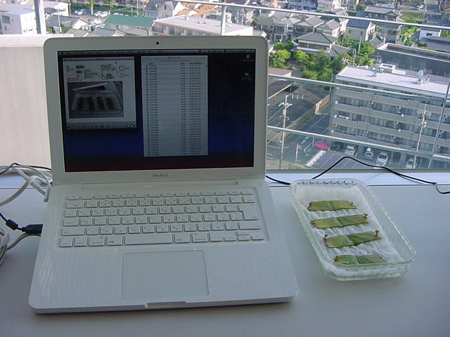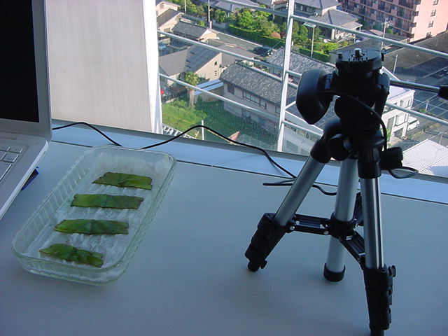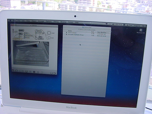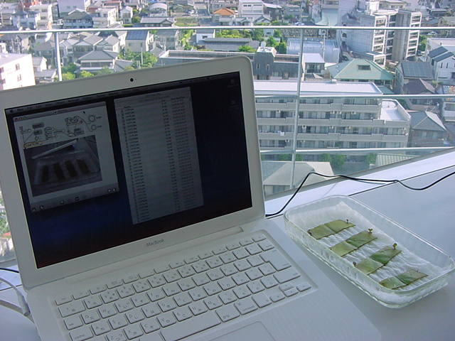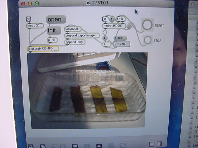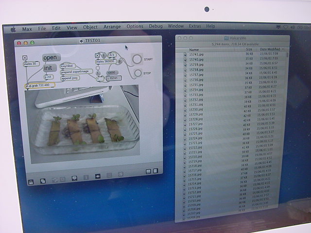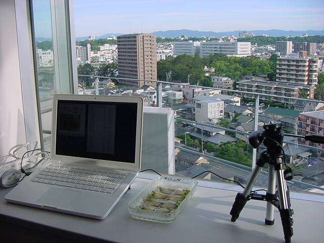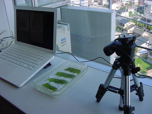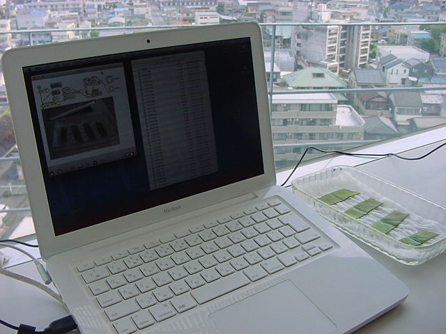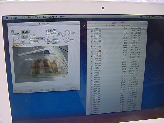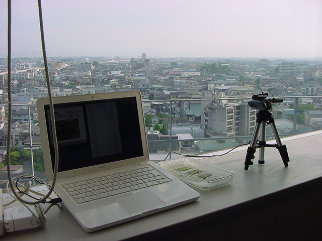 ・・・そしてそれから1年ちょっと、南国の植物なのに浜松の寒風にも耐えて、幅1cm程に切って濡れティッシュの上に置かれた葉っぱから芽が出て茎が伸びて、ベランダのプランターで元気に育ったうちの1本を、 研究室に持ってきた のですが、ここで再び「葉から芽」をやってみよう、と思い立ちました。思い付いたもう一つの理由は、いま書いている Xcode日記 に関係します。 新学期となって、新2回生が「サウンドデザイン」で新たに触れる、あるいは新3回生が「音楽情報科学」でさらに深める、 Max を使って、久しぶりに「 定点観測 」をしようかな、と思い立ったのです。 ただし、これまでの定点観測(ストップモーションアニメーション作成Maxパッチ)は、15秒に1枚の静止画を自動撮影するものでしたが、葉から芽では人間のように動かないので、Maxパッチを「360秒に1枚」と変更しました。 6分ごとに1枚、つまり1時間で10コマ、1日(24時間)で240コマとなり、繋げたムービーを24fpsで再生すると「1日が10秒」となります。 以下はその初日、研究室の窓際にシステムを設置して準備した模様です(写真は180秒ですが後で360秒に変更)。 果たしてうまく行くかどうか、乞う御期待。