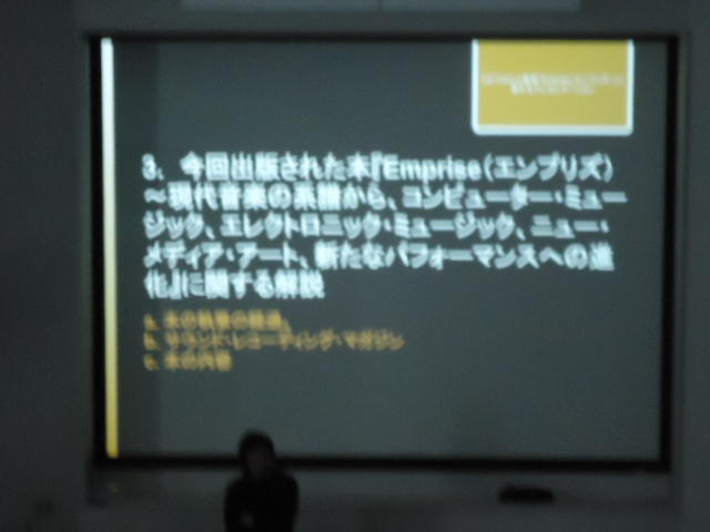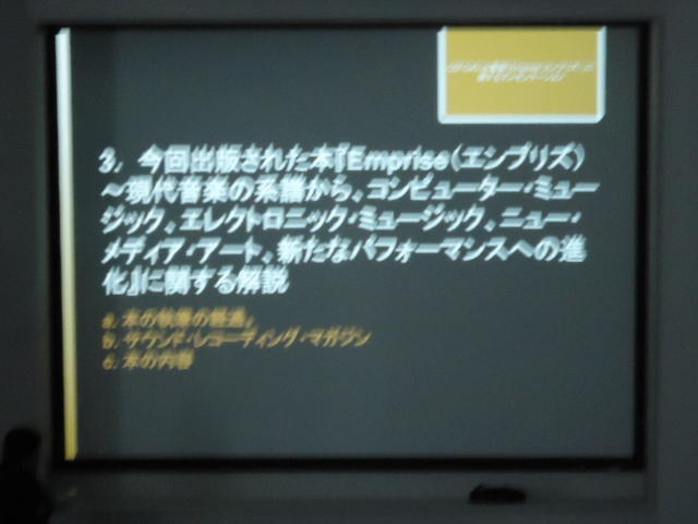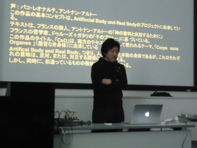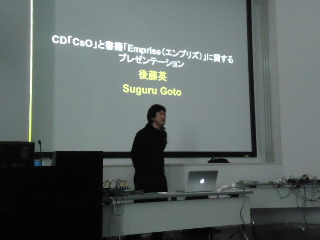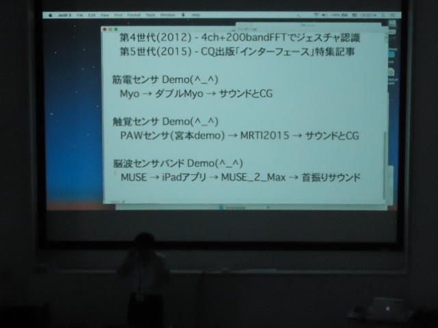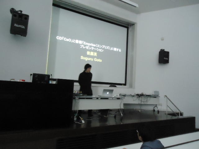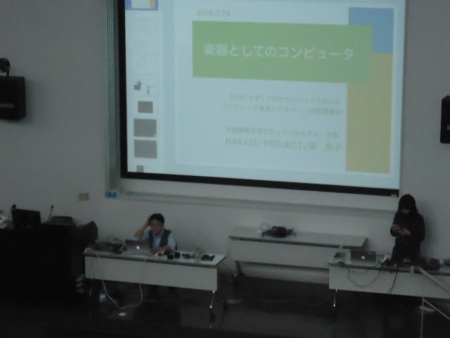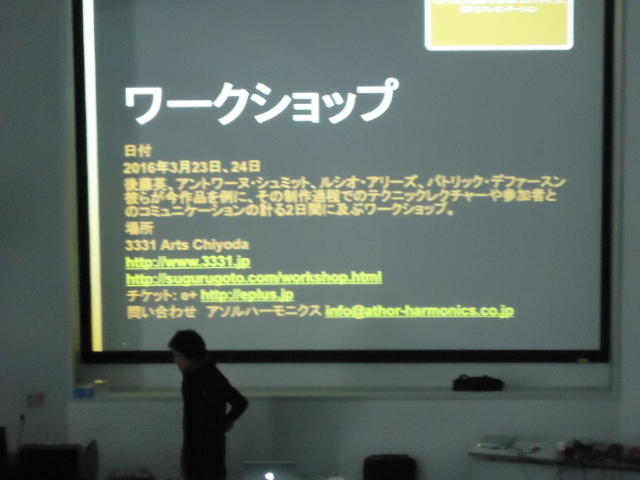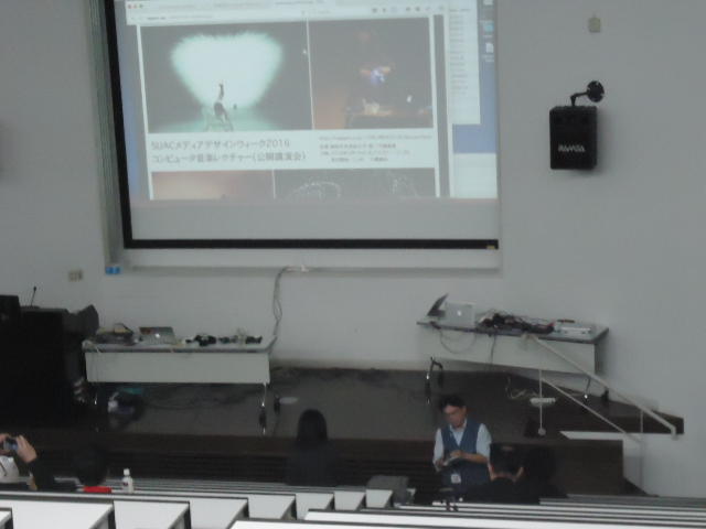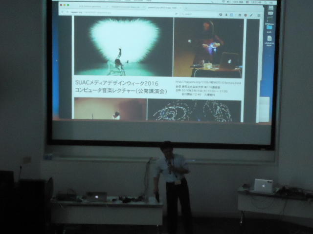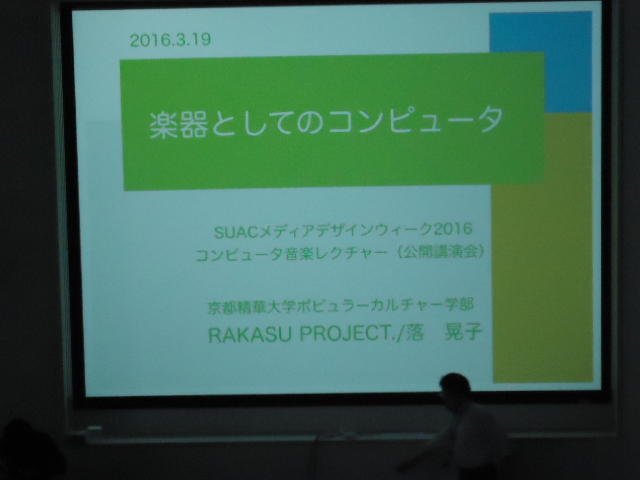 SUACメディアデザインウィーク2016 コンピュータ音楽レクチャー(公開講演会) 2016.03.19 フォトレポート 2016年2月 長嶋洋一 参加募集 カメラ1 カメラ2 ビデオ記録 ※カメラのバッテリ切れや操作ミスなどにより尻切れだったり色々と不備があります事をお詫びいたします(_o_) その1 (長嶋) その2 (長嶋) その3 (RAKASU PROJECT.) その4 (RAKASU PROJECT.) その5 (後藤英) 打上げ