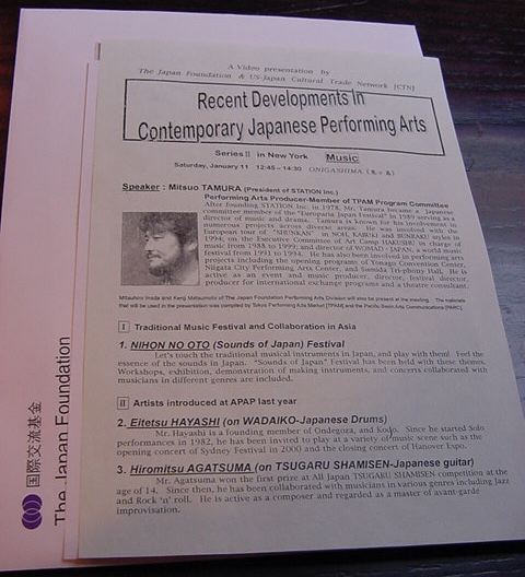 ★ ★ ★ ★ ★ ★ ★ ★ ★ ★ ★ ★ ★ ★ ★ ★ ★ ★ ★ ★ ★ ★ ★ ★ ★ ★ ★ ★ ★ ★ ★ ★ ★ ★ ★ ★ ★ ★ ★ ★ ★ ★ ★ ★ ★ ★ ★ ★ ★ ★ ★ ★ ★ ★ ★ ★ ★ ★ ★ ★ ★ ★ ★ ★ ★ ★ ★ ★ ★ ★ ★ ★ ★ ★ ★ ★ ★ ★ ★ ★ ★ ★ ★ ★ ★ ★ ★ ★ ★ ★ ★ ★ ★ ★ ★ ★ ★ ★ ★ ★ ★ ★ ★ ★ ★ ★ ★ ★ ★ ★ ★ ★ ★ ★ ★ ★ ★ ★ ★ ★ ★ ★ ★ ★ ★ ★ ★ ★ ★ ★ ★ ★ ★ ★ ★ ★ ★ ★ ★ ★ ★ ★ ★ ★ ★ ★ ★ ★ ★ ★ ★ ★ ★ ★ ★ ★ ★ ★ ★ ★ ★ ★ ★ ★ ★ ★ ★ ★ ★ ★ ★ ★ ★ ★ ★ ★ ★ この「鬼が島」でのプレゼンは、実は2日後に国際交流基金 (Japan Foundation : 僕の2年前の渡欧ツアーでもお世話になり ました)の企画として行う、東野さんによる雅楽ショーケースのPRも 兼ねています。そこで、この日はNYのJapan Society(こちらは 外務省管轄?)に行き、現場の視察と、東野さんが日本から送った Kymaの動作確認をしました。この日は一日、チタニウムを背負って 移動していたのですが、KymaのデータをCDRから読み込んで 東野さんのリブレットに移す、という作業で役立ち、重い思いを した甲斐がありました。 ★ ★ ★ ★ ★ ★ ★ ★ ★ ★ ★ ★ ★ ★ ★ ★ ★ ★ ★ ★ ★ ★ ★ ★ ★ ★ ★ ★ ★ ★ ★ ★ ★ ★ ★ ★ ★ ★ ★ ★ ★ ★ ★ ★ ★ ★ ★ ★ ★ ★ ★