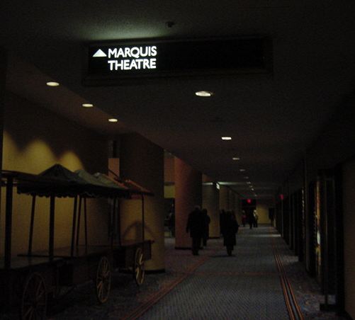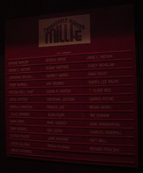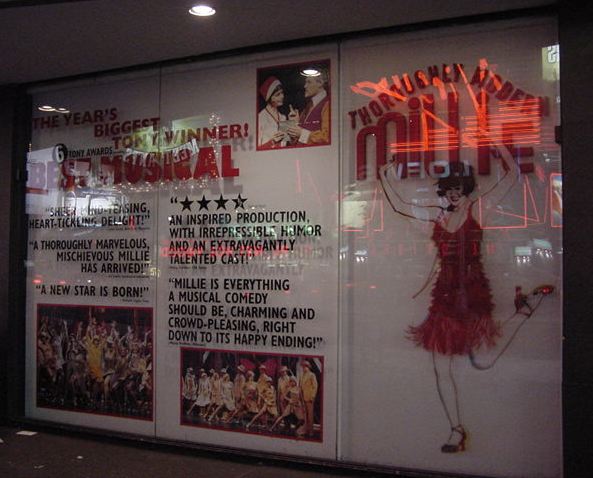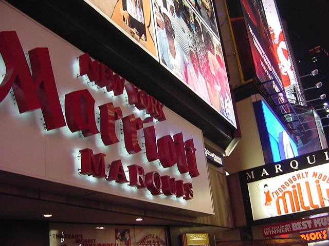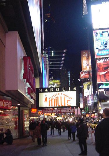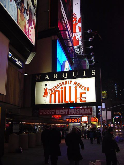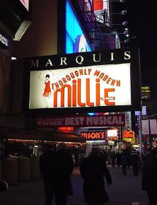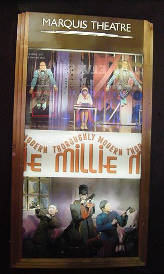 ★ ★ ★ ★ ★ ★ ★ ★ ★ ★ ★ ★ ★ ★ ★ ★ ★ ★ ★ ★ ★ ★ ★ ホテルに戻って、上の部分までの写真と解説を整理していると、 もう18:30になりました。いよいよNY最後の晩のミュージカル、 「Throughly Modern Millie」です。 並べてみれば このように 壮観な8日間の9本だったわけですが、そのラストです。 泊まっていたホテルは47thと46thにまたがっていますが、 その46thと45thにあるMarriotホテルの中にあるシアターが 会場でした。既に看板は前夜に撮っていたので、出入り部分だけの 写真で恐縮です。 「Throughly Modern Millie」はコメディ・ミュージカルと いうことでした(後述)。しかし、これまた最後にキュンとさせられる 優れたラヴコメディで、会場は見入ったり笑ったり、と盛り上がりました。 演出の一端として字幕ボードが出てくるのですが、ここに中国語で 「我母親」などと出ながら "My Mother !" と歌っているのを見る、と いうのは不思議な気分でした。 ★ ★ ★ ★ ★ ★ ★ ★ ★ ★ ★ ★ ★ ★ ★ ★ ★ ★
