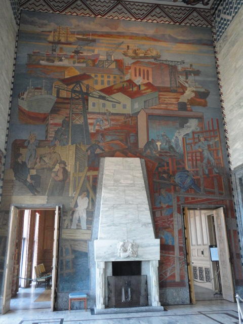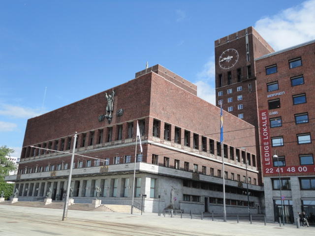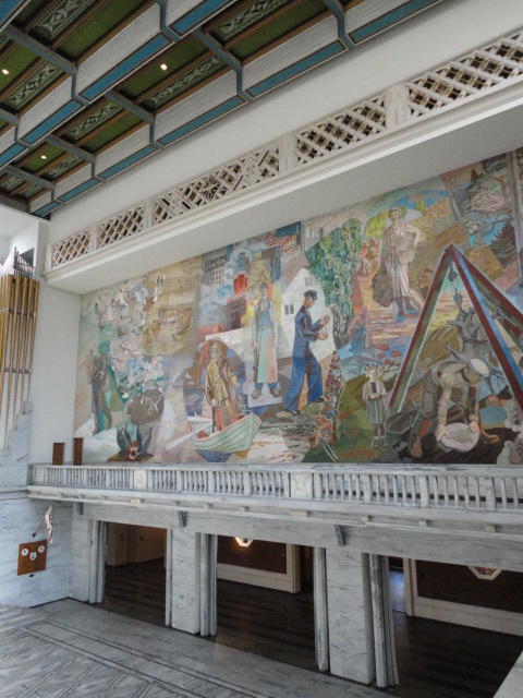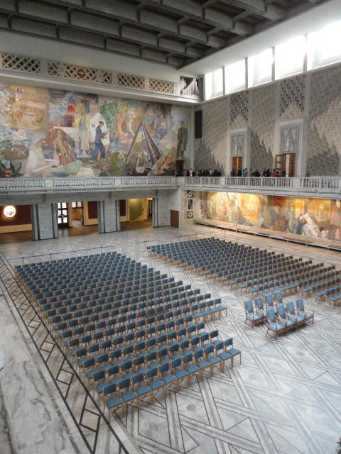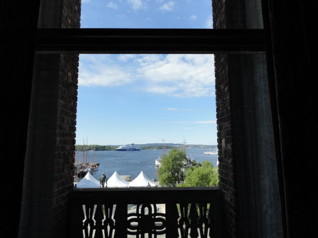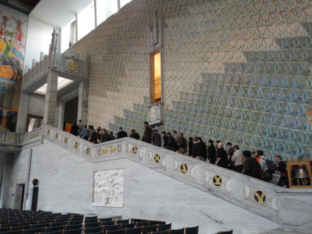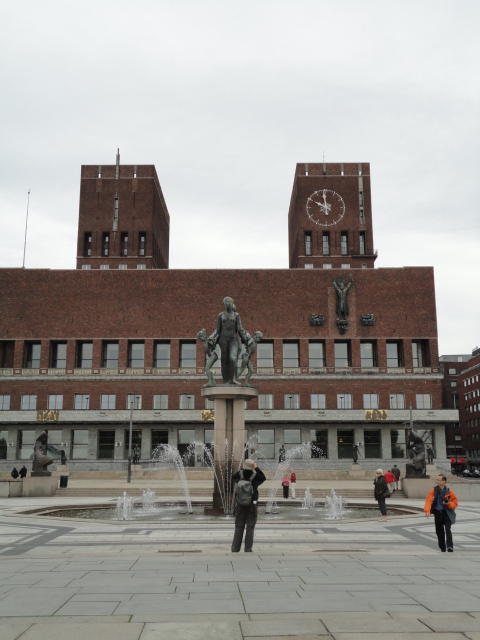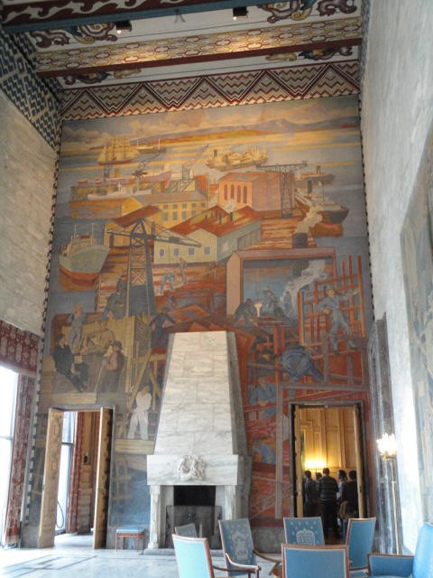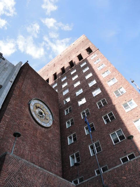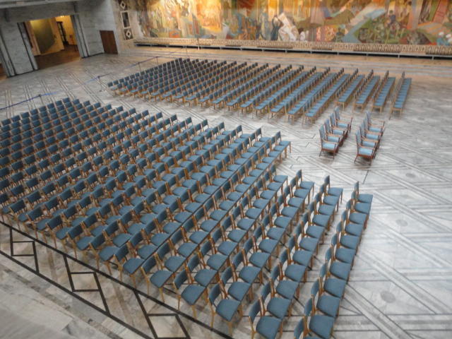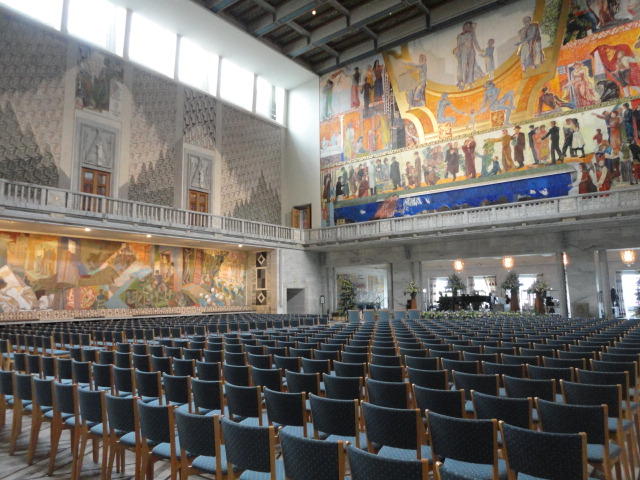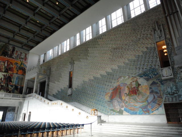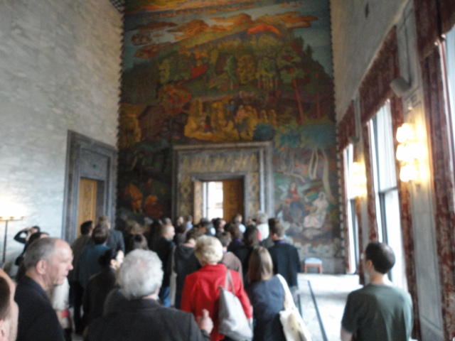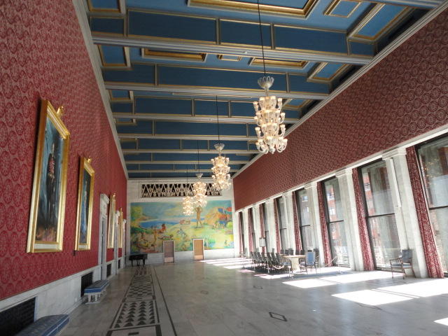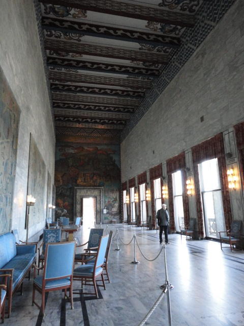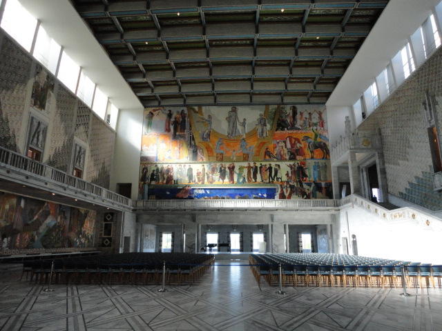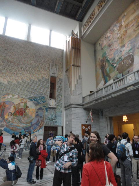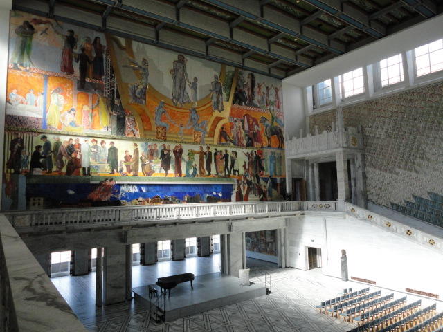 この日は午後からいよいよNIME2011のレジストレーションなどが始まるので、 天気のいい朝イチから、フルに活動しました。 まずは前日にも行ったオスロ市庁舎に行き、ノーベル平和賞の授賞式会場でもあるホール、 さらに誰でも入場(無料)できるエリアを見て回りました。 午前中から観光客でごった返す場所ですが、まだ朝イチ(9時過ぎ)ということで、 たった一人で素晴らしい空間を堪能しました。
