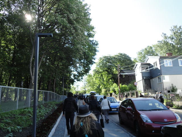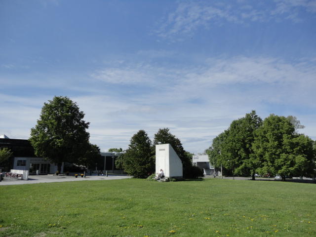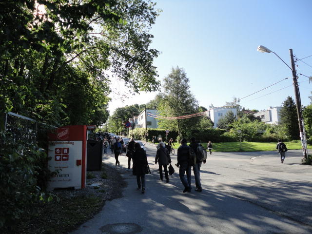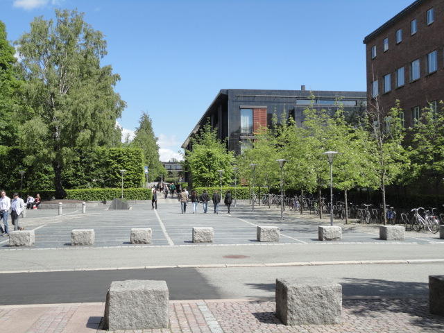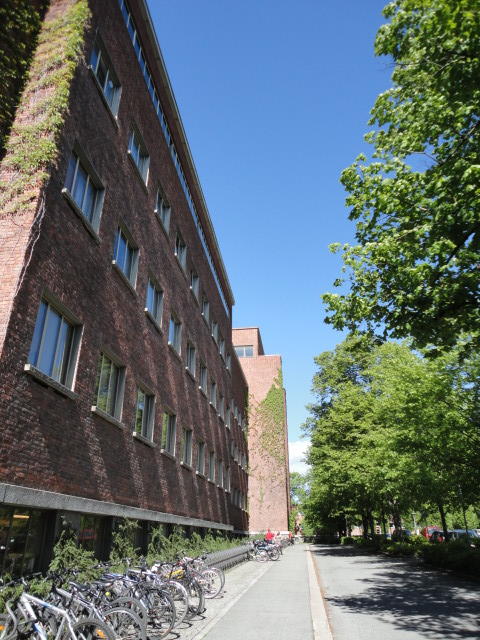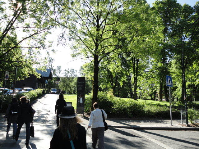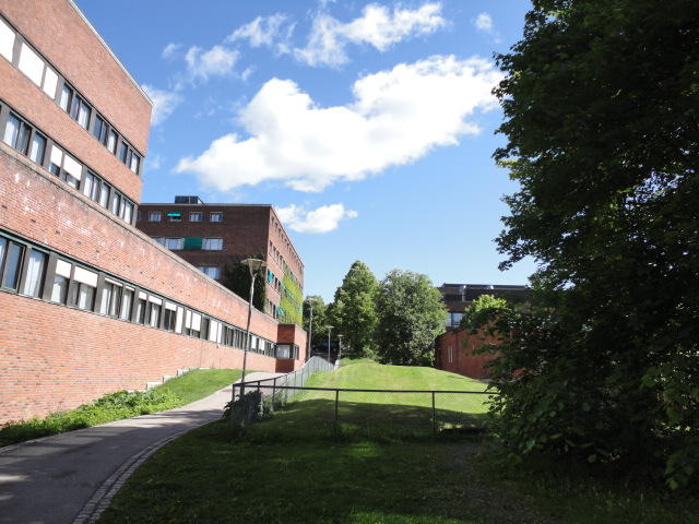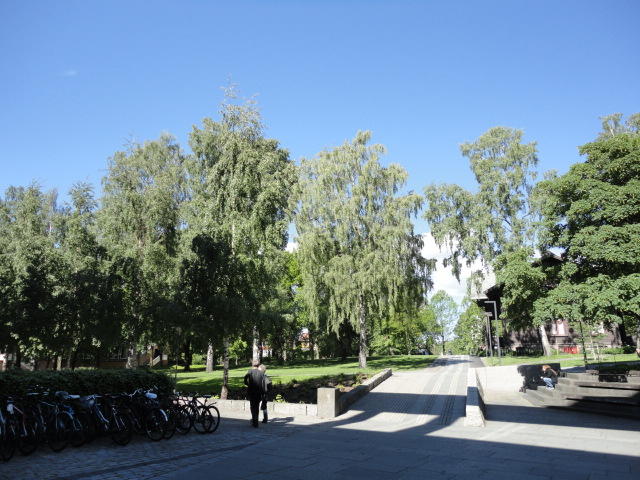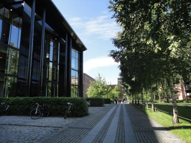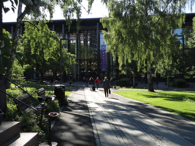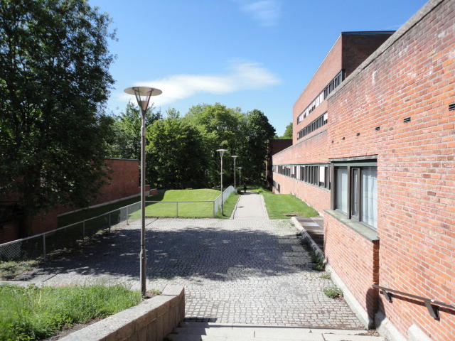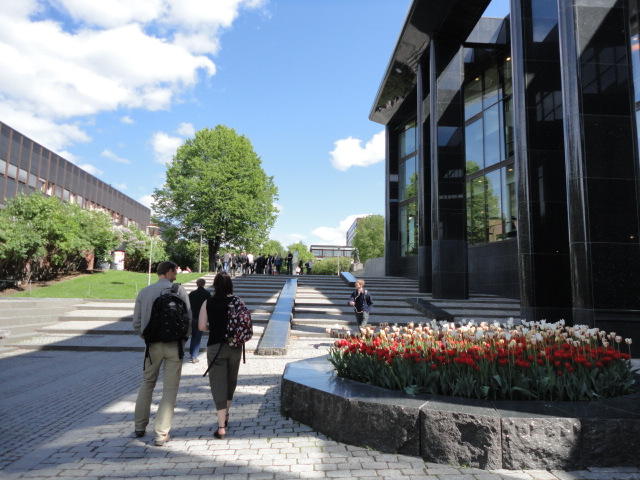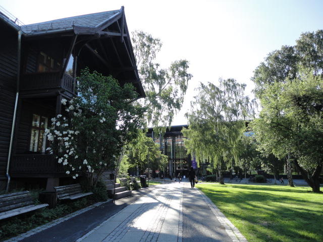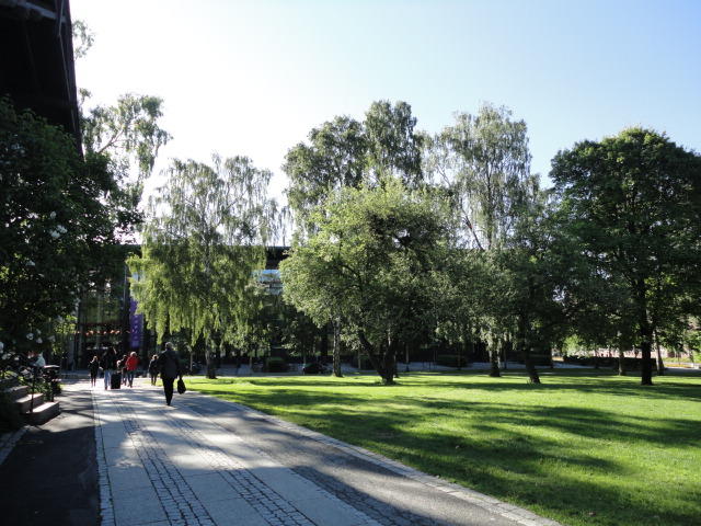 オスロ大学図書館は、メトロでは「Blindern」という駅から徒歩5分ほどです。 そしてコンサートセッション会場のNorwegian Academy of MusicとChateau Neufは向かい合った建物で、 メトロでは隣りの「Majorstuen」という駅から徒歩5分ほどです。 しかし両者はオスロ大学キャンパスの中にあるので、駅までの距離を考えると、 直接に歩いての移動でも10分ほどで変わりません。 この日はいい天気だったので、のんびりと歩いて、リハーサル会場のChateau Neufに移動しました。