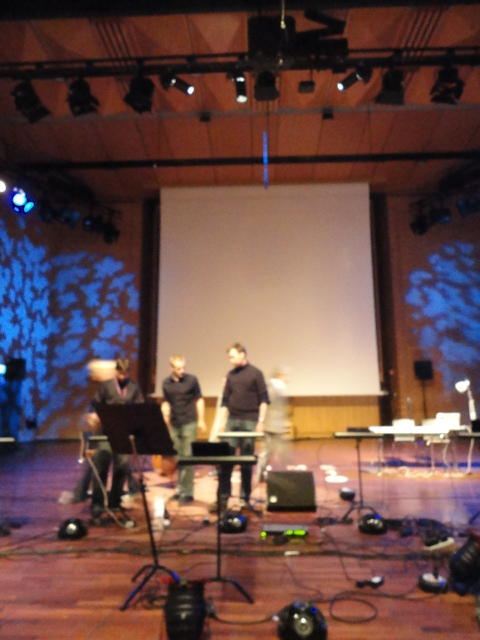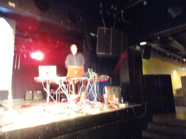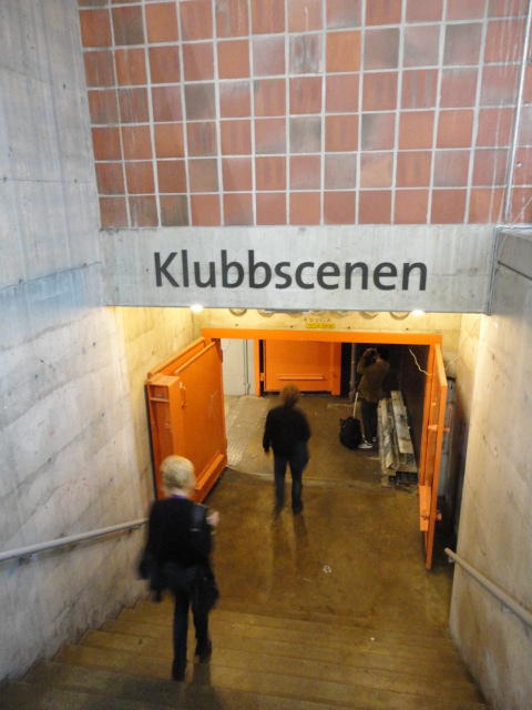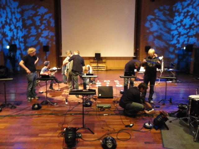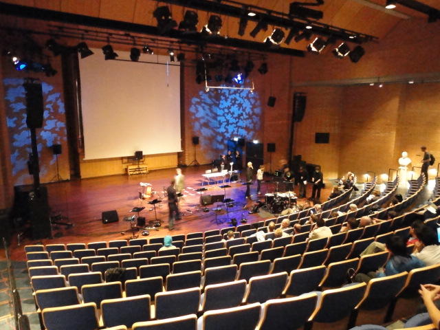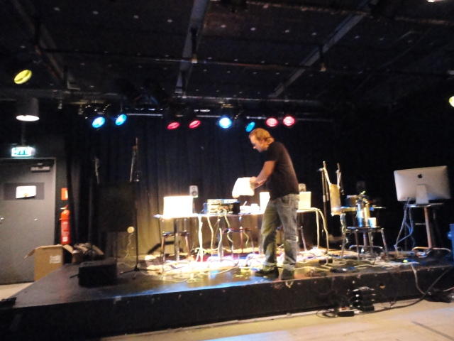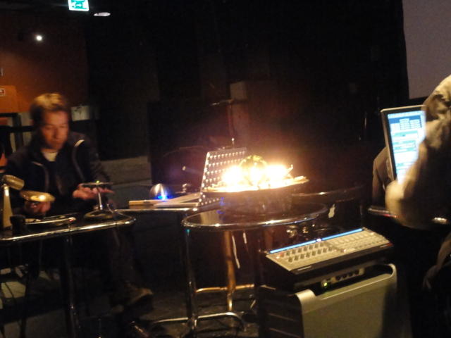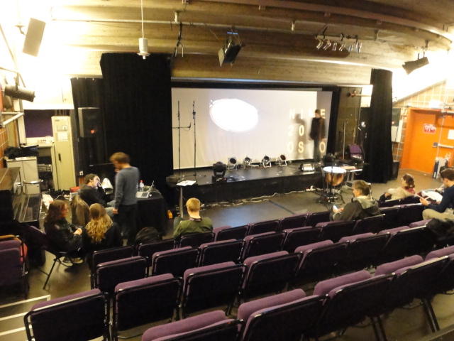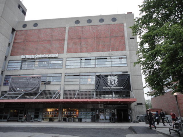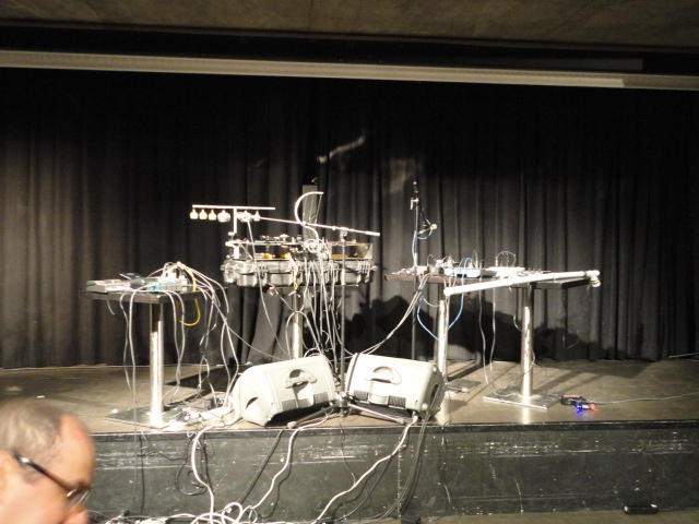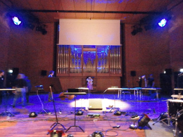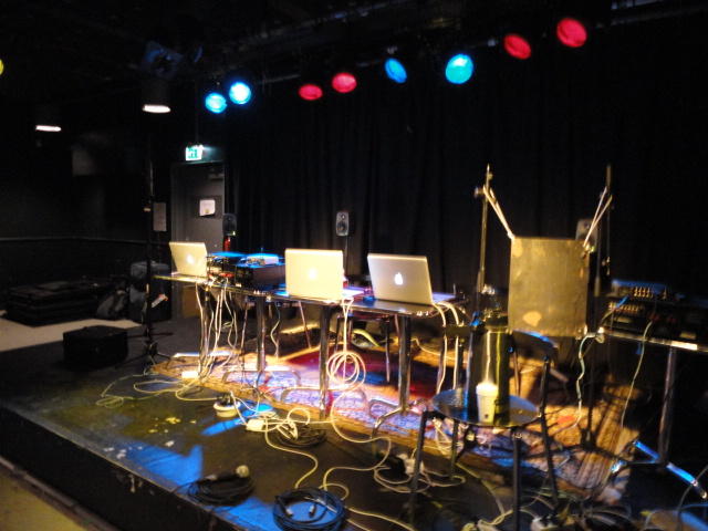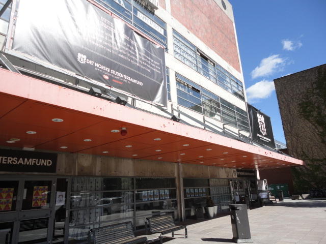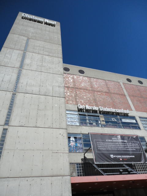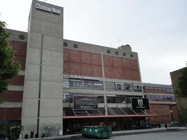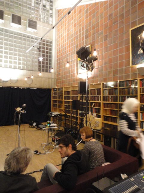 Chateau Neufというのはオスロ大学のStudent House(学生会館?)で、中にはサークル関係、 パブなどがあり、ホール、ライブスペースなども多数ありました。 過去にはセックスピストルズのライヴとかもあった名門らしいです。 ここでセンサをセッティングして(2回生には講義の中で見せましたよね?)、 リハを無事に済ませました。 テンションを残しておくために、サウンドチェックの後では、通しリハをたった1度だけです。 リハを終えると、再びキャンパス内を図書館に戻り、ランチブレークに入っていたので、カフェで休憩しました。