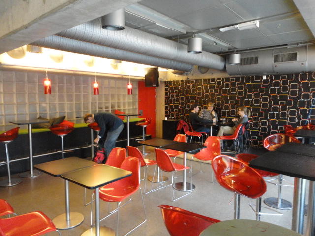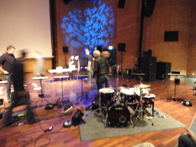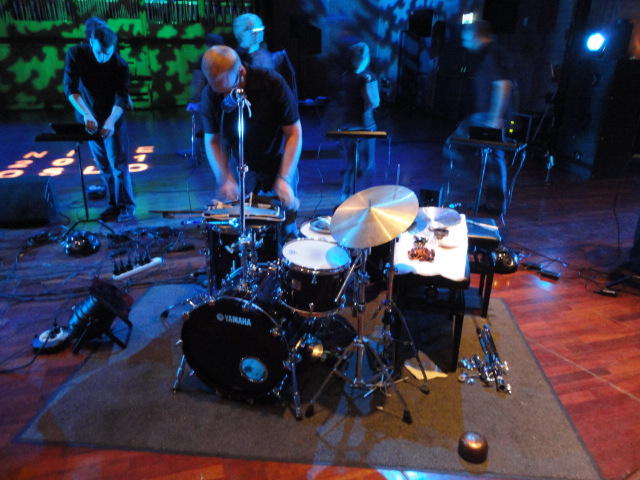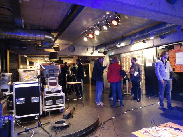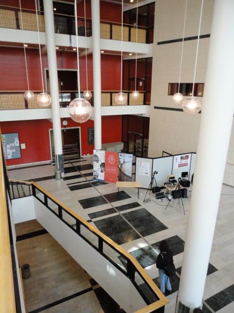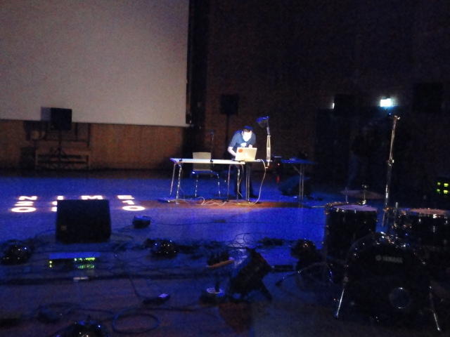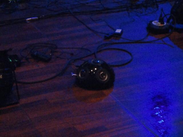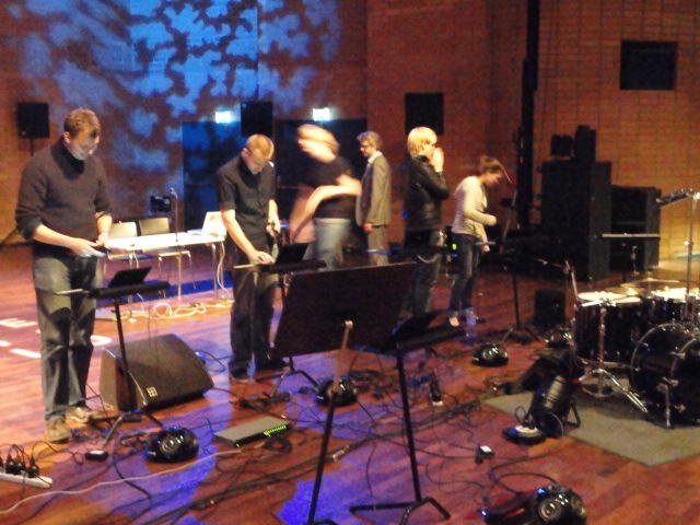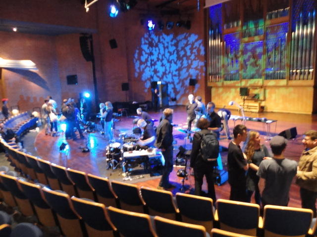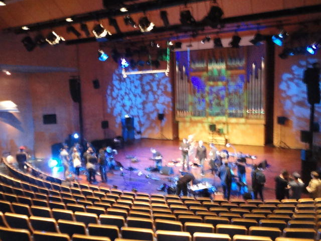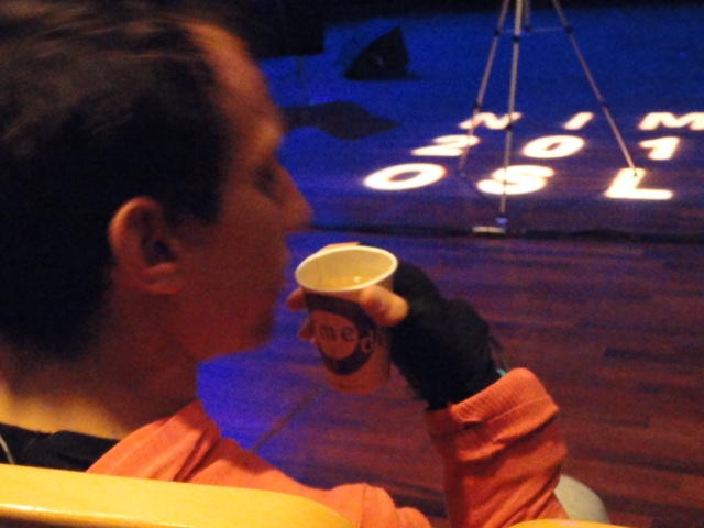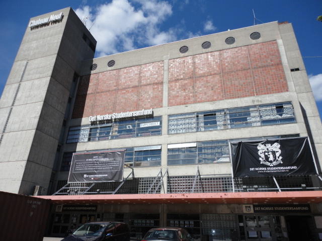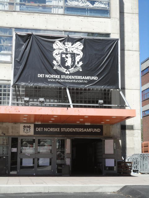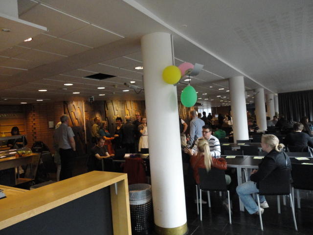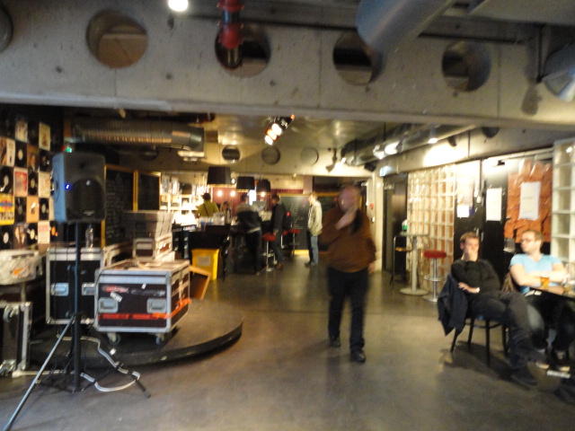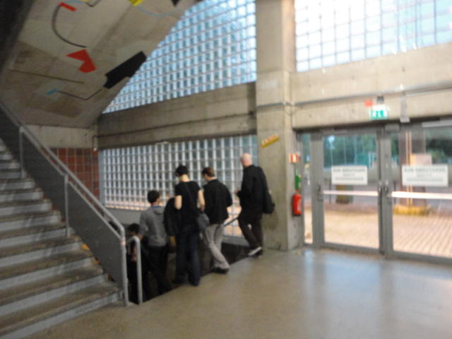 Chateau Neufというのはオスロ大学のStudent House(学生会館?)で、中にはサークル関係、 パブなどがあり、ホール、ライブスペースなども多数ありました。 過去にはセックスピストルズのライヴとかもあった名門らしいです。 ここでセンサをセッティングして(2回生には講義の中で見せましたよね?)、 リハを無事に済ませました。 テンションを残しておくために、サウンドチェックの後では、通しリハをたった1度だけです。 リハを終えると、再びキャンパス内を図書館に戻り、ランチブレークに入っていたので、カフェで休憩しました。