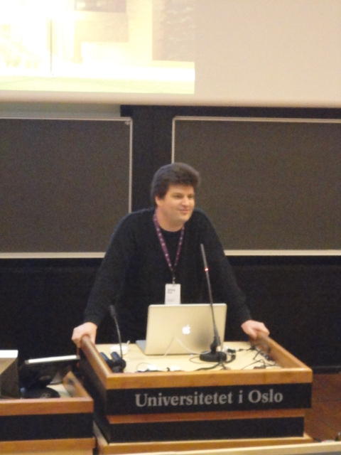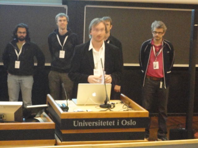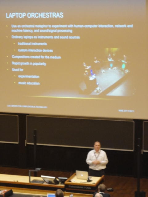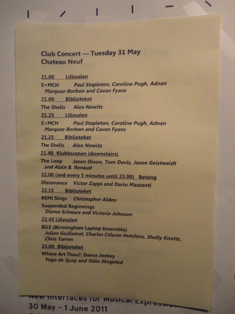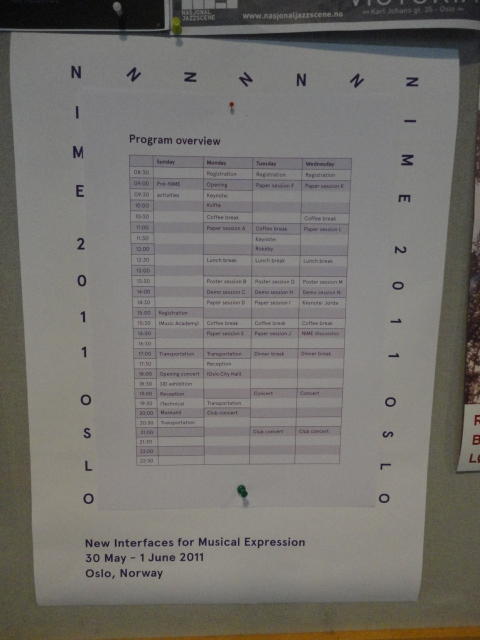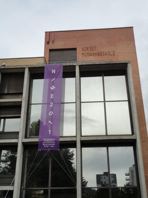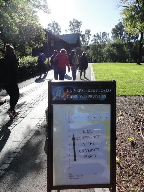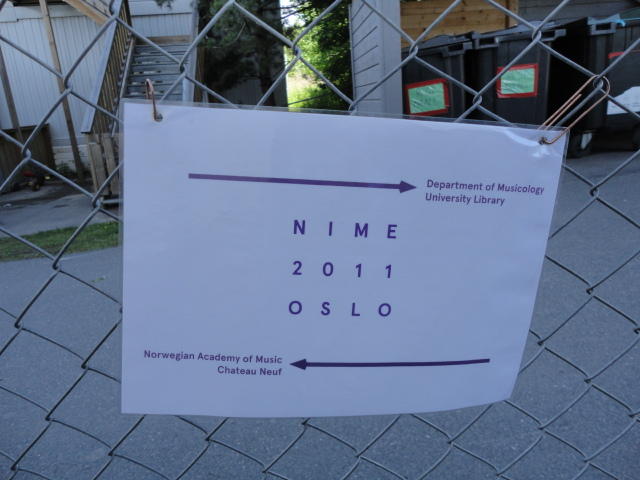 毎日、朝9時にスタートして、晩のコンサートが終わるのは24時あたり、という3日間が始まりました。 月曜日の午前はOpeningとKeynoteとPaperです。 ただし僕は、晩のコンサートのセッティングとリハーサルが「11-13時」と予定されていたので、 Keynoteまでで退出しました。Opening Session ― Monday 30 May 09:00-09:30 Auditorium 1, University Library Einar Lie, Research Dean, Faculty of Humanities, University of Oslo Eirik Birkeland, Principal, Norwegian Academy of Music Alexander Refsum Jensenius, Chair, NIME 2011 Keynote Lecture 1 ― Monday 30 May 09:30-10:30 Auditorium 1, University Library Musical Instrument User Interfaces: the Digital Background of the Analog Revolution Tellef Kvifte Paper session A ― Monday 30 May 11:00-12:30 Auditorium 1, University Library The Overtone Fiddle: an Actuated Acoustic Instrument Dan Overholt A Low-Cost, Low-Latency Multi-Touch Table with Haptic Feedback for Mu- sical Applications Colby Leider, Matthew Montag, Stefan Sullivan and Scott Dickey The Electromagnetically Sustained Rhodes Piano Greg Shear and Matthew Wright Gamelan Elek Trika: An Electronic Balinese Gamelan Laurel Pardue, Christine Southworth, Andrew Boch, Matt Boch and Alex Rigop- ulos Sonicstrument: A Musical Interface with Stereotypical Acoustic Transducers Jeong-Seob Lee and Woon Seung Yeo★ ★ ★ ★ ★ ★ ★ ★ ★ ★ ★ ★ ★ ★ ★ ★ ★ ★ ★キャンパス内をChateay Neufに移動