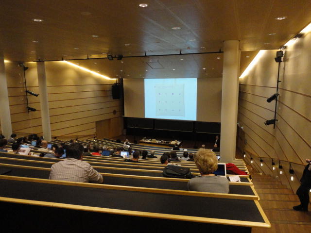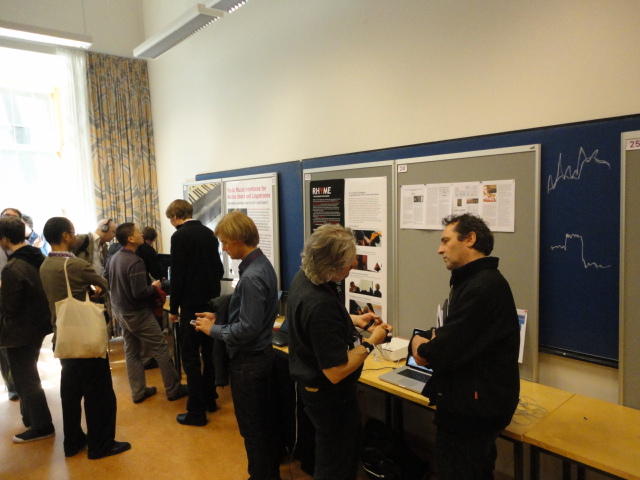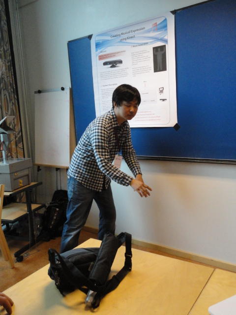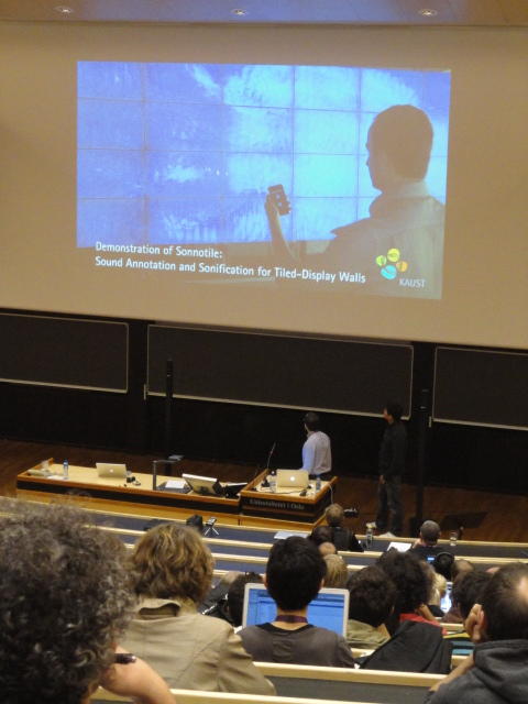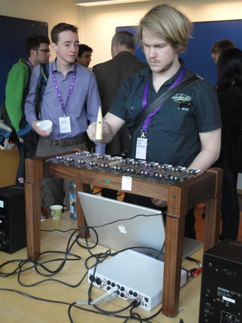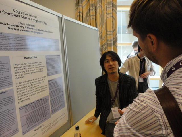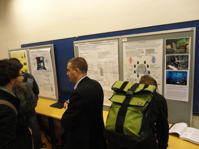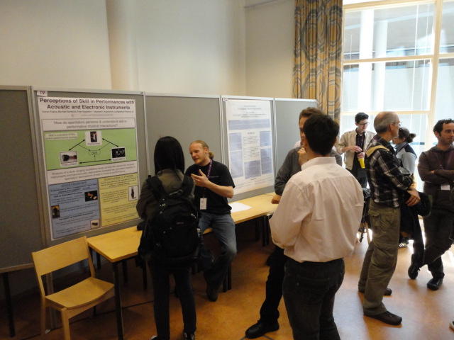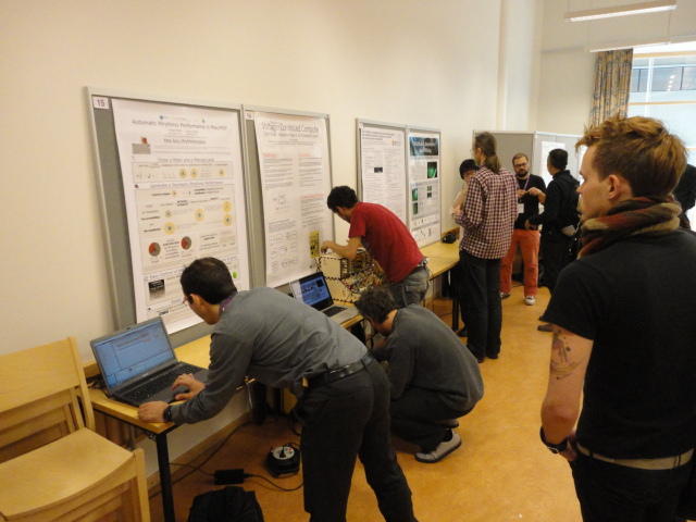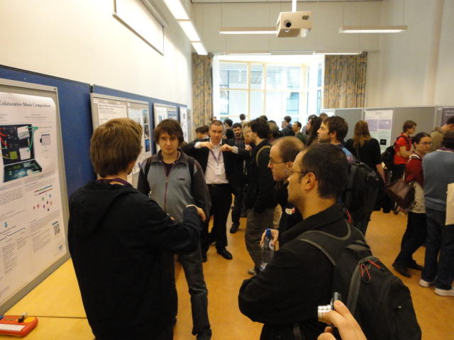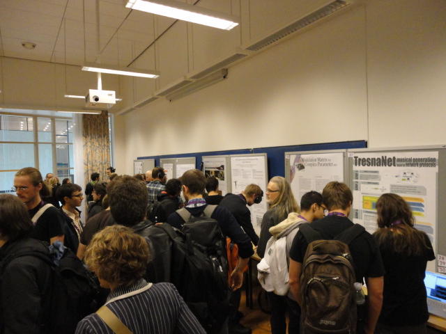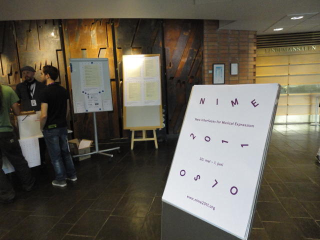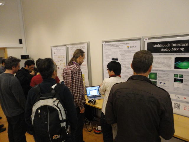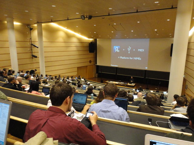 2日目午後の前半は、またPoster/Demoセッションです。 今回のNIMEは欧州開催ということで、ヨーロッパの多くの研究者の応募が集まり(500本以上)、 採択件数を多くするために、ポスターがこれまでにない規模に増えていました。Poster session G ― Tuesday 31 May 13:30-14:30 3rd floor, University Library Audio Arduino ― an ALSA (Advanced Linux Sound Architecture) audio driver for FTDI-based Arduinos Smilen Dimitrov and Stefania Serafin Musical control of a pipe based on acoustic resonance Seunghun Kim and Woon Seung Yeo Play Fluency in Music Improvisation Games for Novices Anne-Marie Hansen, Hans Jorgen Andersen and Pirkko Raudaskoski The Bass Sleeve: A Real-time Multimedia Gestural Controller for Augmented Electric Bass Performance Izzi Ramkissoon The KarmetiK NotomotoN: A New Breed of Musical Robot for Teaching and Performance Ajay Kapur, Michael Darling, James Murphy, Jordan Hochenbaum, Dimitri Di- akopoulos and Trimpin The Manipuller: Strings Manipulation and Multi-Dimensional Force Sensing Adrian Barenca Aliaga and Giuseppe Torre Mapping Objects with the Surface Editor Alain Crevoisier and Cecile Picard-Limpens Adding Z-Depth and Pressure Expressivity to Tangible Tabletop Surfaces Jordan Hochenbaum and Ajay Kapur Hex Player: A Virtual Musical Controller Andrew Milne, Anna Xambo, Robin Laney, David B. Sharp, Anthony Prechtl and Simon Holland Rhythm Performance from a Spectral Point of View Carl Haakon Waadeland Nuvolet : 3D gesture-driven collaborative audio mosaicing Josep M Comajuncosas, Enric Guaus, Alex Barrachina and John O'Connell Effective and expressive movements in a French-Canadian fiddler's perfor- mance Erwin Schoonderwaldt and Alexander Refsum Jensenius Flowspace: A Hybrid Ecosystem Daniel Bisig, Jan Schacher and Martin Neukom Implementing a Finite Difference-Based Real-time Sound Synthesizer using GPUs Marc Sosnick and William Hsu An Artificial Intelligence Architecture for Musical Expressiveness that Learns by Imitation Axel Tidemann TweetDreams: Making music with the audience and the world using real- time Twitter data Jorge Herrera, Carr Wilkerson and Luke Dahl JunctionBox: A Toolkit for Creating Multi-touch Sound Control Interfaces Lawrence Fyfe, Adam Tindale and Sheelagh Carpendale Beyond Evaluation: Linking Practice and Theory in New Musical Interface Design Andrew Johnston Intuitive Real-Time Control of Spectral Model Synthesis Phillip Popp and Matthew Wright BeatJockey: A new tool for enhancing DJ skills Pablo Molina, Martin Haro and Sergi Jorda` Traces: Body, Motion and Sound Jan Schacher and Angela Stoecklin MoodMixer: EEG-based Collaborative Sonification Grace Leslie and Tim Mullen OSC Implementation and Evaluation of the Xsens MVN suit Stale A. Skogstad, Kristian Nymoen, Yago De Quay and Alexander Refsum Jensenius The effect of visualizing audio targets in a musical listening and performance task Lonce Wyse, Norikazu Mitani and Suranga Nanayakkara Composability for Musical Gesture Signal Processing using new OSC-based Object and Functional Programming Extensions to Max/MSP Freed Adrian, John Maccallum and Andrew Schmeder SoundSaber ― A Motion Capture Instrument Kristian Nymoen, Stale A. Skogstad and Alexander Refsum Jensenius A modulation matrix for complex parameter sets Oyvind Brandtsegg, Sigurd Saue and Thom Johansen Demo session H ― Tuesday 31 May 13:30-14:30 3rd floor, University Library Sound Low Fun Yu-Chung Tseng, Che-Wei Liu, Tzu-Heng Chi and Hui-Yu Wang Autonomous New Media Artefacts (AutoNMA) Edgar Berdahl and Chris Chafe Creating Musical Expression using Kinect Min-Joon Yoo, Jin-Wook Beak and In-Kwon Lee Making grains tangible: microtouch for microsound Staas De Jong Sound Selection by Gestures Baptiste Caramiaux, Frederic Bevilacqua and Norbert Schnell★ ★ ★ ★ ★ ★ ★ ★ ★ ★ ★ ★ ★ ★ ★ ★Paper Session (3)