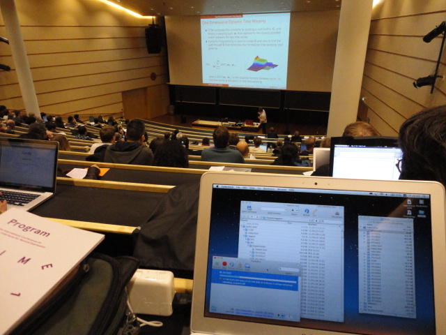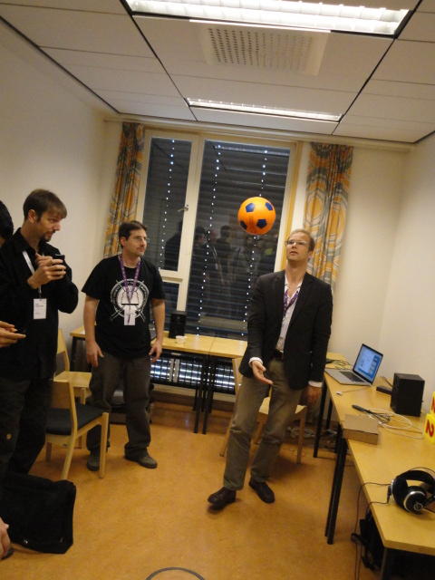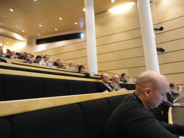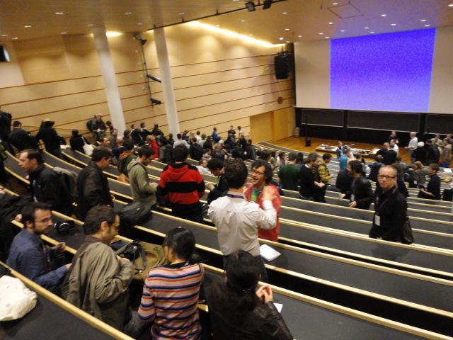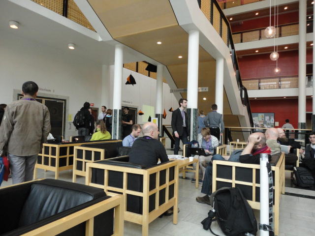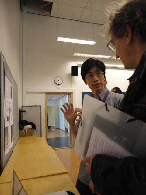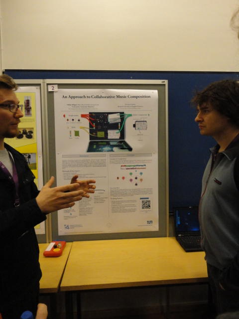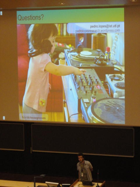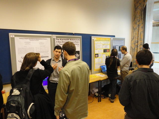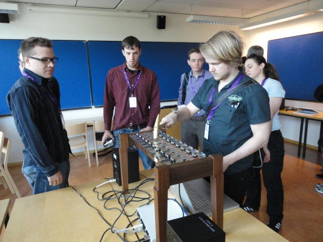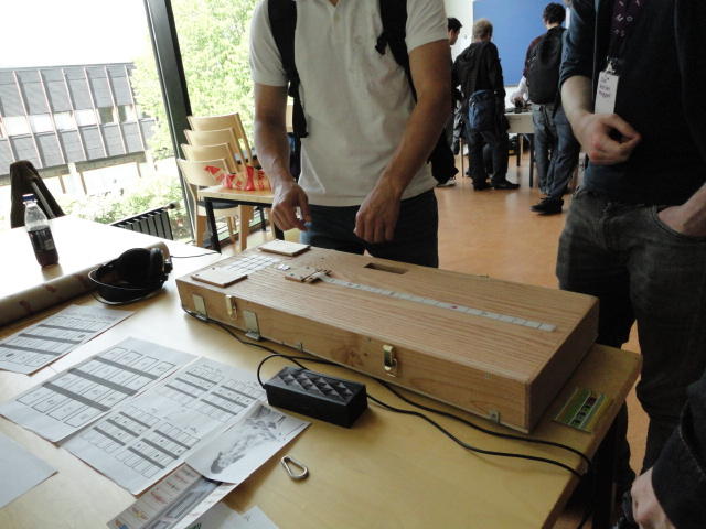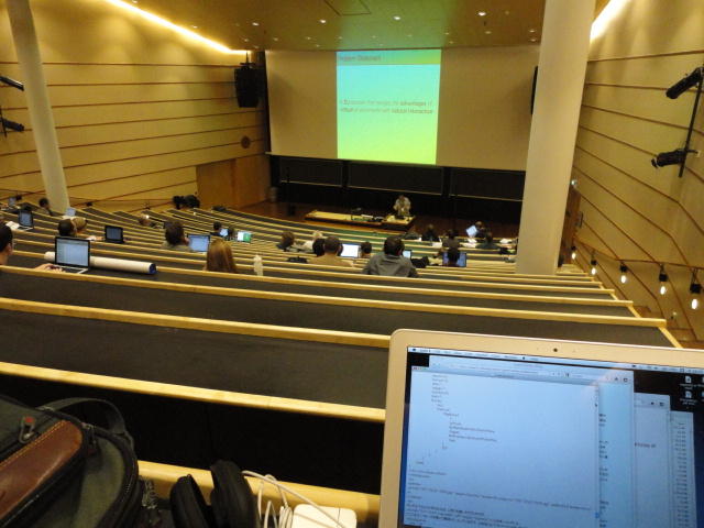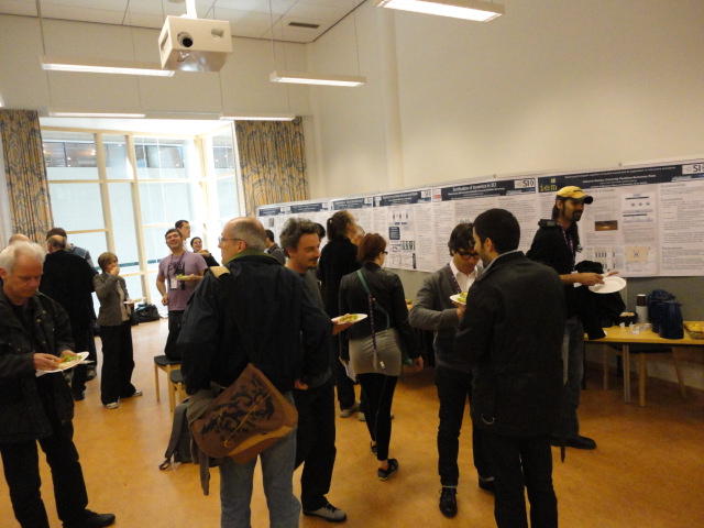 2日目午後の前半は、またPoster/Demoセッションです。 今回のNIMEは欧州開催ということで、ヨーロッパの多くの研究者の応募が集まり(500本以上)、 採択件数を多くするために、ポスターがこれまでにない規模に増えていました。Poster session G ― Tuesday 31 May 13:30-14:30 3rd floor, University Library Audio Arduino ― an ALSA (Advanced Linux Sound Architecture) audio driver for FTDI-based Arduinos Smilen Dimitrov and Stefania Serafin Musical control of a pipe based on acoustic resonance Seunghun Kim and Woon Seung Yeo Play Fluency in Music Improvisation Games for Novices Anne-Marie Hansen, Hans Jorgen Andersen and Pirkko Raudaskoski The Bass Sleeve: A Real-time Multimedia Gestural Controller for Augmented Electric Bass Performance Izzi Ramkissoon The KarmetiK NotomotoN: A New Breed of Musical Robot for Teaching and Performance Ajay Kapur, Michael Darling, James Murphy, Jordan Hochenbaum, Dimitri Di- akopoulos and Trimpin The Manipuller: Strings Manipulation and Multi-Dimensional Force Sensing Adrian Barenca Aliaga and Giuseppe Torre Mapping Objects with the Surface Editor Alain Crevoisier and Cecile Picard-Limpens Adding Z-Depth and Pressure Expressivity to Tangible Tabletop Surfaces Jordan Hochenbaum and Ajay Kapur Hex Player: A Virtual Musical Controller Andrew Milne, Anna Xambo, Robin Laney, David B. Sharp, Anthony Prechtl and Simon Holland Rhythm Performance from a Spectral Point of View Carl Haakon Waadeland Nuvolet : 3D gesture-driven collaborative audio mosaicing Josep M Comajuncosas, Enric Guaus, Alex Barrachina and John O'Connell Effective and expressive movements in a French-Canadian fiddler's perfor- mance Erwin Schoonderwaldt and Alexander Refsum Jensenius Flowspace: A Hybrid Ecosystem Daniel Bisig, Jan Schacher and Martin Neukom Implementing a Finite Difference-Based Real-time Sound Synthesizer using GPUs Marc Sosnick and William Hsu An Artificial Intelligence Architecture for Musical Expressiveness that Learns by Imitation Axel Tidemann TweetDreams: Making music with the audience and the world using real- time Twitter data Jorge Herrera, Carr Wilkerson and Luke Dahl JunctionBox: A Toolkit for Creating Multi-touch Sound Control Interfaces Lawrence Fyfe, Adam Tindale and Sheelagh Carpendale Beyond Evaluation: Linking Practice and Theory in New Musical Interface Design Andrew Johnston Intuitive Real-Time Control of Spectral Model Synthesis Phillip Popp and Matthew Wright BeatJockey: A new tool for enhancing DJ skills Pablo Molina, Martin Haro and Sergi Jorda` Traces: Body, Motion and Sound Jan Schacher and Angela Stoecklin MoodMixer: EEG-based Collaborative Sonification Grace Leslie and Tim Mullen OSC Implementation and Evaluation of the Xsens MVN suit Stale A. Skogstad, Kristian Nymoen, Yago De Quay and Alexander Refsum Jensenius The effect of visualizing audio targets in a musical listening and performance task Lonce Wyse, Norikazu Mitani and Suranga Nanayakkara Composability for Musical Gesture Signal Processing using new OSC-based Object and Functional Programming Extensions to Max/MSP Freed Adrian, John Maccallum and Andrew Schmeder SoundSaber ― A Motion Capture Instrument Kristian Nymoen, Stale A. Skogstad and Alexander Refsum Jensenius A modulation matrix for complex parameter sets Oyvind Brandtsegg, Sigurd Saue and Thom Johansen Demo session H ― Tuesday 31 May 13:30-14:30 3rd floor, University Library Sound Low Fun Yu-Chung Tseng, Che-Wei Liu, Tzu-Heng Chi and Hui-Yu Wang Autonomous New Media Artefacts (AutoNMA) Edgar Berdahl and Chris Chafe Creating Musical Expression using Kinect Min-Joon Yoo, Jin-Wook Beak and In-Kwon Lee Making grains tangible: microtouch for microsound Staas De Jong Sound Selection by Gestures Baptiste Caramiaux, Frederic Bevilacqua and Norbert Schnell★ ★ ★ ★ ★ ★ ★ ★ ★ ★ ★ ★ ★ ★ ★ ★Paper Session (3)