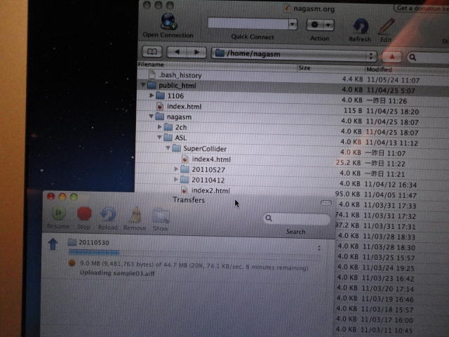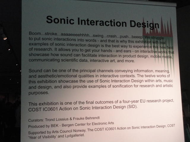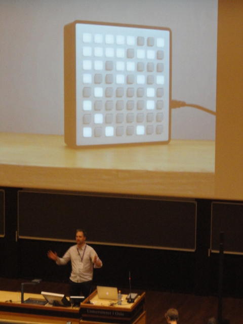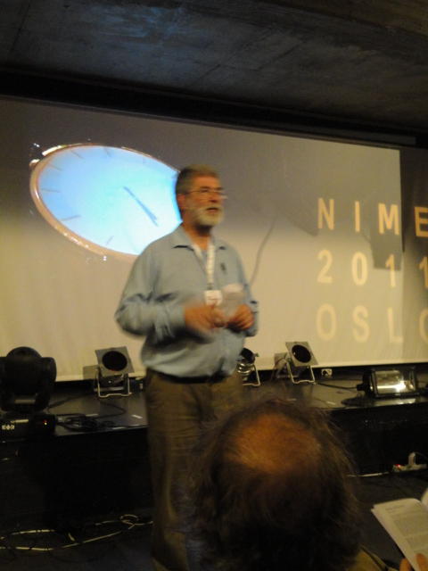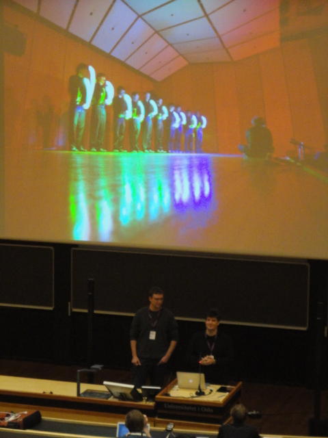 NIME2011 に参加して、コンサートセッションでの発表、steering committee meeting(国際組織委員会)などのため、オスロに行き、 同時進行で Processing日記 も書いてはWebに上げました。 オスロではSonic Interaction Designのフェスティバルも併催され、今後に向けて多くの刺激を得ました。 昨今のブームを反映して予想されたことですが、研究発表ではiPhone/iPadをインターフェースに使ったシステムの発表、 あるいはWebカメラに代わってKinectを画像センサとした発表が多数、ありました。コンサートでは、欧州での開催ということもあり、ICMC的な音楽的レベルの高い作品も多かったです。 日本では初音ミク・ぼかりす等の歌声合成がブームですが、それも知った上で、 敢えて生身の人間の声を作曲/演奏に活用した芸術的なアプローチが印象に残りました。 ミクの歌声にミクの3D-CGやアンドロイドロボットという虚構で喜んでいるのは日本だけなのかもしれません。