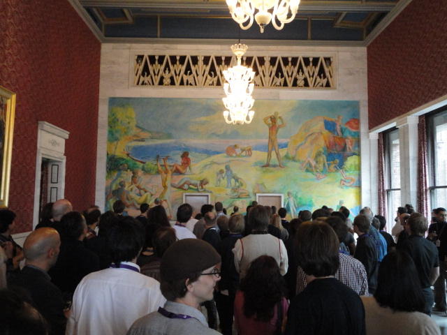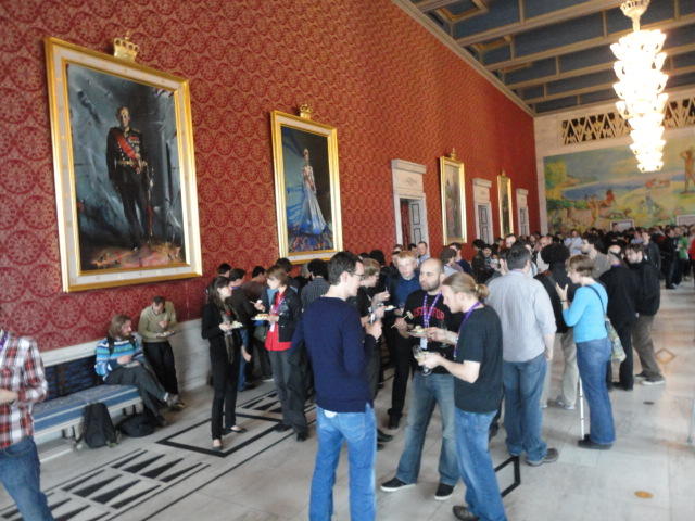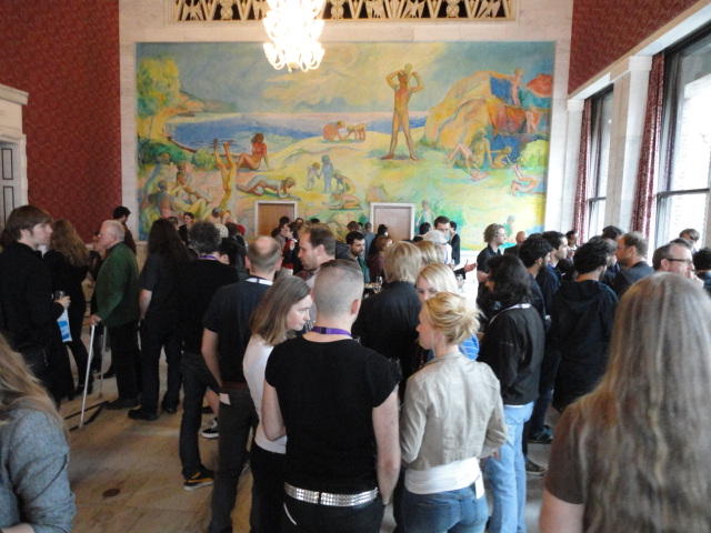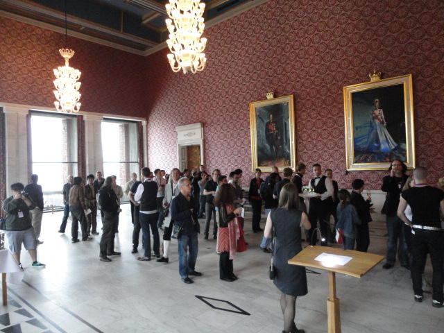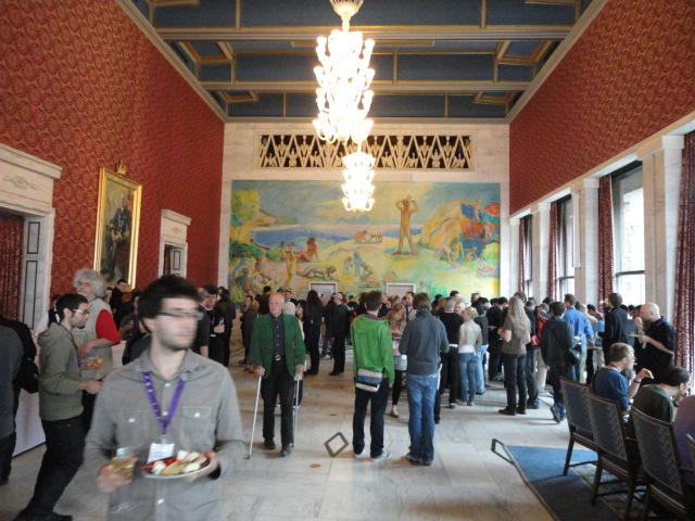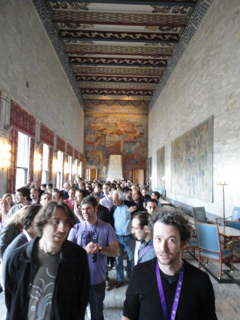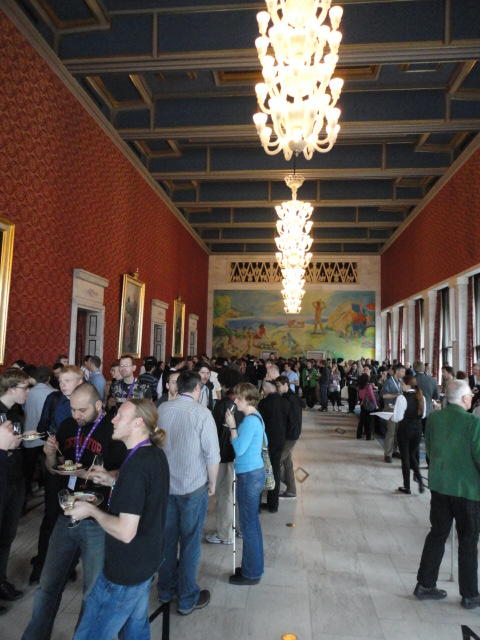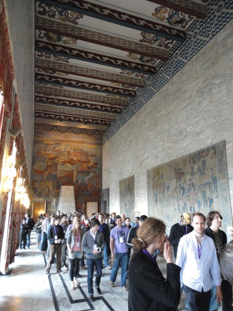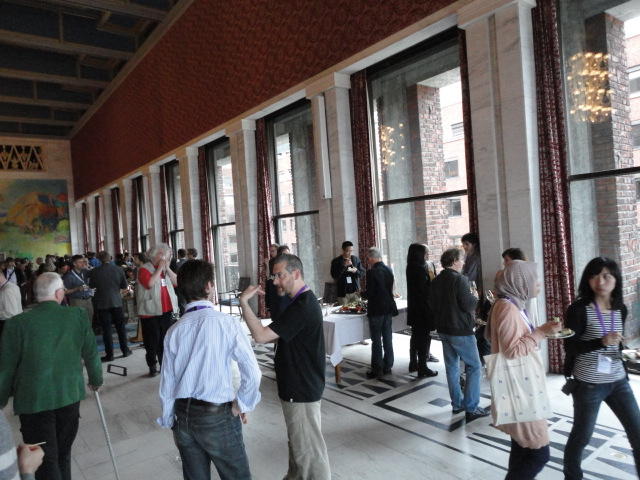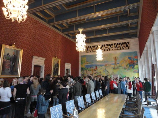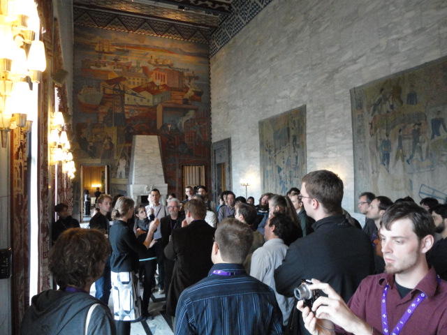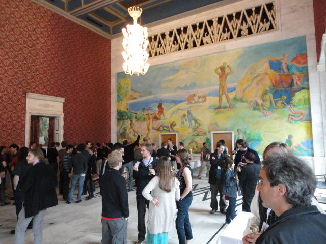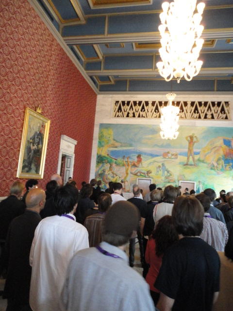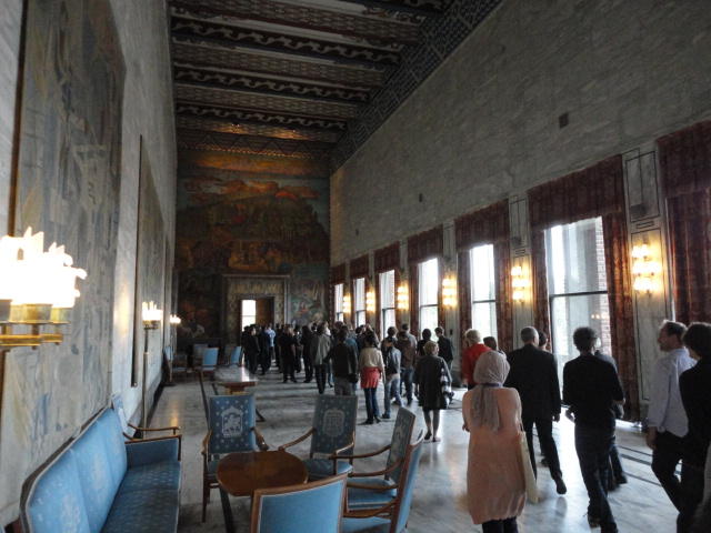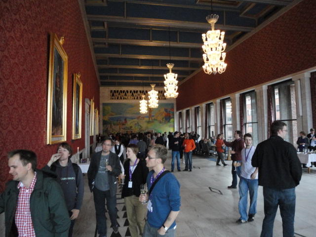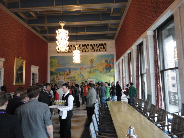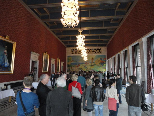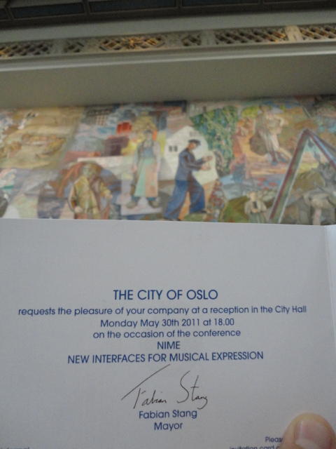 Paper Sessionが終わると、会場のAuditoriumの出口にいるスタッフが、参加者にカードを手渡していました。 どうやら、NIIME2011をオスロ市をあげて歓迎する、ということで、市長じきじきのレセプションへの招待状でした(^_^)。 貧乏なNIME参加者がタダめしタダ酒に飛びつくのは当然で、全員がメトロで市内へ、そしてオスロ市庁舎に向かいました。 なんと、前日の朝にみっちりと回ったそのホールに再び、今度は招待者として行くことになりました。