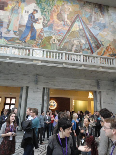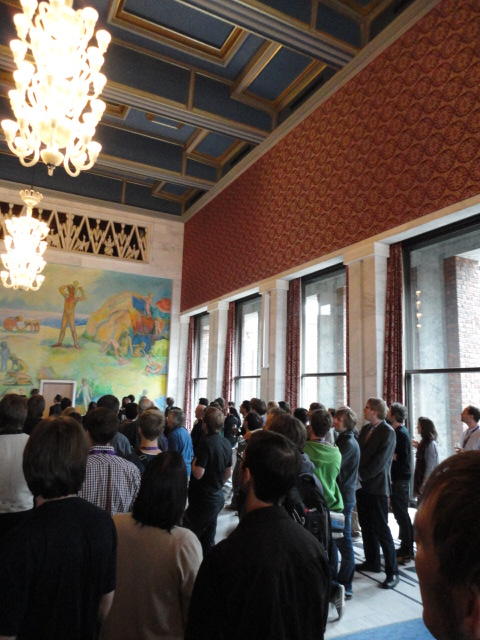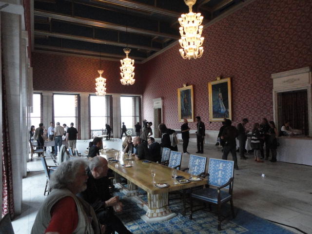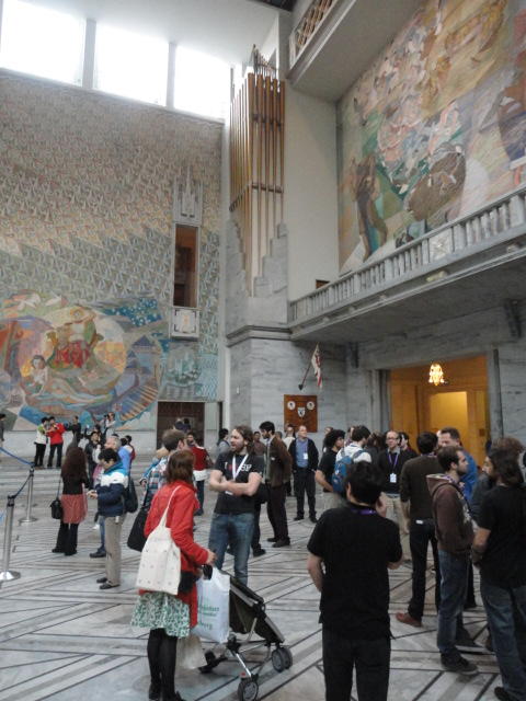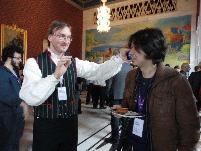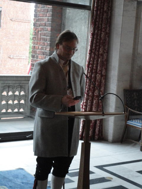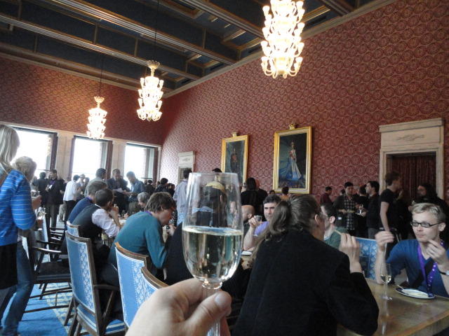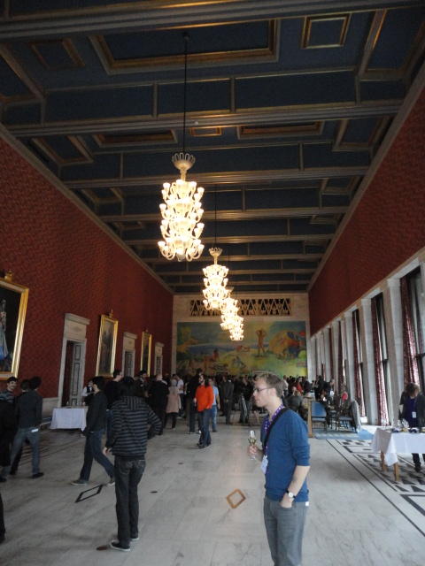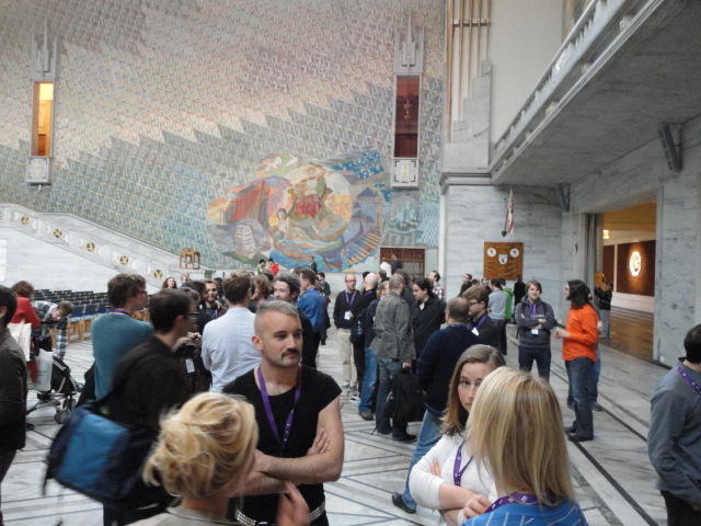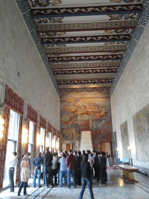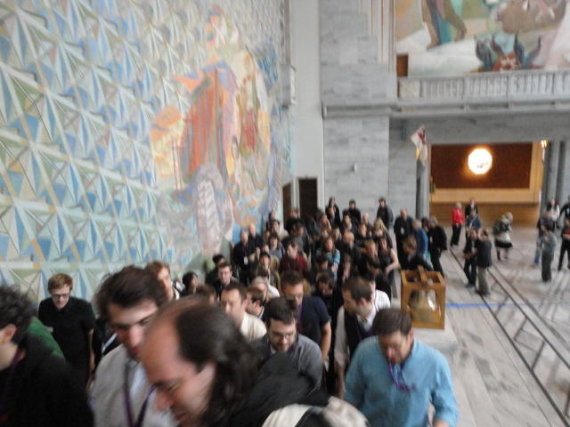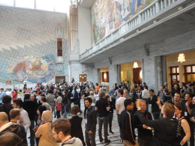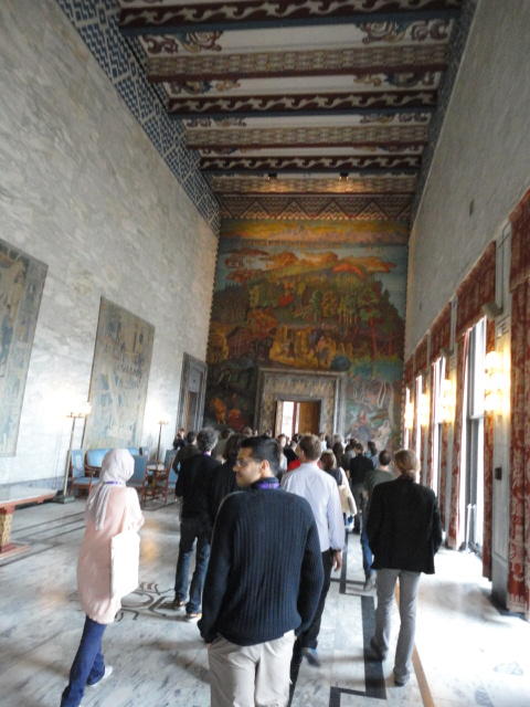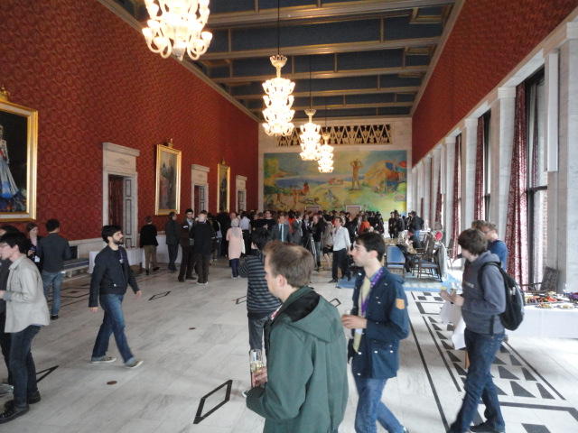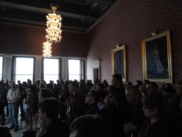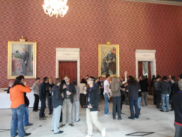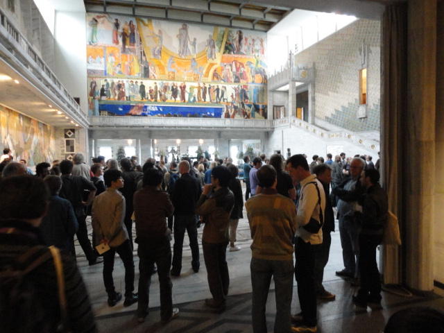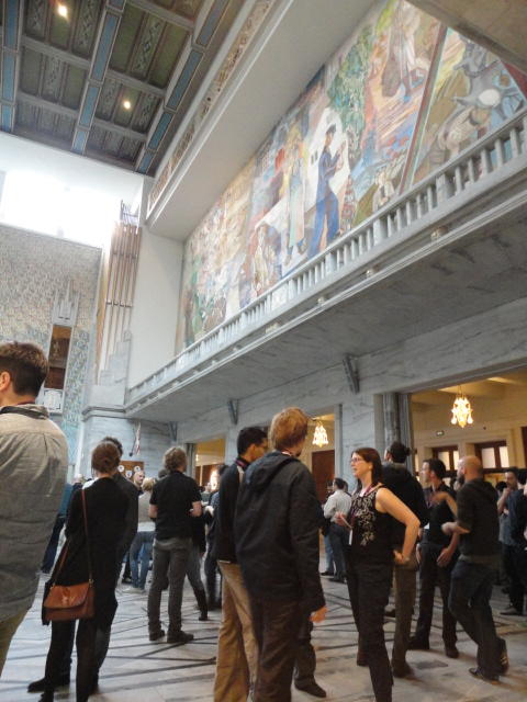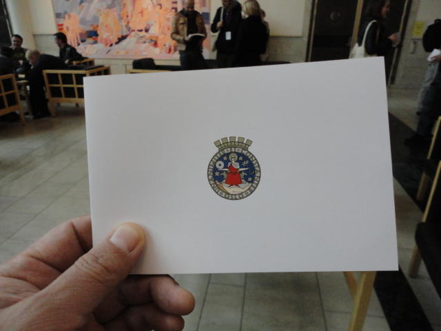 Paper Sessionが終わると、会場のAuditoriumの出口にいるスタッフが、参加者にカードを手渡していました。 どうやら、NIIME2011をオスロ市をあげて歓迎する、ということで、市長じきじきのレセプションへの招待状でした(^_^)。 貧乏なNIME参加者がタダめしタダ酒に飛びつくのは当然で、全員がメトロで市内へ、そしてオスロ市庁舎に向かいました。 なんと、前日の朝にみっちりと回ったそのホールに再び、今度は招待者として行くことになりました。