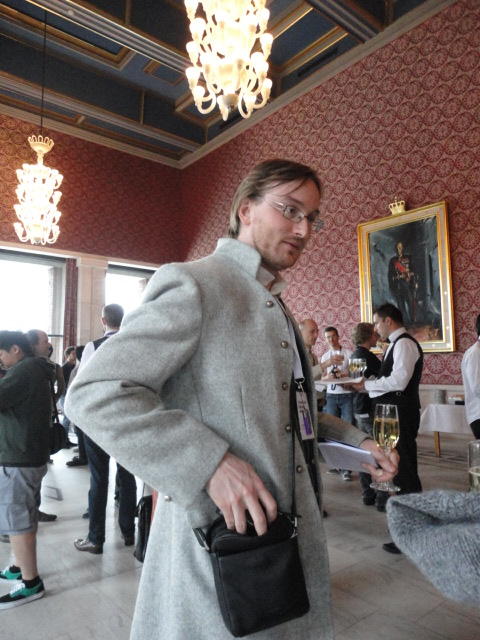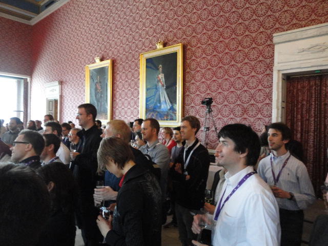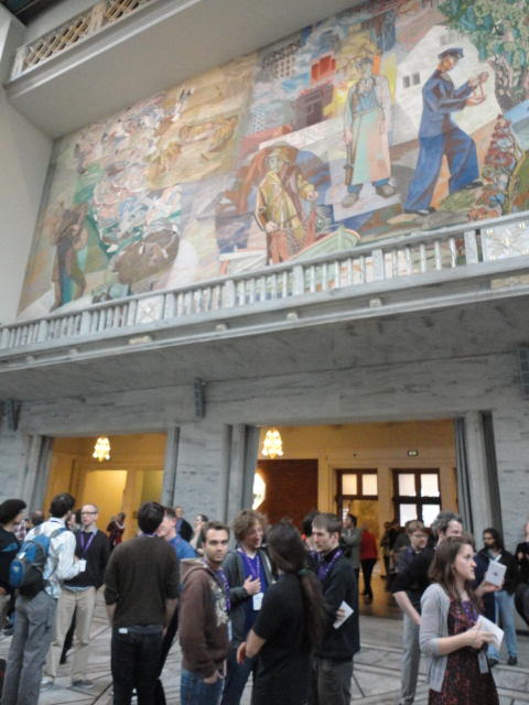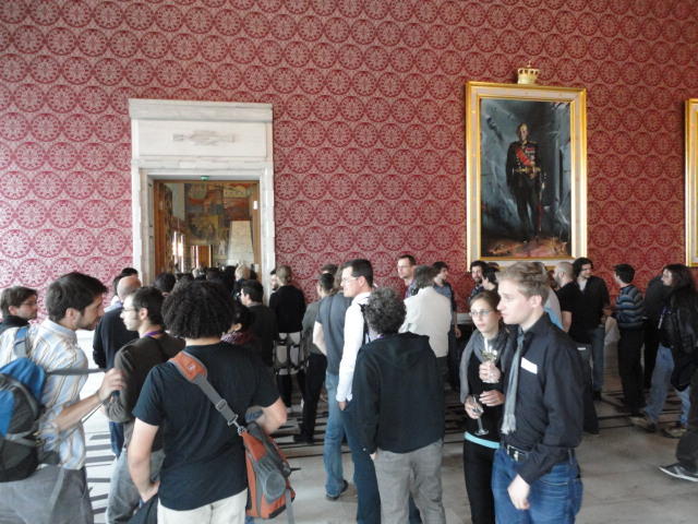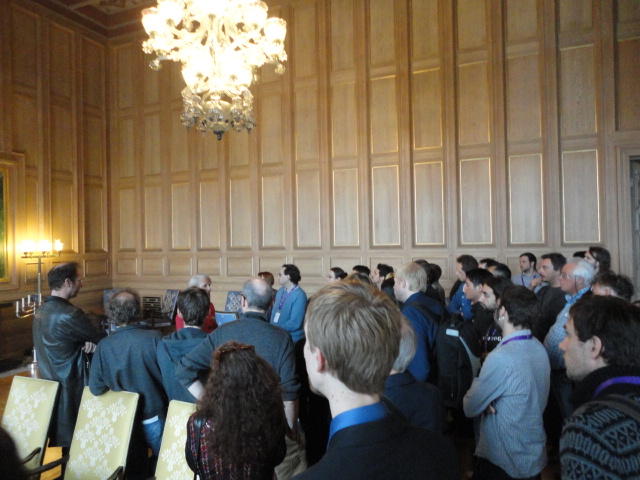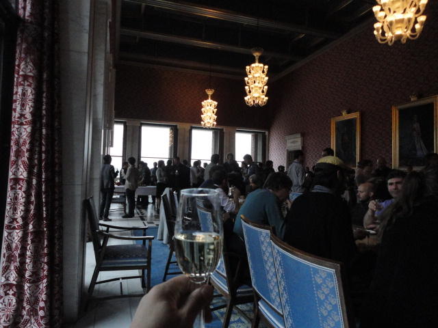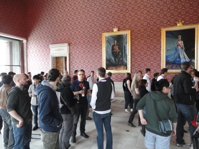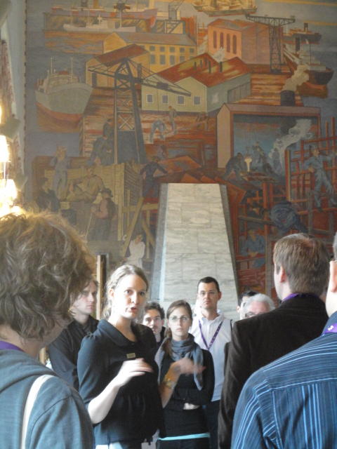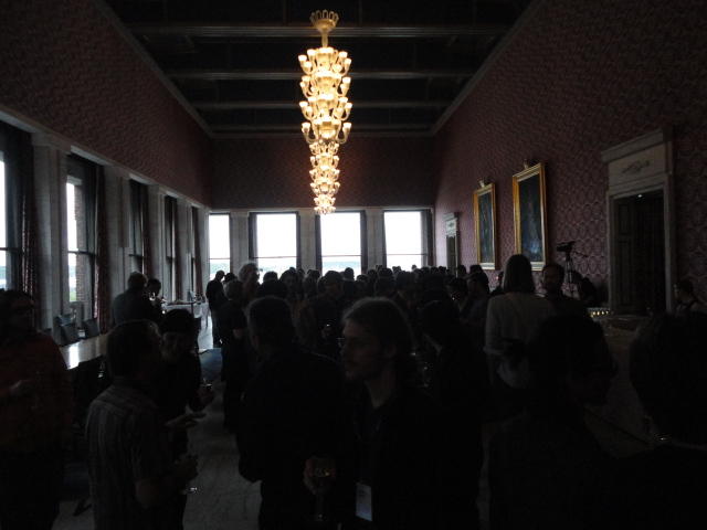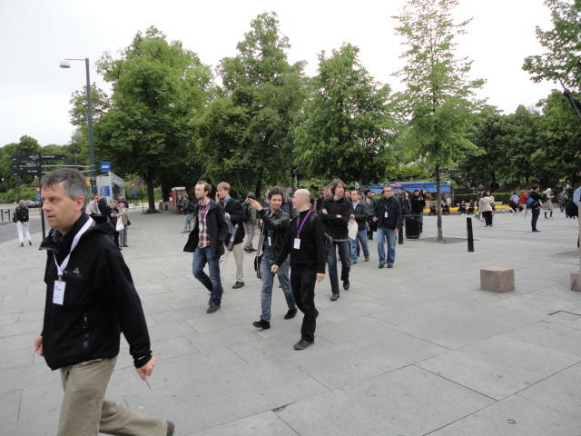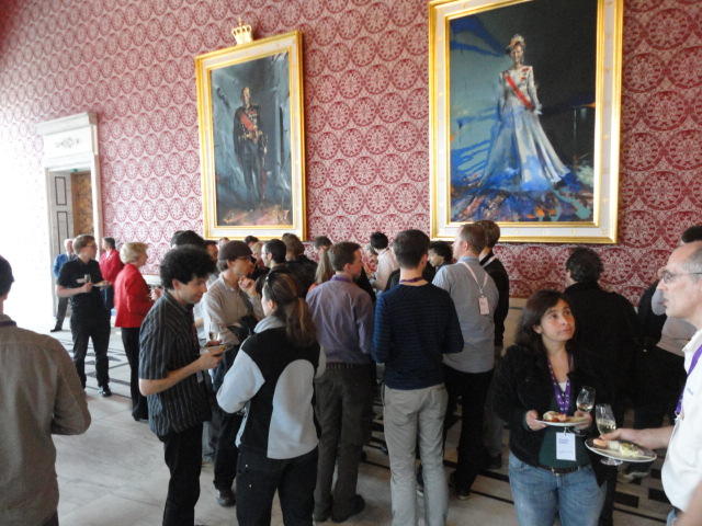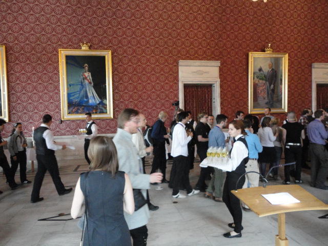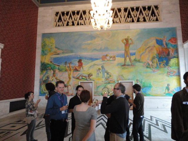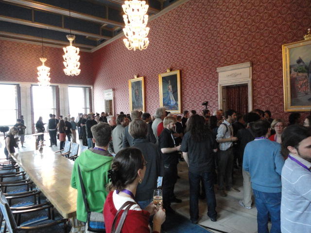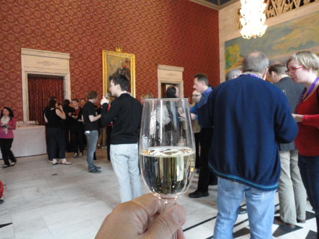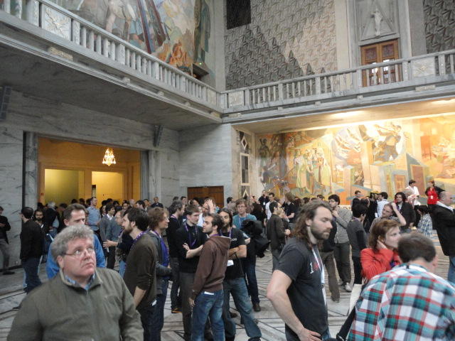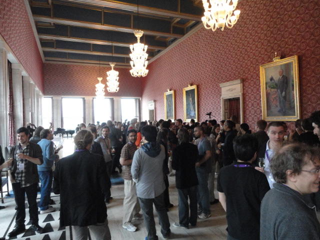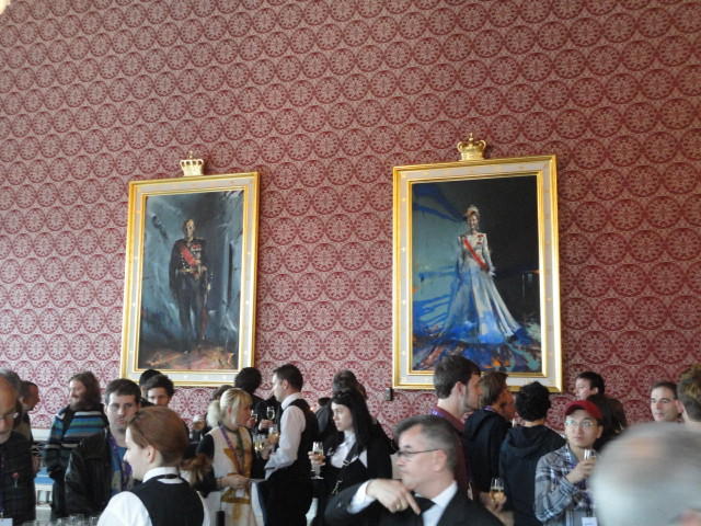 Paper Sessionが終わると、会場のAuditoriumの出口にいるスタッフが、参加者にカードを手渡していました。 どうやら、NIIME2011をオスロ市をあげて歓迎する、ということで、市長じきじきのレセプションへの招待状でした(^_^)。 貧乏なNIME参加者がタダめしタダ酒に飛びつくのは当然で、全員がメトロで市内へ、そしてオスロ市庁舎に向かいました。 なんと、前日の朝にみっちりと回ったそのホールに再び、今度は招待者として行くことになりました。