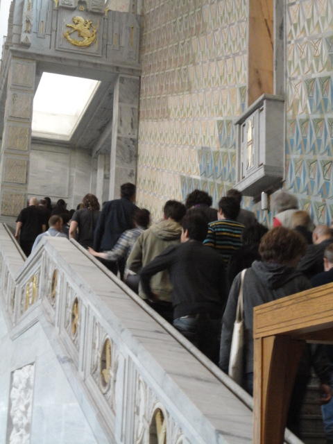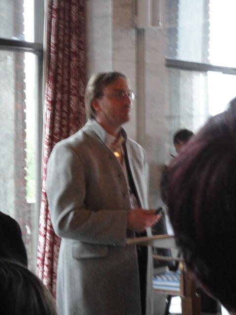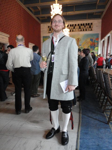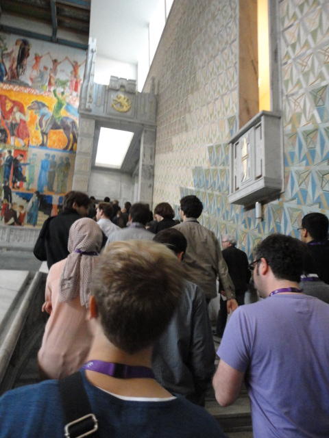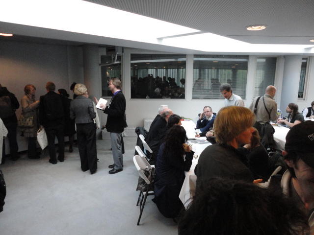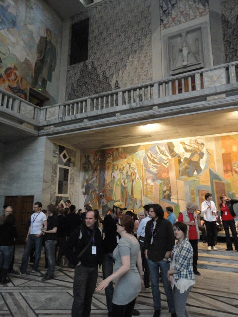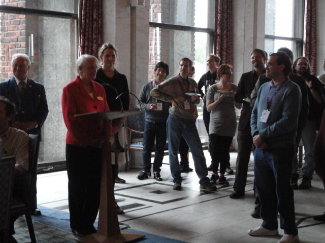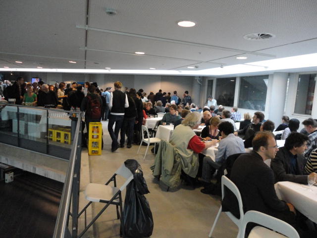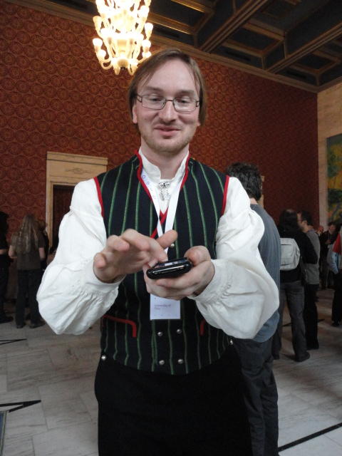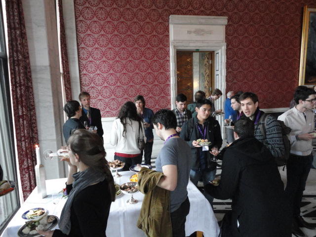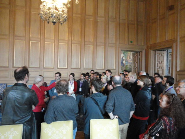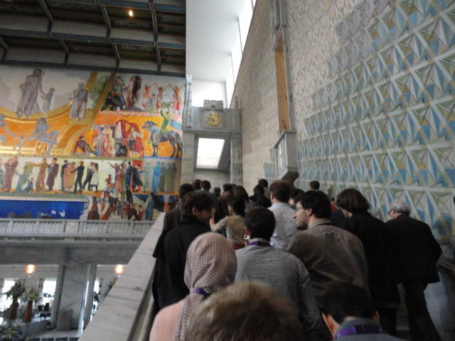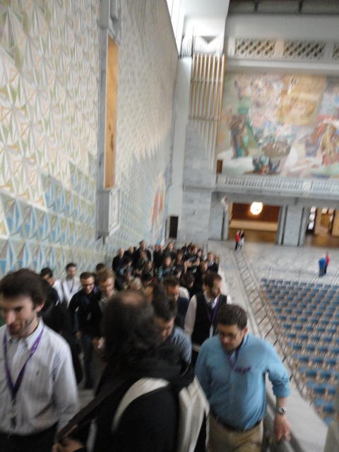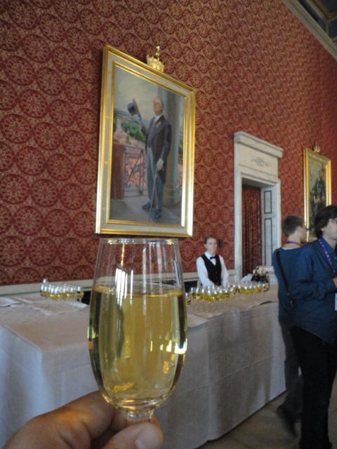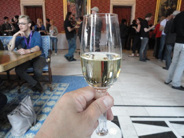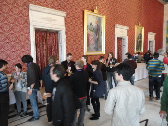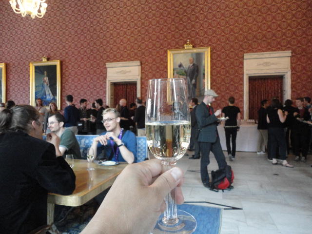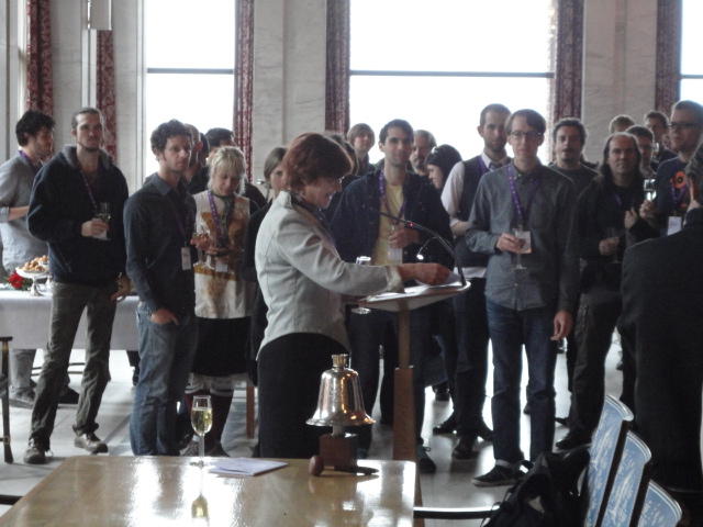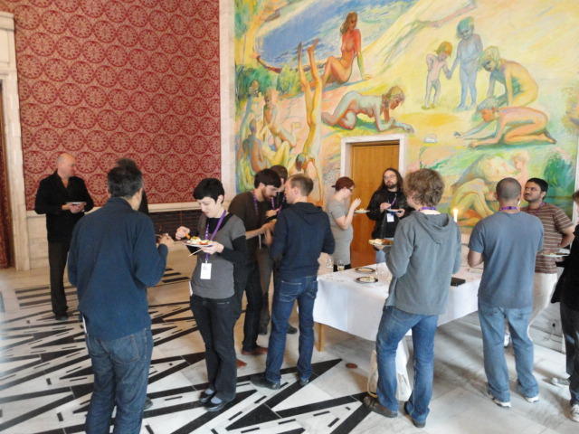 Paper Sessionが終わると、会場のAuditoriumの出口にいるスタッフが、参加者にカードを手渡していました。 どうやら、NIIME2011をオスロ市をあげて歓迎する、ということで、市長じきじきのレセプションへの招待状でした(^_^)。 貧乏なNIME参加者がタダめしタダ酒に飛びつくのは当然で、全員がメトロで市内へ、そしてオスロ市庁舎に向かいました。 なんと、前日の朝にみっちりと回ったそのホールに再び、今度は招待者として行くことになりました。