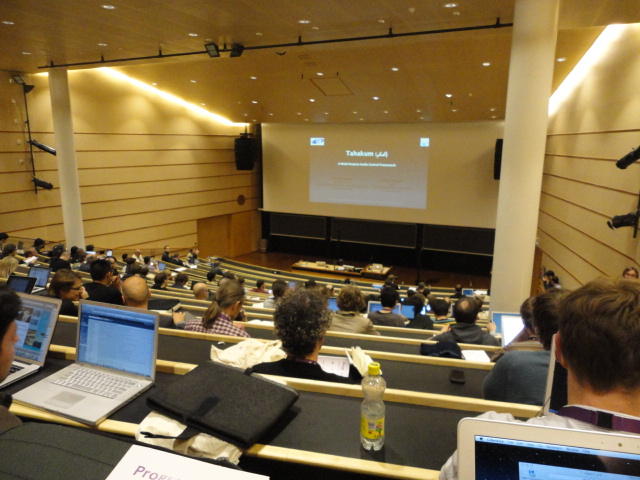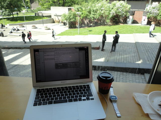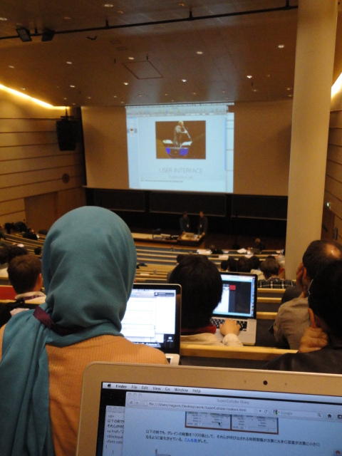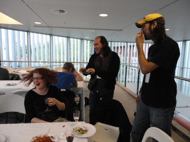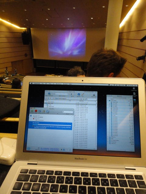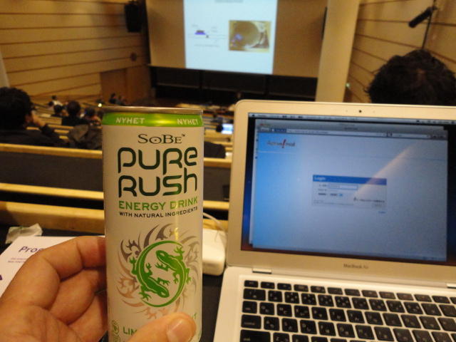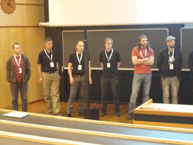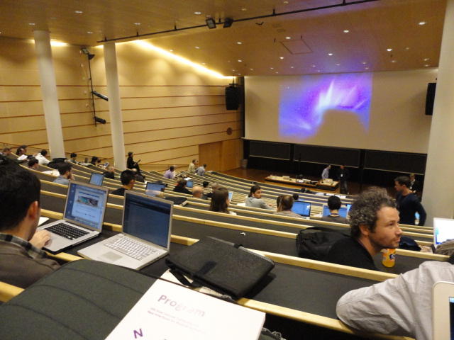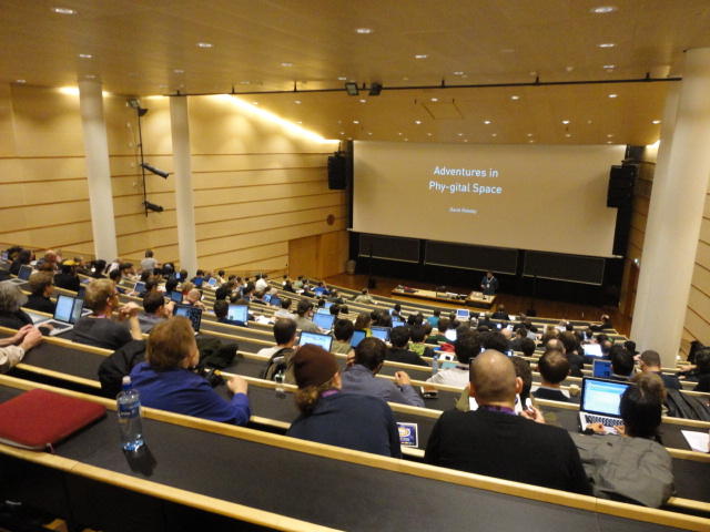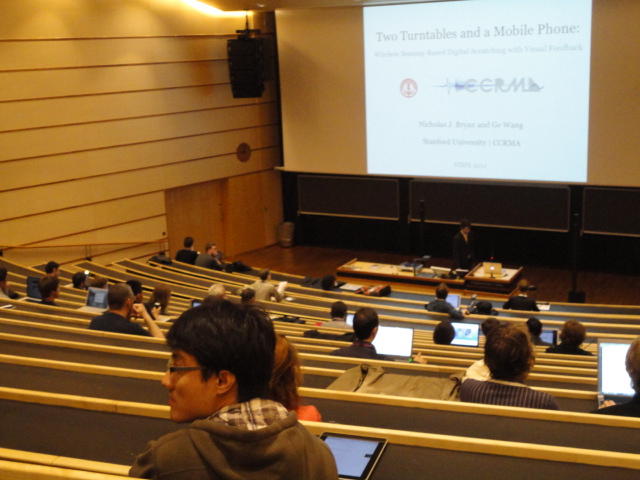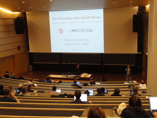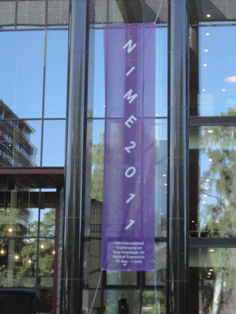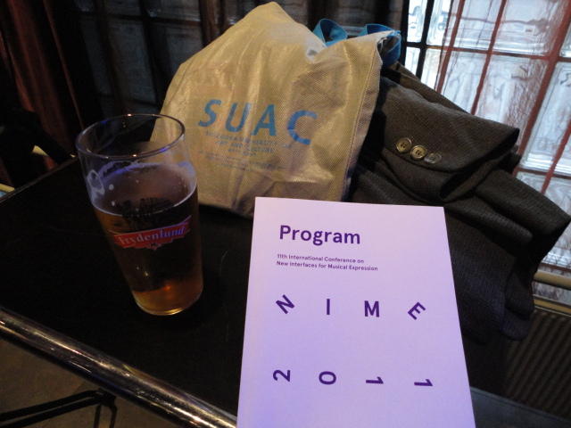 事前の長期予報では期間中ずっと毎日「雨」だったのに、パラパラ通り雨はあるものの、けっこう快適な天気でした。 しかしこの日だけは、ネットの天気予報でも「雨」、さらに朝のテレビでもキッパリと「雨」ということで、 傘をさしているので会場に向かう写真とかはありません。 前夜のコンサートが24時あたりまでやっていたのに、ちゃんと午前のセッションは9時スタートです。 iPhoneオカリナなどの Smule の Ge Wang 氏が絡んだ、iPadモノのオンパレードでした。Paper session F ― Tuesday 31 May 09:00-10:50 Auditorium 1, University Library Two Turntables and a Mobile Phone Nicholas J. Bryan and Ge Wang MadPad: A Crowdsourcing System for Audiovisual Sampling Nick Kruge and Ge Wang The Visual in Mobile Music Performance Patrick O’Keefe and Georg Essl Designing for the iPad: Magic Fiddle Ge Wang, Jieun Oh and Tom Lieber MobileMuse: Integral Music Control Goes Mobile Benjamin Knapp and Brennon Bortz Tangible Performance Management of Grid-based Laptop Orchestras Stephen Beck, Chris Branton, Sharath Maddineni, Brygg Ullmer, Shantenu Jha Keynote Lecture 2 ― Tuesday 31 May 11:30-12:30 Auditorium 1, University Library Adventures in Phy-gital Space David Rokeby★ ★ ★ ★ ★ ★ ★ ★ ★ ★ ★ ★ ★ ★ ★ ★ ★ ★ ★ ★ ★NIME steering committee lunch meeting