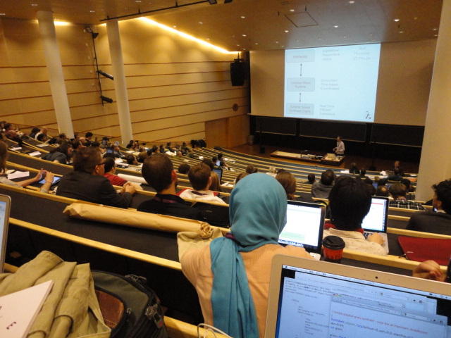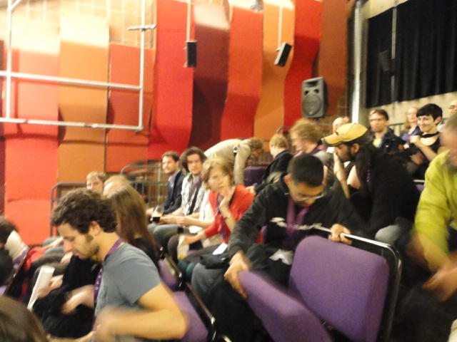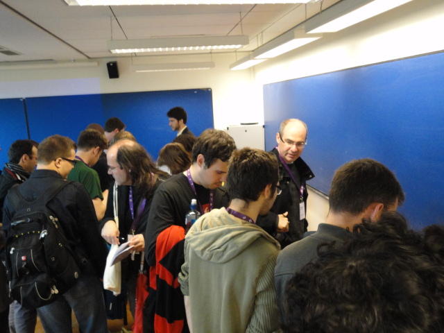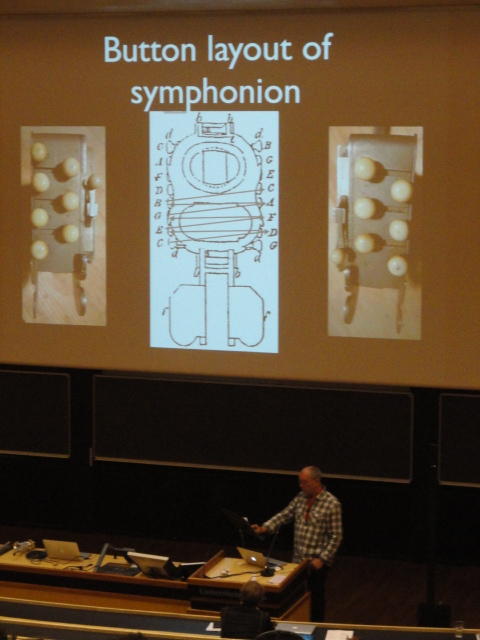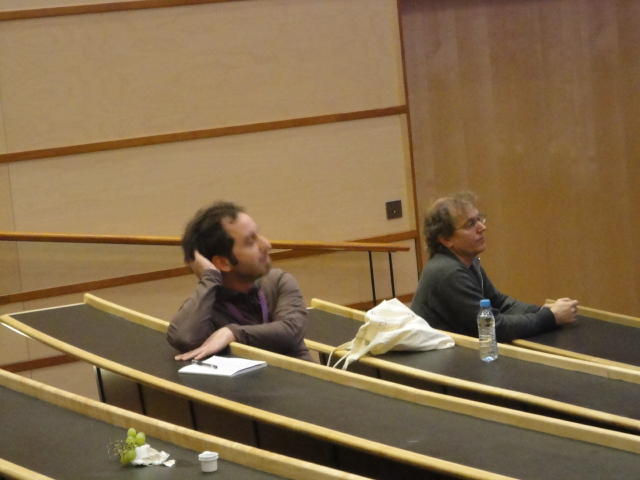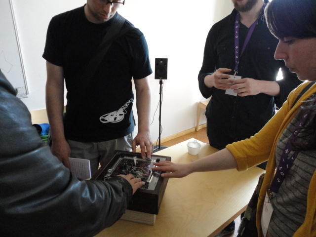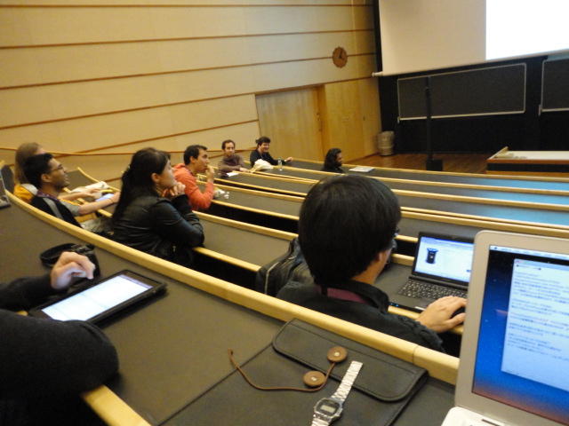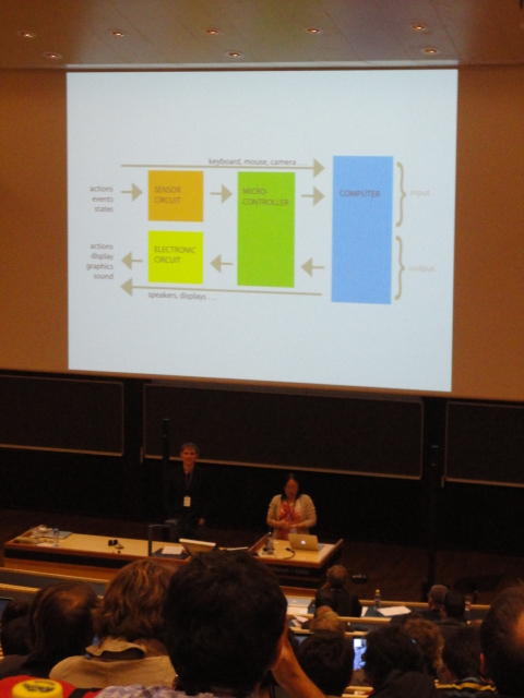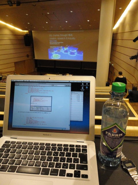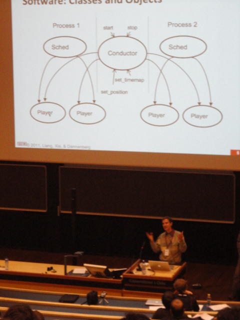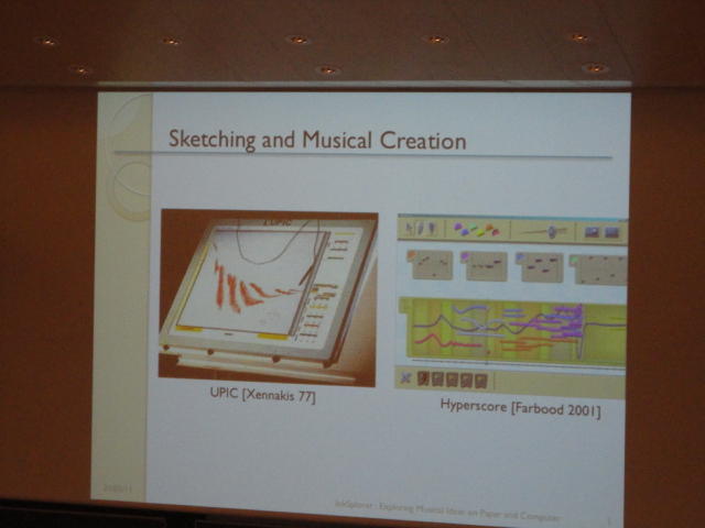 午後の後半のPaper Sessionです。 写真が少ないのは、講演中の一部のデモはビデオを撮っていたのと、内職で Processing日記 を進めていたためです(^_^;)。 これで2日目の研究発表セッションは終わりですが、晩にはいよいよコンサートの連チャン(ホールコンサート+クラブコンサート)が始まります。Paper session I ― Tuesday 31 May 14:30-15:30 Auditorium 1, University Library An Open Source Interface based on Biological Neural Networks for Interac- tive Music Performance Hernan Kerllenevich, Manuel Eguia and Pablo Riera Recognition Of Multivariate Temporal Musical Gestures Using N-Dimensional Dynamic Time Warping Nicholas Gillian, R. Benjamin Knapp and Sile O'Modhrain A Machine Learning Toolbox For Musician Computer Interaction Nicholas Gillian, R. Benjamin Knapp and Sile O'Modhrain Paper session J ― Tuesday 31 May 16:00-17:00 Auditorium 1, University Library Music and Technology in Death and the Powers Elena Jessop, Peter Torpey and Benjamin Bloomberg Design and Evaluation of a Hybrid Reality Performance Victor Zappi, Dario Mazzanti, Andrea Brogni and Darwin Caldwell InkSplorer : Exploring Musical Ideas on Paper and Computer Jeremie Garcia, Theophanis Tsandilas, Carlos Agon and Wendy Mackay★ ★ ★Dinner Break