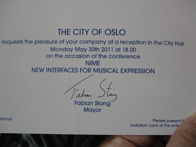 午後のセッションの後半は、2つのPaperセッションです。Paper session D ― Monday 30 May 14:30-15:30 Auditorium 1, University Library Gestural Embodiment of Environmental Sounds: an Experimental Study Baptiste Caramiaux, Patrick Susini, Tommaso Bianco, Frederic Bevilacqua, Olivier Houix, Norbert Schnell and Nicolas Misdariis Listening to Your Brain: Implicit Interaction in Collaborative Music Perfor- mances Sebastian Mealla, Aleksander Valjamae, Mathieu Bosi and Sergi Jorda Examining How Musicians Create Augmented Musical Instruments Dan Newton and Mark Marshall Paper session E ― Monday 30 May 16:00-17:00 Auditorium 1, University Library Tahakum: A Multi-Purpose Audio Control Framework Zachary Seldess and Toshiro Yamada A Framework for Coordination and Synchronization of Media Dawen Liang, Guangyu Xia and Roger Dannenberg Satellite CCRMA: A Musical Interaction and Sound Synthesis Platform Edgar Berdahl and Wendy Ju★ ★ ★ ★ ★ ★ ★ ★ ★ ★ ★ ★ ★ ★ ★ ★オスロ市庁舎へ移動