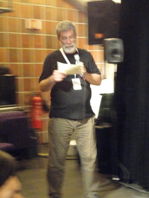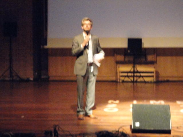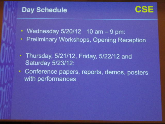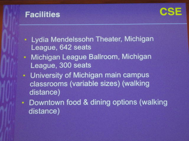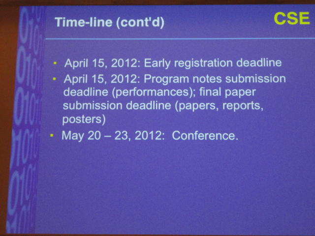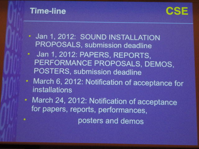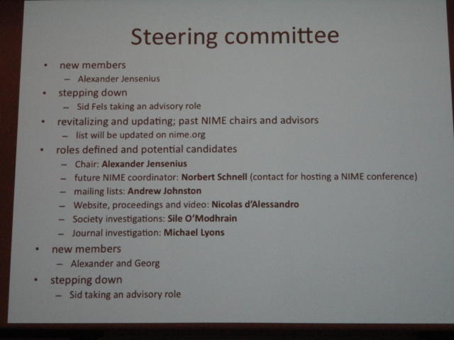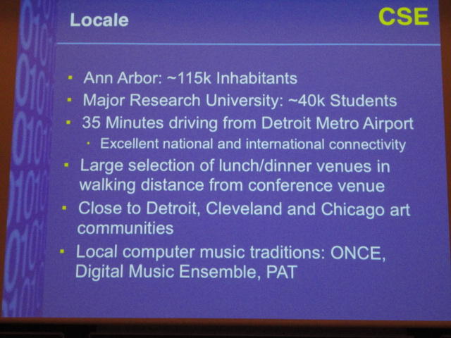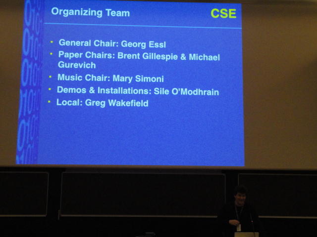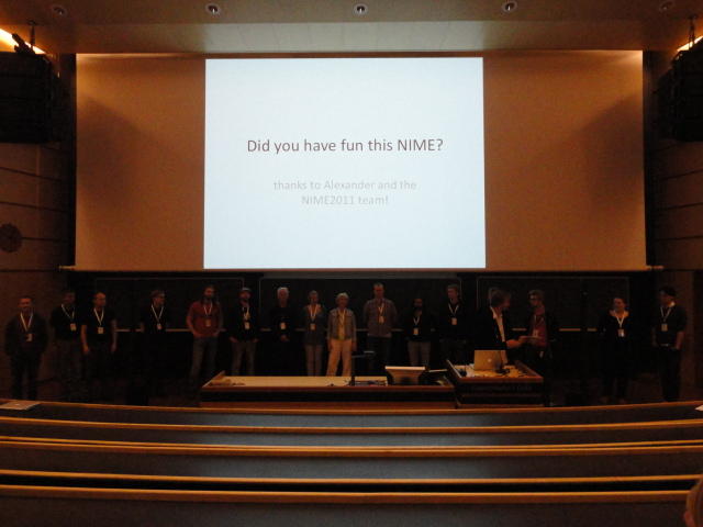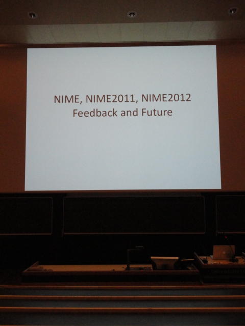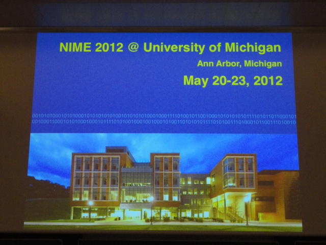 最後のセッションの後は、NIME General Discussionです。 これは、基本的にはNIME組織委員会が呼びかけて、NIME参加者と自由に議論する、というもので、同時に現地スタッフを慰労して讃える、 という儀式でもあります。 また最大の議題として、次回NIME2012の開催のアピールもします。 僕も NIME03(Montreal) では、壇上で「来年のNIME04は日本のSUACで開催するのでどうぞおいで下さい(^_^)」とプレゼンしました。 ・・・ということで、NIME2012はミシガン大学です。 僕は、採択されて行ければ、 ICMC1998 以来、ということになります。