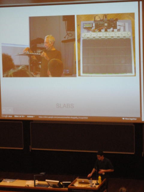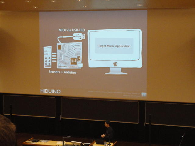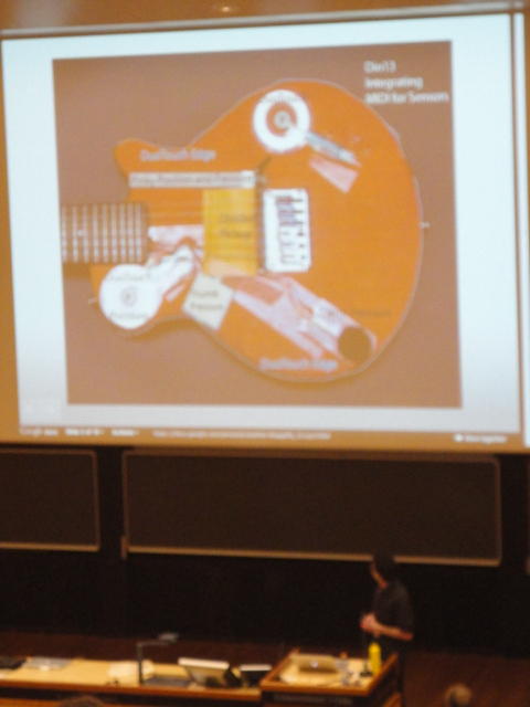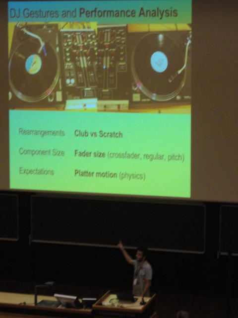 3日目の午前のPaper Sessionです。 前夜のコンサートは24時過ぎまでだったのですが、やはりきっちりと9時スタートです。 写真が少ないのは、講演中の一部のデモはビデオを撮っていたのと、内職で Processing日記 を進めていたためです(^_^;)。 午後はKeynoteとGeneral Discussionなので、口頭発表のセッションはこれが最後です。Paper session K ― Wednesday 1 June 09:00-10:30 Auditorium 1, University Library Battle of the DJs: an HCI perspective of Traditional, Virtual, Hybrid and Mul- titouch DJing Pedro Lopes, Alfredo Ferreira and Joao Madeiras Pereira Designing Digital Musical Interactions in Experimental Contexts Adnan Marquez Borbon, Michael Gurevich, A. Cavan Fyans and Paul Stapleton Crackle: A mobile multitouch topology for exploratory sound interaction Jonathan Reus A principled approach to developing new languages for live coding Samuel Aaron, Alan F. Blackwell, Richard Hoadley and Tim Regan Integra Live: a new graphical user interface for live electronic music Jamie Bullock, Daniel Beattie and Jerome Turner Paper session L ― Wednesday 1 June 11:00-12:30 Auditorium 1, University Library Robust and Reliable Fabric, Piezoresistive Multitouch Sensing Surfaces for Musical Controllers Adrian Freed, Yung-Sim Roh, Yotam Mann and David Wessel Examining the Effects of Embedded Vibrotactile Feedback on the Feel of a Digital Musical Instrument Mark Marshall and Marcelo Wanderley HIDUINO: A firmware for building driverless USB-MIDI devices using the Arduino microcontroller Dimitri Diakopoulos and Ajay Kapur Latency improvement in sensor wireless transmission using IEEE 802.15.4 Emmanuel Flety and Come Maestracci The Snyderphonics Manta, a Novel USB Touch Controller Jeff Snyder★ ★ ★ ★ ★ ★ ★ ★ ★ ★ ★ ★ ★ ★Lunch Break