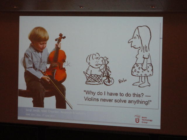 3日目の午後の前半は、またPoster/Demo Sessionです。Poster session M ― Wednesday 1 June 13:30-14:30 3rd floor, University Library Creating Interactive Multimedia Works with Bio-data Claudia Robles Angel TresnaNet: musical generation based on network protocols Paula Ustarroz Designing a Music Performance Space for Persons with Intellectual Learning Disabilities Matti Luhtala, Tiina Kymalainen and Johan Plomp Raja ― A Multidisciplinary Artistic Performance Tom Ahola, Teemu Ahmaniemi, Koray Tahiroglu, Fabio Belloni and Ville Ranki Eobody3: A ready-to-use pre-mapped amp; multi-protocol sensor interface Emmanuelle Gallin and Marc Sirguy Eye Tapping: How to Beat Out an Accurate Rhythm using Eye Movements Rasmus Baath, Thomas Strandberg and Christian Balkenius MelodyMorph: A Reconfigurable Musical Instrument Eric Rosenbaum Flo)(ps: Between Habitual and Explorative Action-Sound Relationships Karmen Franinovic Acquisition and study of blowing pressure profiles in recorder playing Francisco Garcia, Leny Vinceslas, Esteban Maestre and Josep Tubau Wekinating 000000Swan: Using Machine Learning to Create and Control Complex Artistic Systems Margaret Schedel, Rebecca Fiebrink and Phoenix Perry MTCF: A framework for designing and coding musical tabletop applications directly in Pure Data Carles F. Julia, Daniel Gallardo and Sergi Jorda Physical modelling enabling enaction: an example David Pirro and Gerhard Eckel SoundGrasp: A Gestural Interface for the Performance of Live Music Thomas Mitchell and Imogen Heap Minding the (Transatlantic) Gap: An Internet-Enabled Acoustic Brain-Computer Music Interface Tim Mullen, Richard Warp and Adam Jansch Rhythm’n’Shoes: a wearable foot tapping interface with audio-tactile feed- back Stefano Papetti, Marco Civolani and Federico Fontana A structured design and evaluation model with application to rhythmic in- teraction displays Cumhur Erkut, Antti Jylha and Reha Discioglu A Hair Ribbon Deflection Model for Low-Intrusiveness Measurement of Bow Force in Violin Performance Marco Marchini, Panos Papiotis, Alfonso Perez and Esteban Maestre Random Access Remixing on the iPad Jonathan Forsyth, Aron Glennon and Juan Bello Designing the EP trio: Instrument identities, control and performance prac- tice in an electronic chamber music ensemble Erika Donald, Ben Duinker and Eliot Britton Perceptions of Skill in Performances with Acoustic and Electronic Instru- ments Cavan Fyans and Michael Gurevich Cognitive Issues in Computer Music Programming Hiroki Nishino Seaboard: a new piano keyboard-related interface combining discrete and continuous control Roland Lamb and Andrew Robertson Music Interfaces for Novice Users: Composing Music on a Public Display with Hand Gestures Gilbert Beyer and Max Meier Expanding the role of the instrument Birgitta Cappelen and Anders-Petter Andersson Wireless Digital/Analog Sensors for Music and Dance Performances Todor Todoroff Real-time control and creative convolution ― exchanging techniques between distinct genres Trond Engum The Six Fantasies Machine: an instrument modelling phrases from Paul Lan- sky’s Six Fantasies Andreas Bergsland On Movement, Structure and Abstraction in Generative Audiovisual Impro- visation Bill Hsu Demo session N ― Wednesday 1 June 13:30-14:30 3rd floor, University Library Gliss: An Intuitive Sequencer for the iPhone and iPad Jan Trutzschler Quadrofeelia ― A New Instrument for Sliding into Notes Jiffer Harriman, Locky Casey, Linden Melvin and Mike Repper SQUEEZY: Extending a Multi-touch Screen with Force Sensing Objects for Controlling Articulatory Synthesis Johnty Wang, Nicolas D’Alessandro, Sidney Fels and Bob Pritchard SWAF: Towards a Web Application Framework for Composition and Docu- mentation of Soundscape Souhwan Choe and Kyogu Lee Playing the “MO” ― Gestural Control and Re-Embodiment of Recorded Sound and Music Norbert Schnell, Frederic Bevilacqua, Nicolas Rasamimana, Julien Blois, Fabrice Guedy and Emmanuel Flety (LAND)MOVES Bruno Zamborlin, Marco Liuni and Giorgio Partesana Can Haptics make New Music? ― Fader and Plank Demos Bill Verplank and Francesco Georg★ ★ ★ ★ ★ ★ ★ ★ ★ ★ ★ ★ ★ ★ ★ ★ ★ ★ ★ ★ ★ ★Paper Session (5)