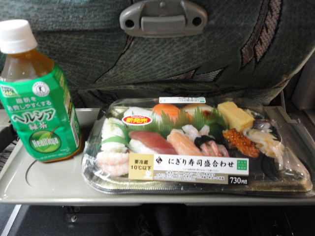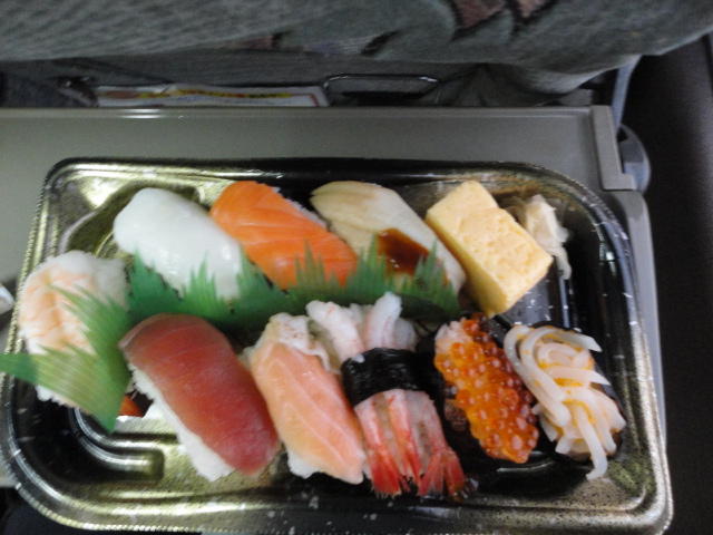 セントレアには18時半前に着きました。 ここから浜松へのe-wingは、19時台は浜松駅に行かないので、20時の便まで待たずに、 西インターに行ってタクシーで帰宅しました。 ミュンヘン→成田のフライトの最後の朝食を食べずにいたので、ちょうど程よく空腹となり、 空港コンビニでお寿司を仕入れたのもいつものパターンです。