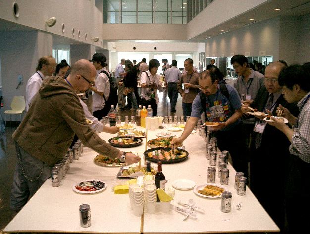 Openong Concertが終わると、現地実行委員会が現地スポンサーの協賛を得て行う「レセプション」です。 歴史のあるICMCでは、参加者が(高い)参加費を払う「Banquet」というパーティー(フルコース料理)がありますが、 若いNIMEでは伝統的に、気合いで無料のレセシプション(立食パーティ)が企画されます。 2004年6月に NIME04 をSUACで開催した時にも、学食での立食パーティ ★ を行いました(^_^;)。 再びバスでNorwegian Academy of Musicに戻り、メトロで帰りましたが、夜21時半ということでまだまだ明るいのでした。