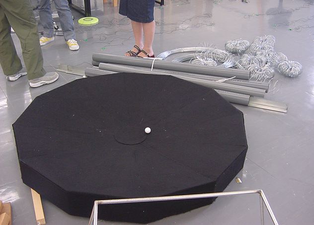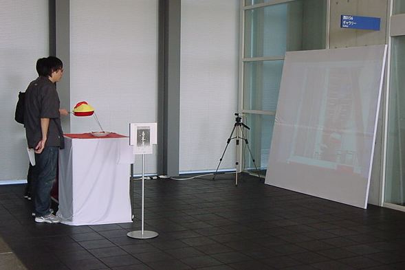 "The Real Phantom" is media installation work with the first device in the world. The device - Transmissive Mirror Device with Micro Dihedral Corner Reflector Array - is a passive mirror forming a real image. The disk that queues up form of 16 pieces to reversing of the ruggedness rotates when people turn a handle. It is compared when forming comes right under the device with the flash that emits light synchronizing with the rotation, and the animation of Zortororp is achieved.