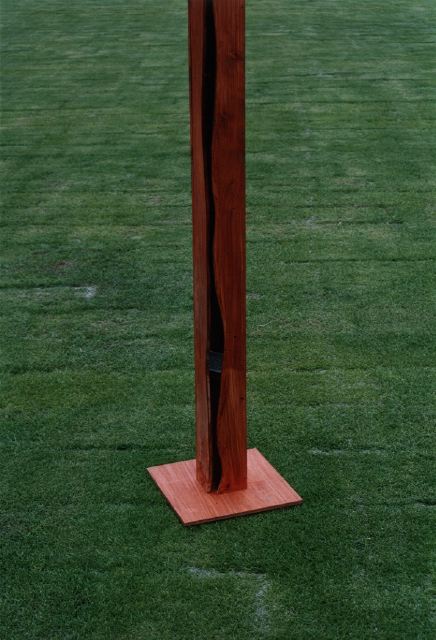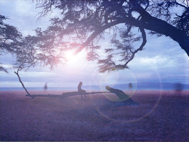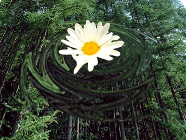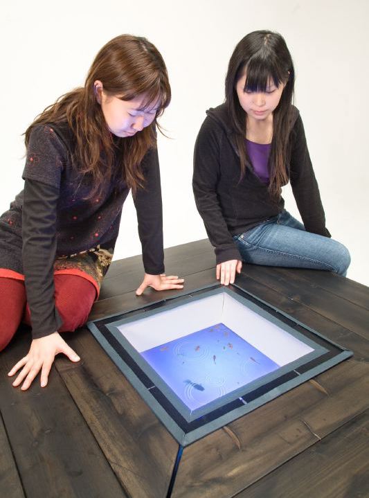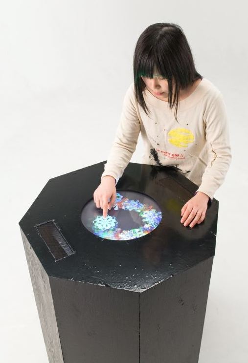 This is a structure like chair to which people can sit surrounds hole at center. The part of the hole at the center is a screen, and the image that changes hour by hour at the four seasons comes out. When people touches the part on the edge in surroundings of the hole, the images change.
