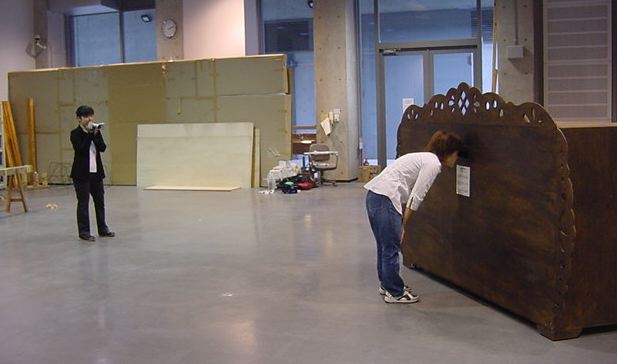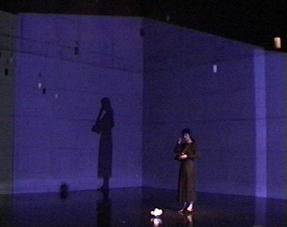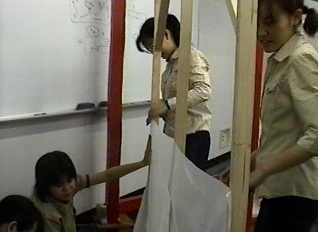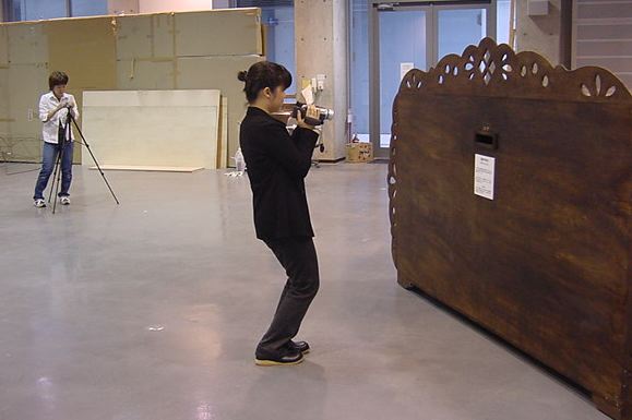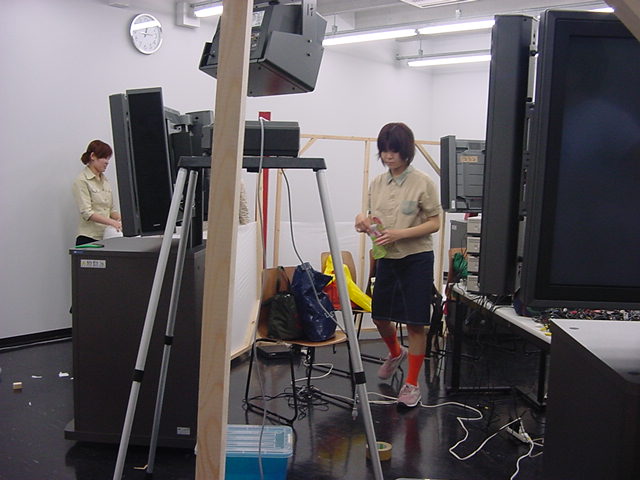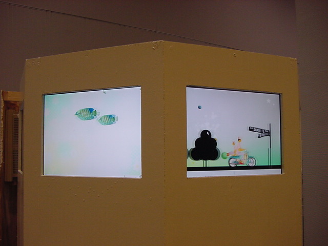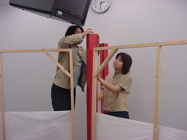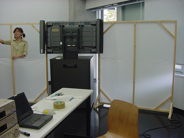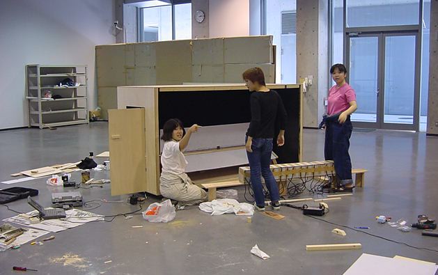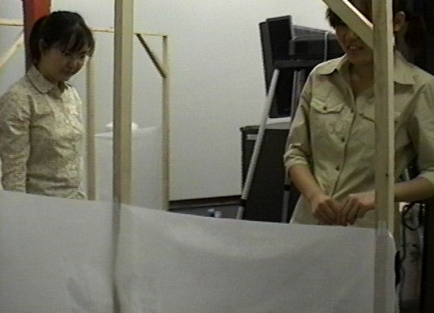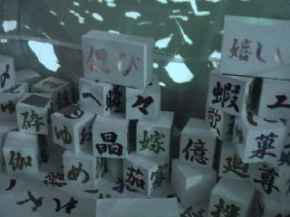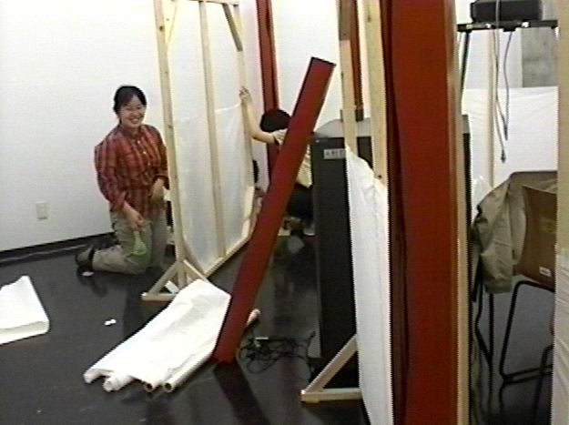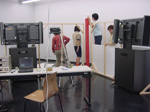 In the center of a huge, dark space, there is a rugged room encompassed with the cloth of three meters in length, three meters in width, and three meters in height. A different movie is projected to each the four outside walls. An innumerable box is piled up on the floor when people enters this room, and the word is written in each box. The word of the box shines when people lifts any box, it sounds in surroundings, and four movies projected to the wall change.