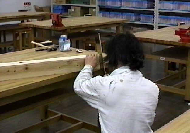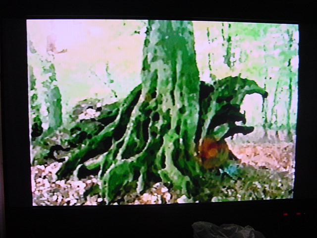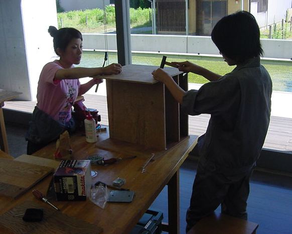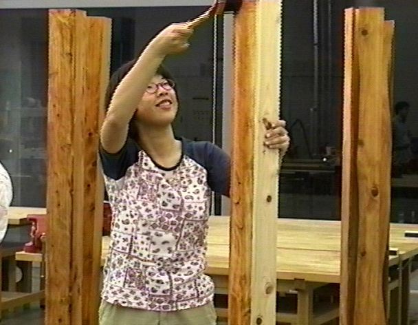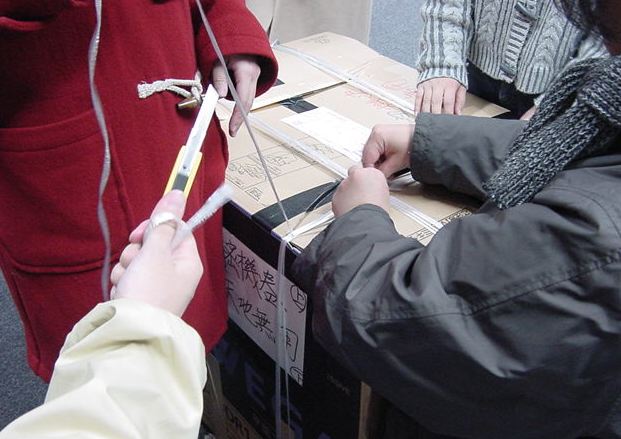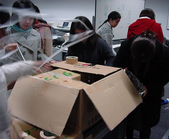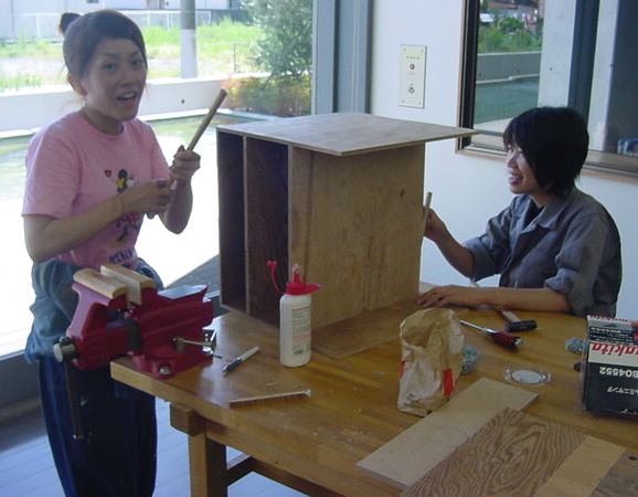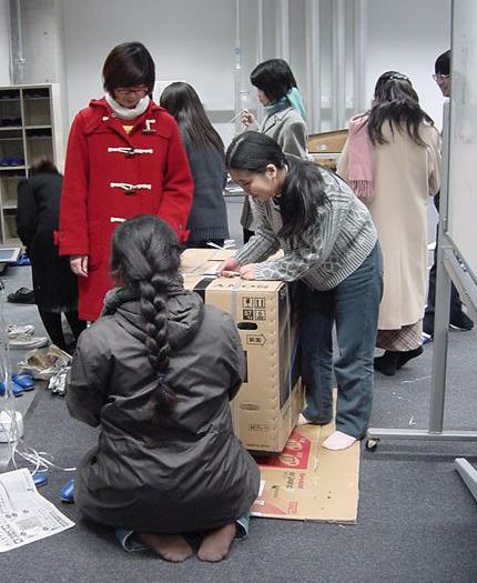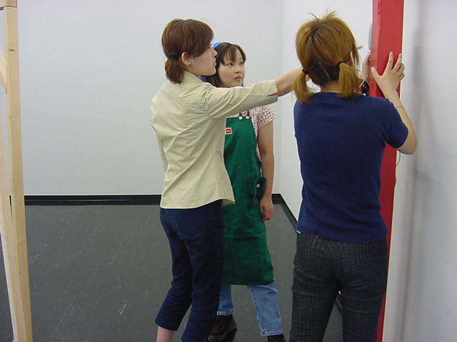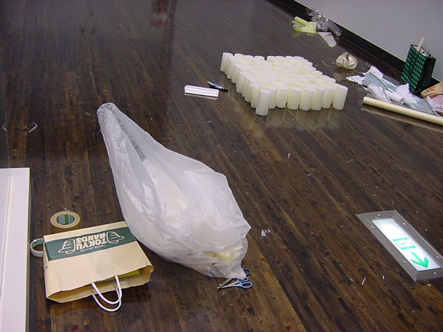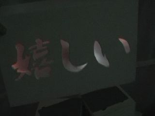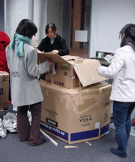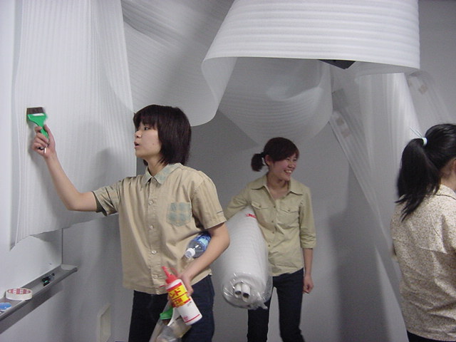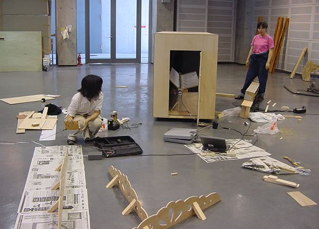 In the center of a huge, dark space, there is a rugged room encompassed with the cloth of three meters in length, three meters in width, and three meters in height. A different movie is projected to each the four outside walls. An innumerable box is piled up on the floor when people enters this room, and the word is written in each box. The word of the box shines when people lifts any box, it sounds in surroundings, and four movies projected to the wall change.