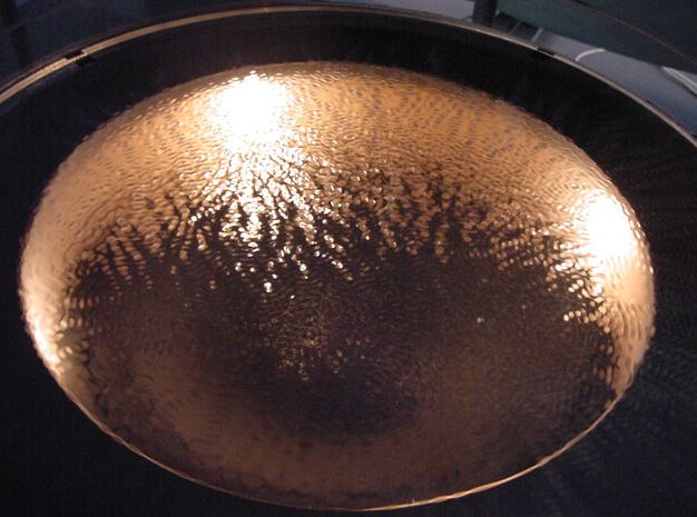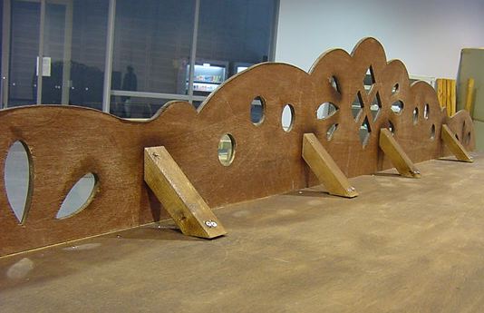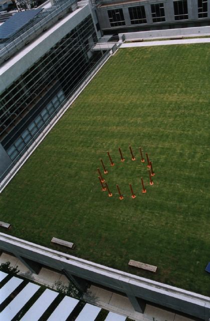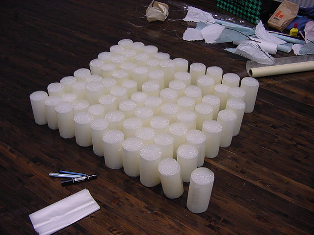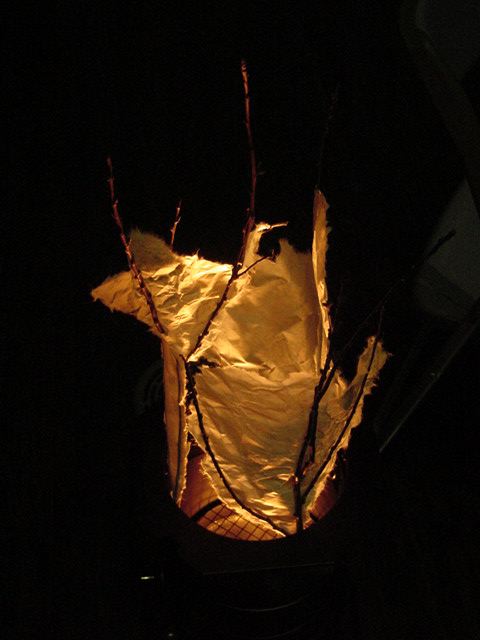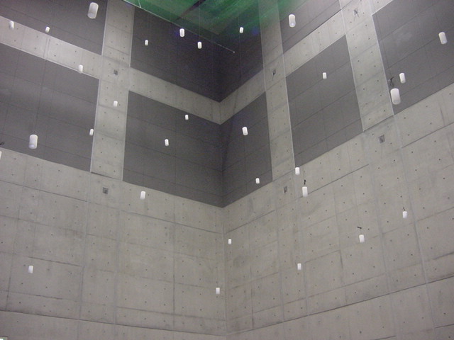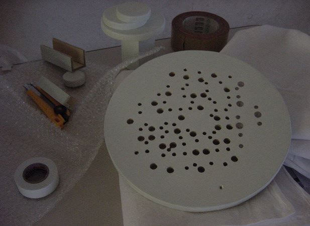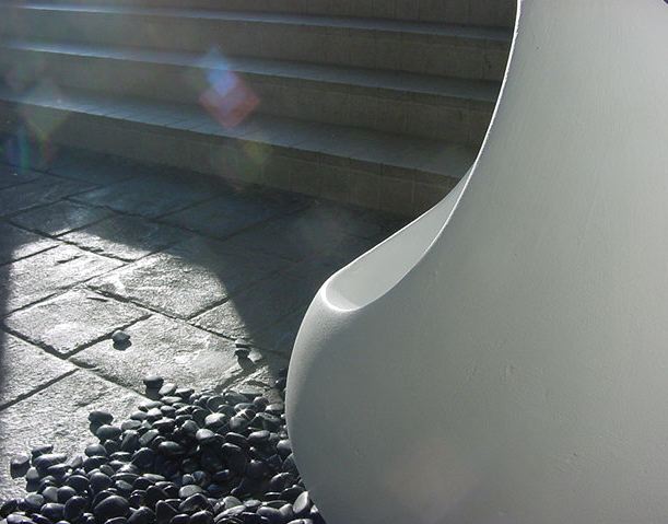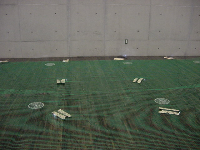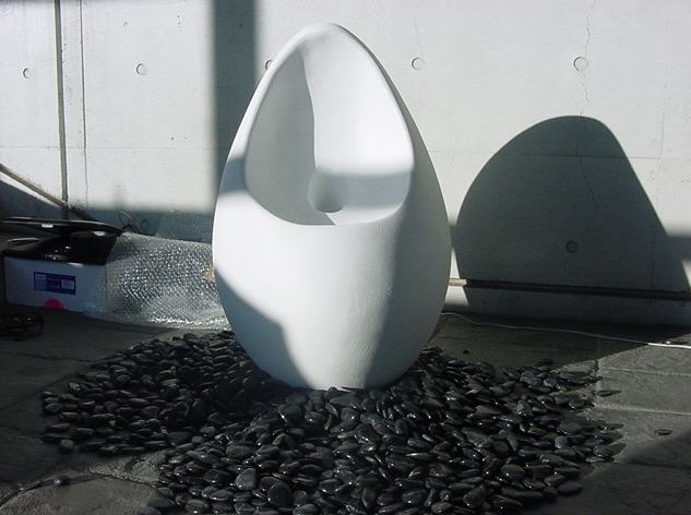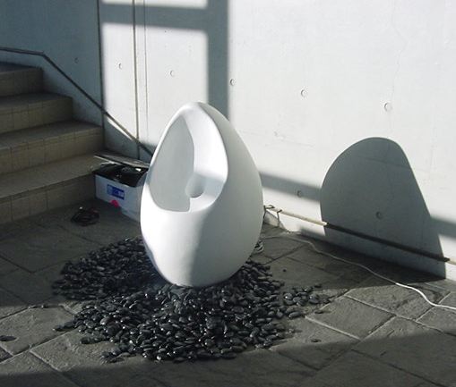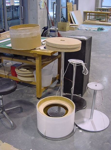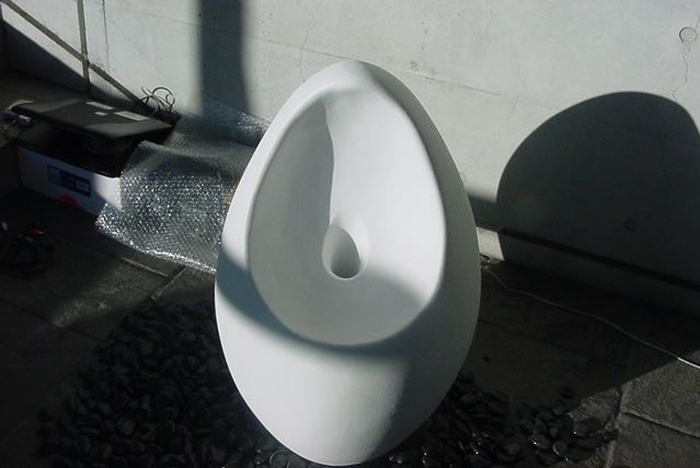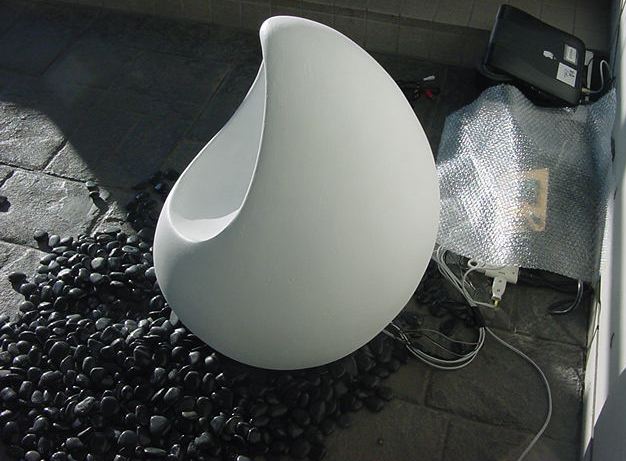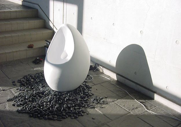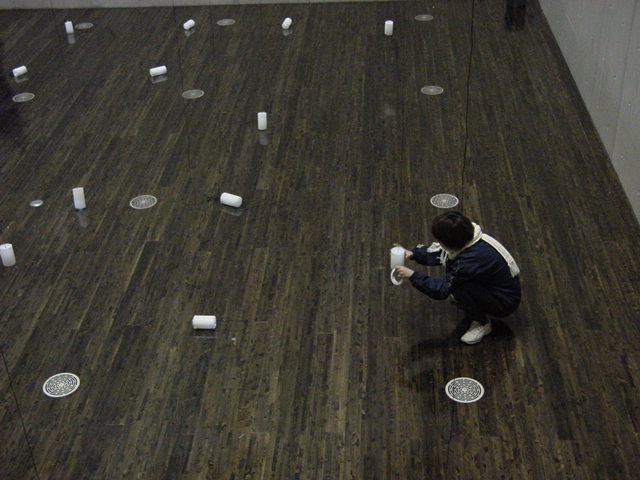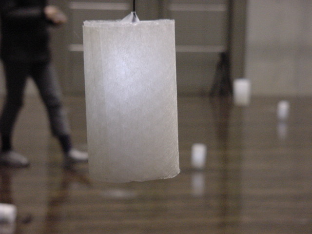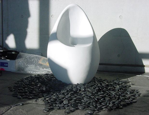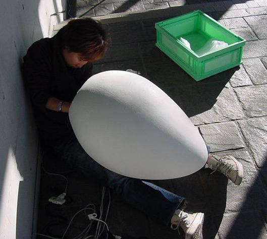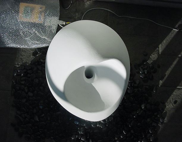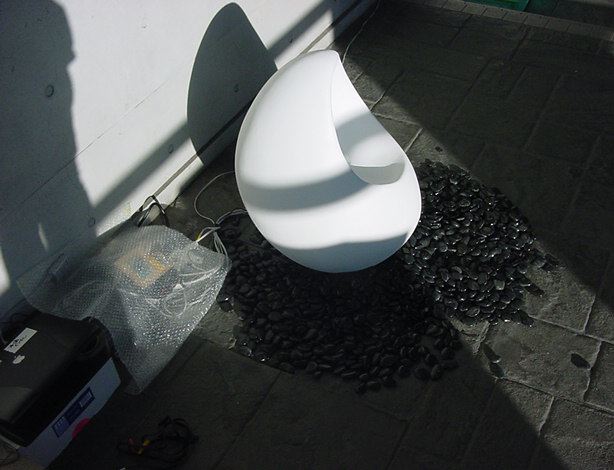 The center of the forming object (fiberglass + epoxy resin) punctures, and there are a lot of small stones in the surroundings. People can throw a small stone into this hall. Then guitar sound rings and an internal lamp shines, light leaks and goes out to the outside through forming.