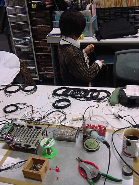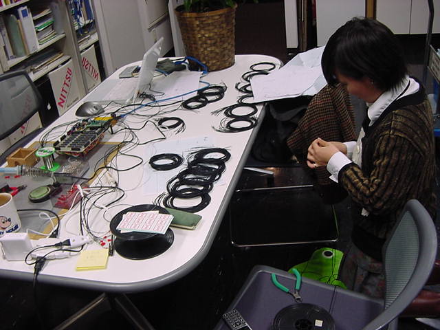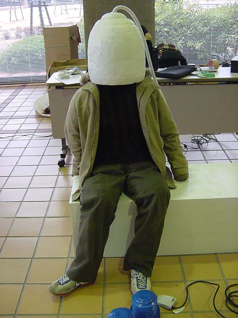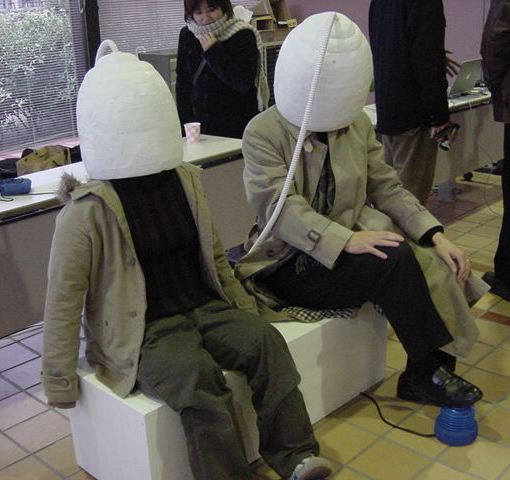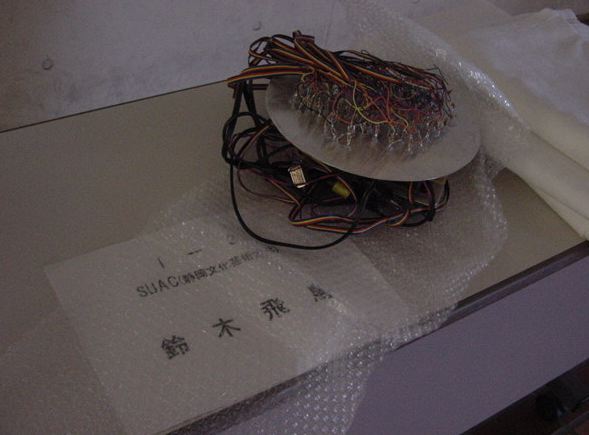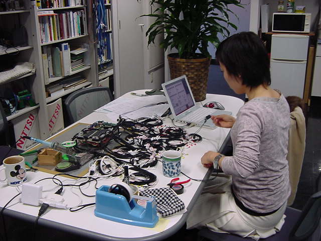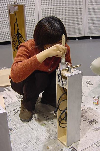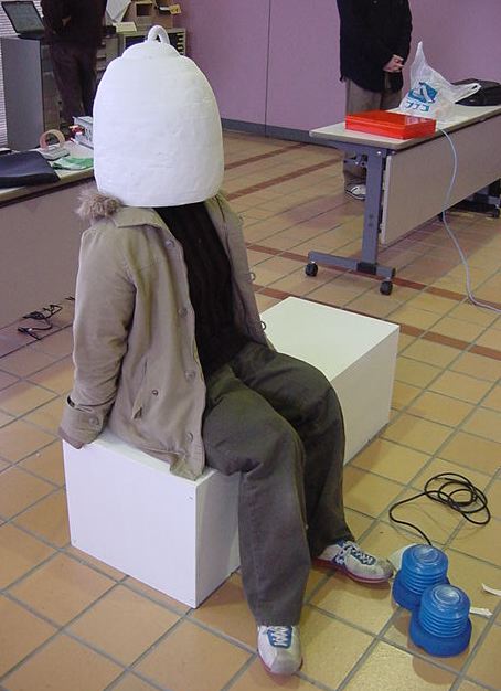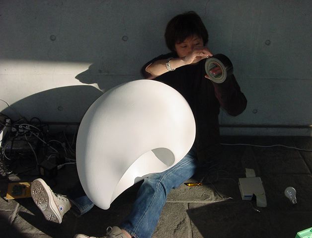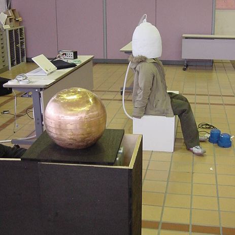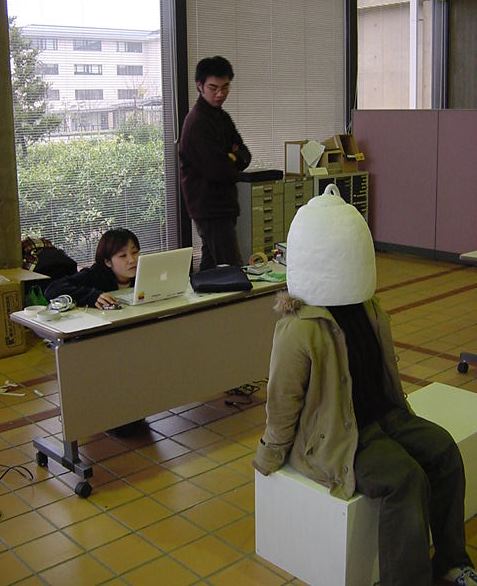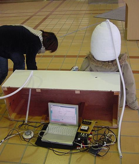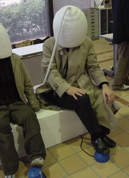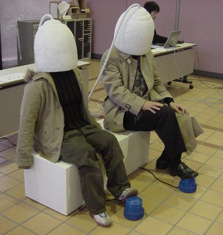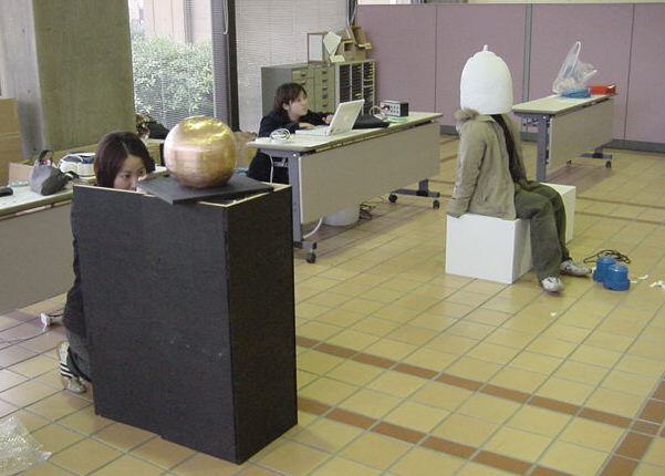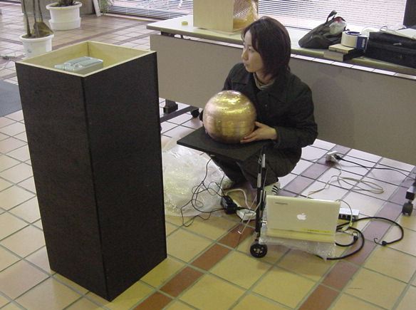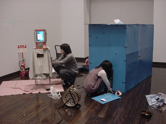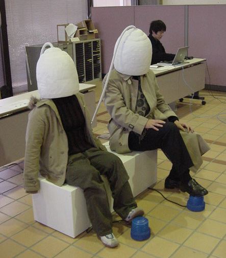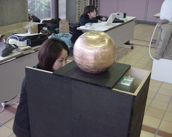 The left side of the photograph is the same size as creator herself doll. When people (right side of the photograph) pushes the foot switch putting on a helmet, he can hear of the sound from the other party.