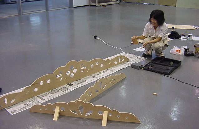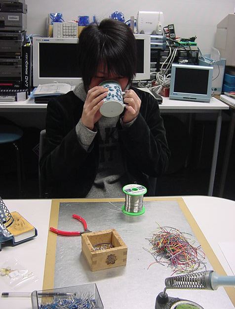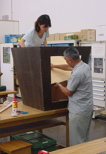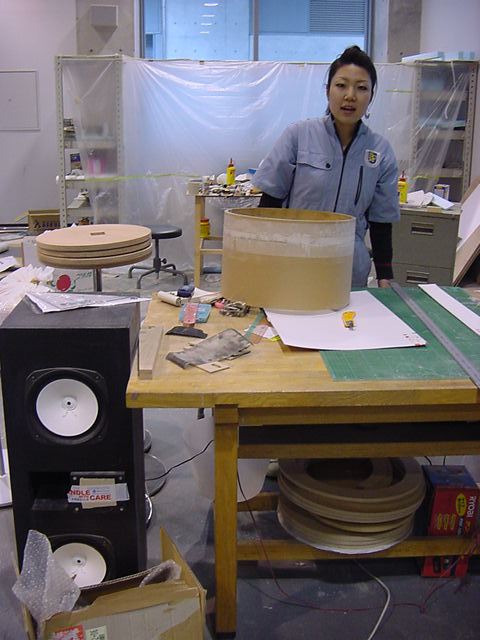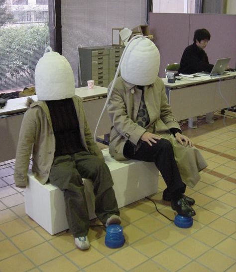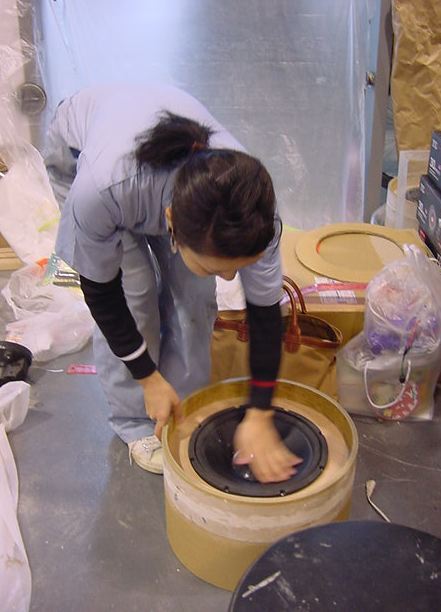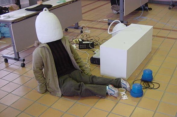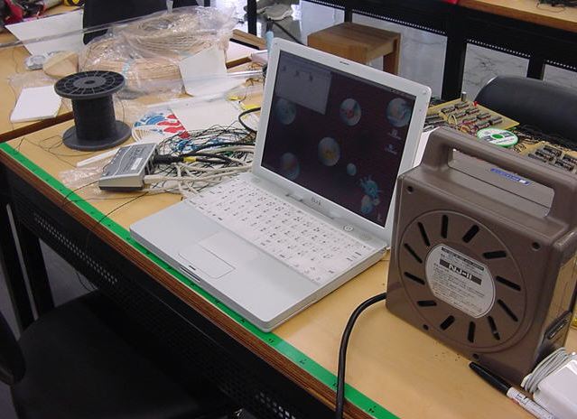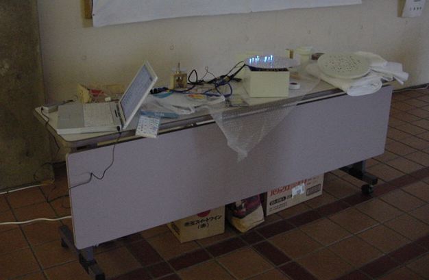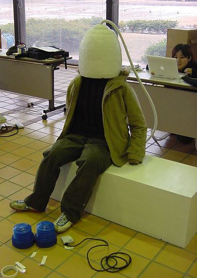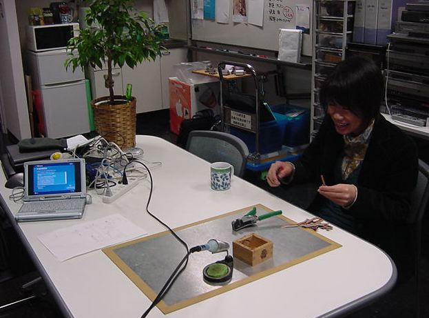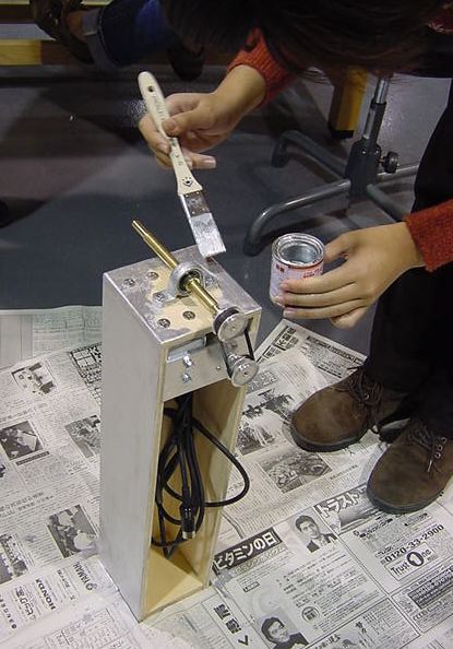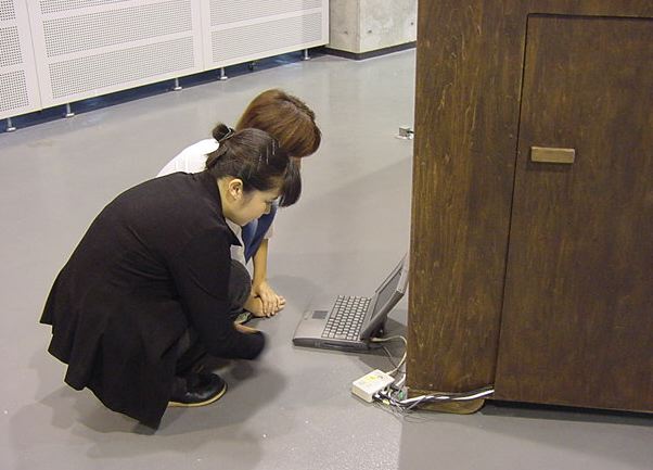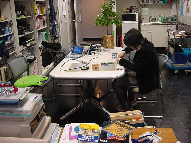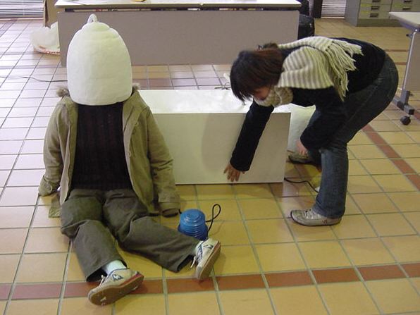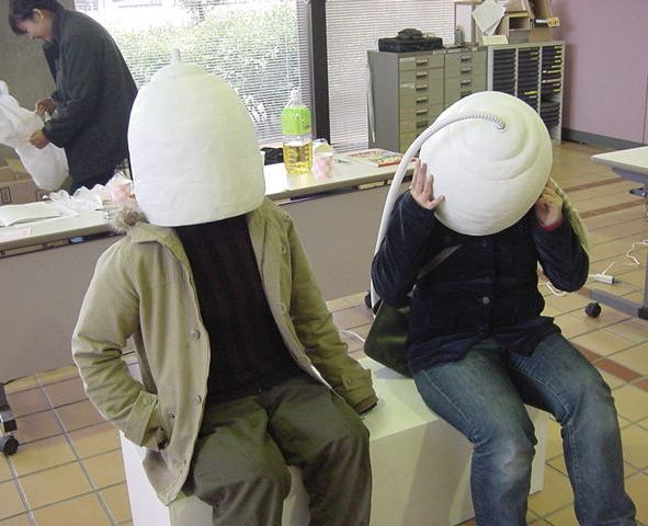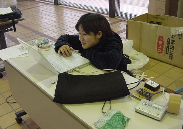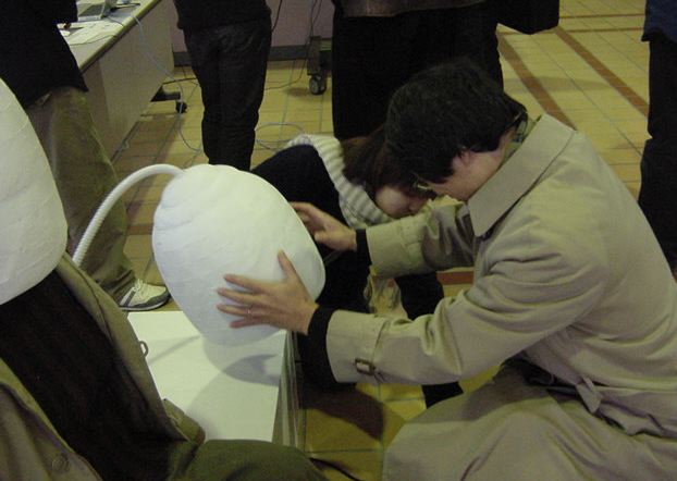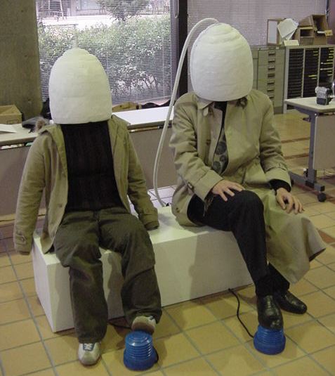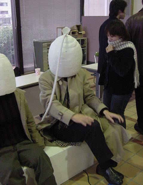 The left side of the photograph is the same size as creator herself doll. When people (right side of the photograph) pushes the foot switch putting on a helmet, he can hear of the sound from the other party.