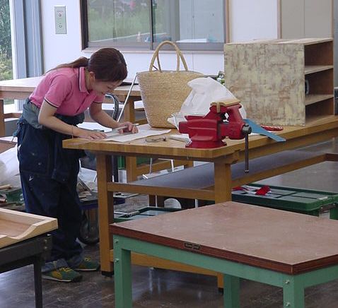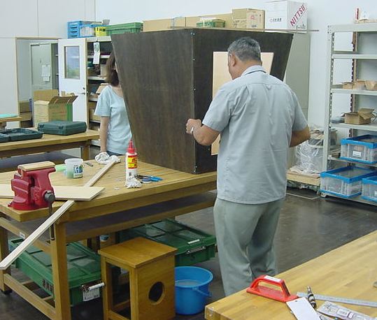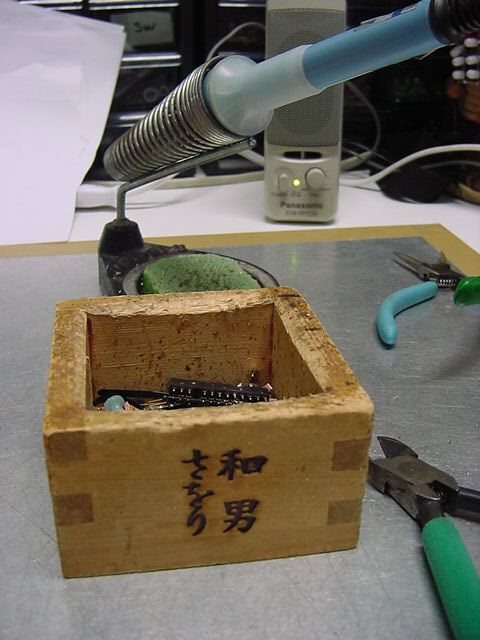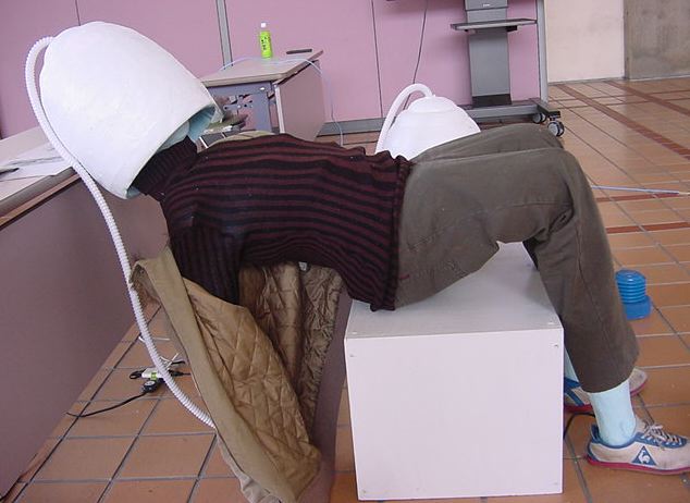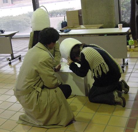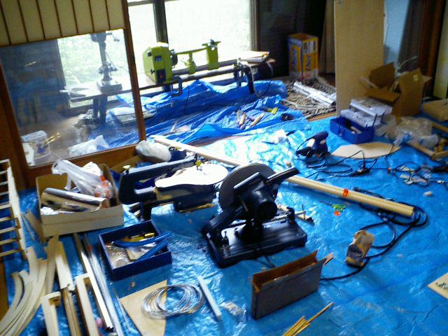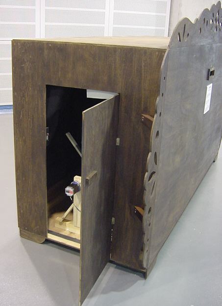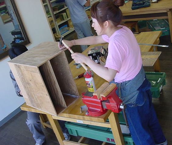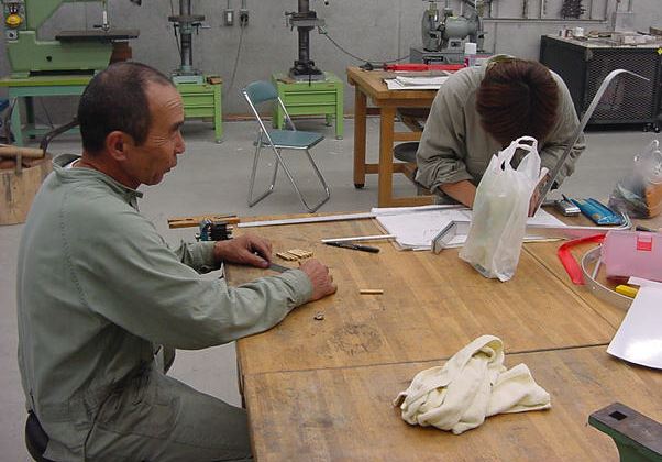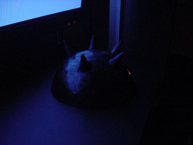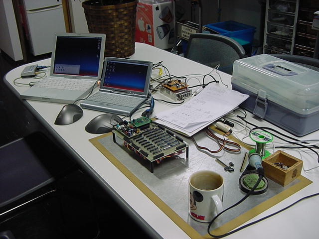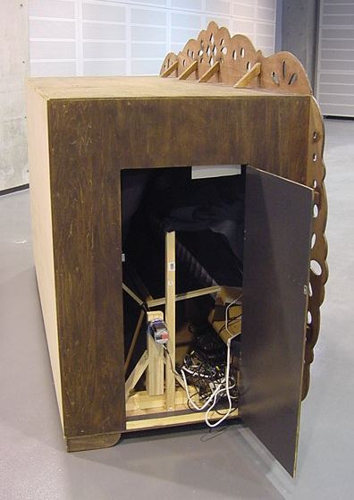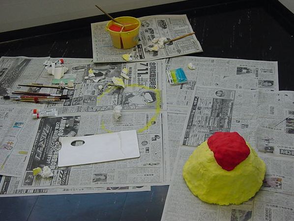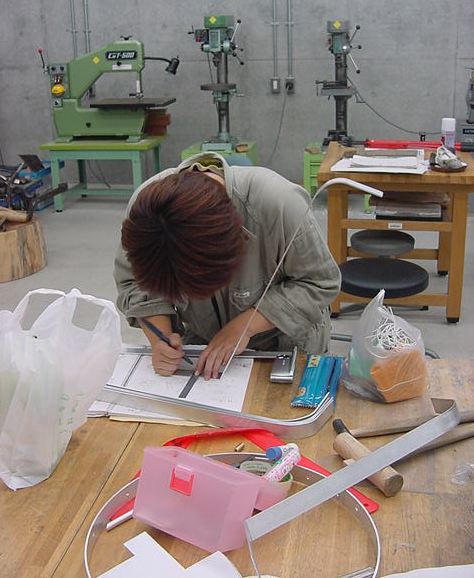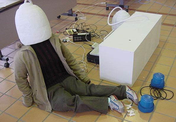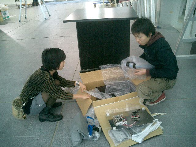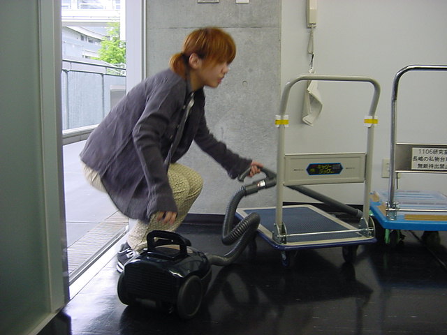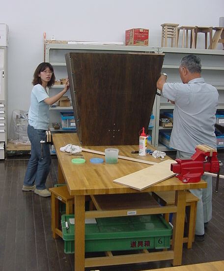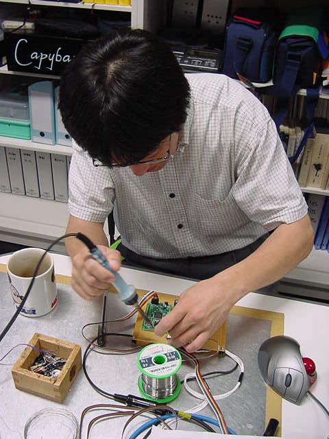 The left side of the photograph is the same size as creator herself doll. When people (right side of the photograph) pushes the foot switch putting on a helmet, he can hear of the sound from the other party.