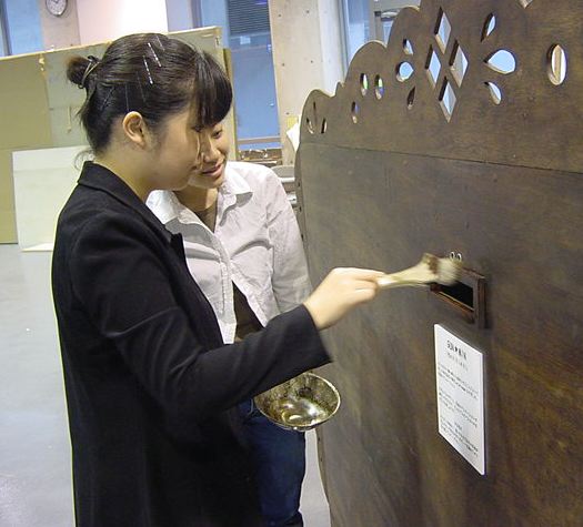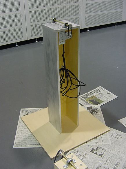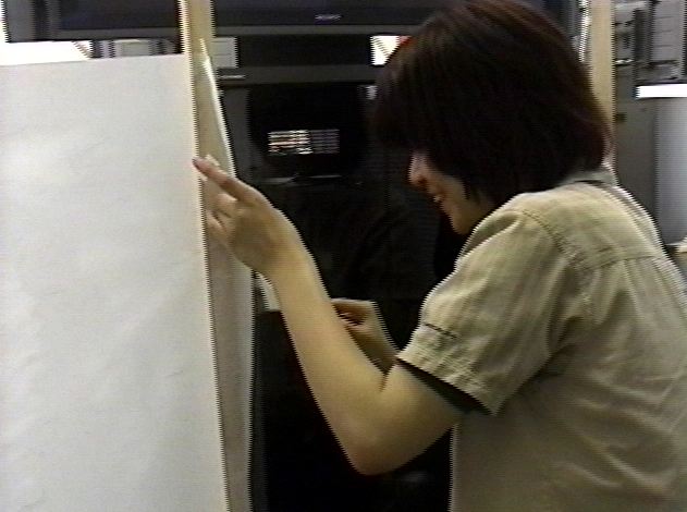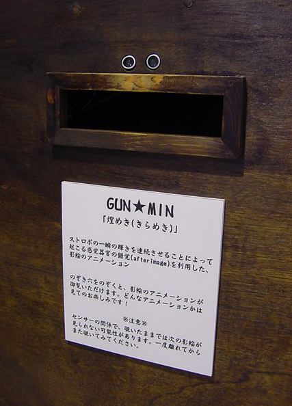 The drum rotates slowly, and animation is drawn in 350 sheets that one side is installed in here. When people throws finger to this sheets, it can enjoy animation in each place.