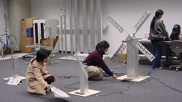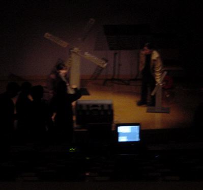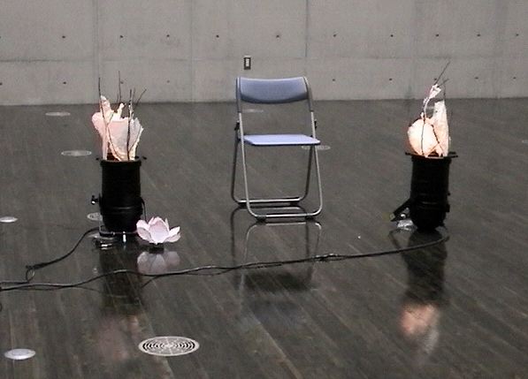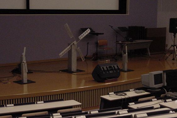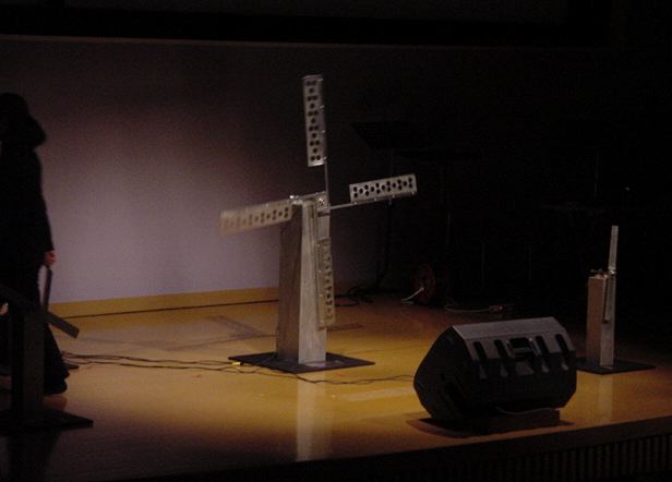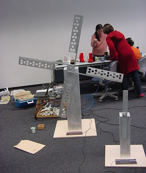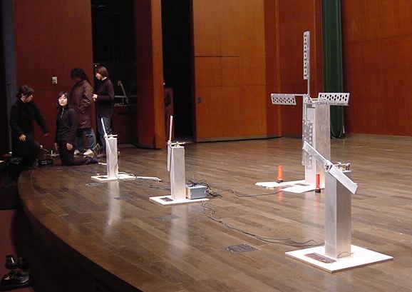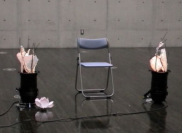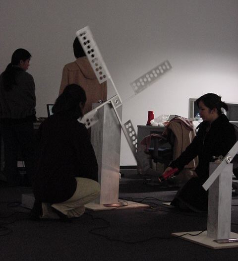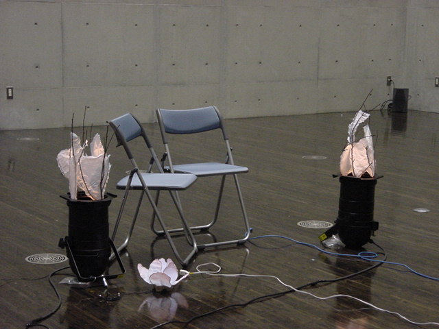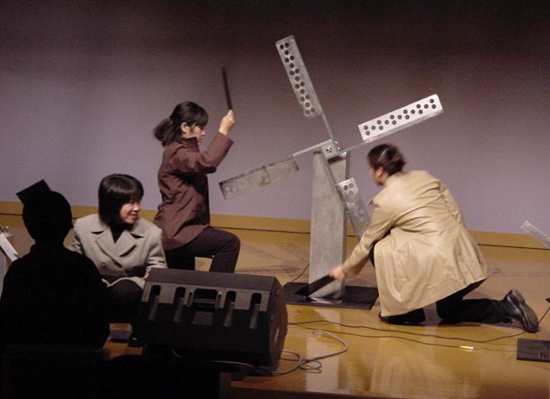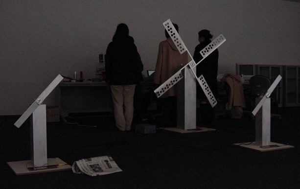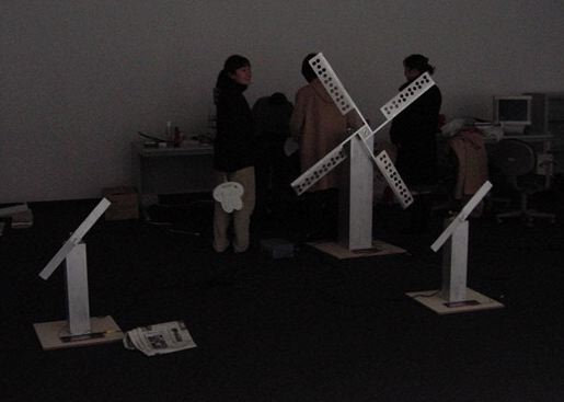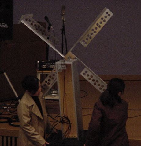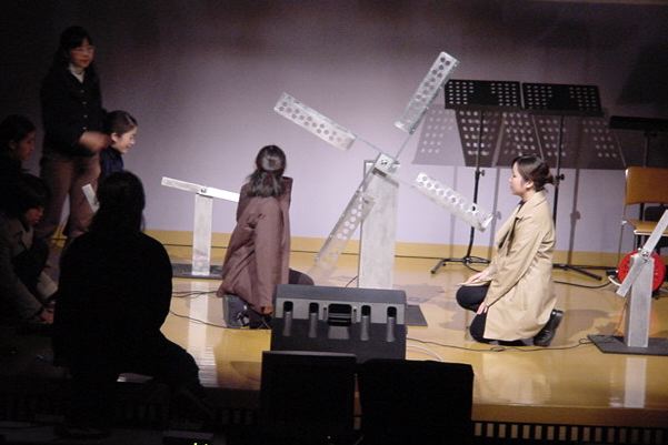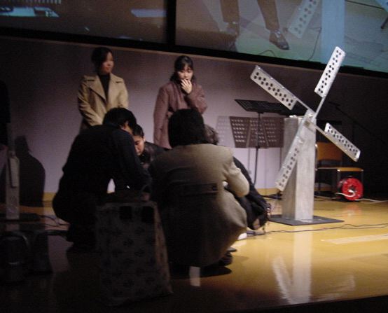 1 big windmill and 3 small windmills rotate reacting with lighting sensors. This is a live performance on the stage with the installation works.