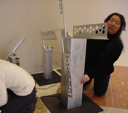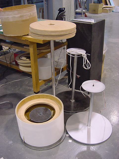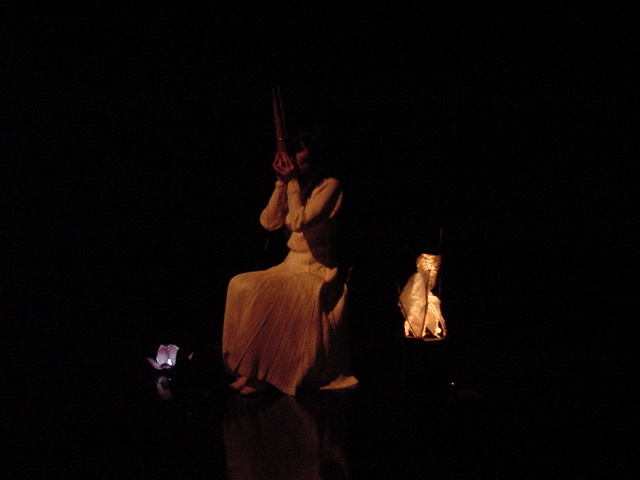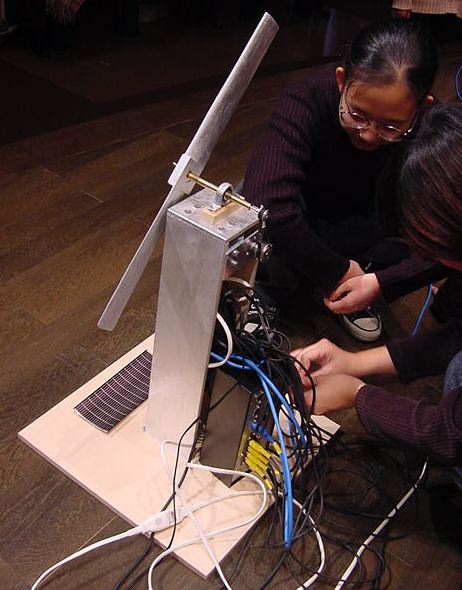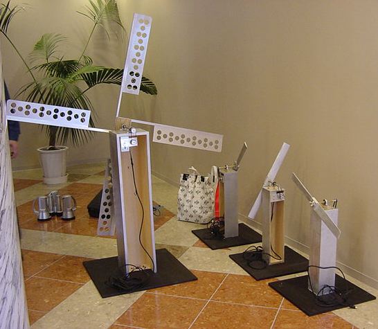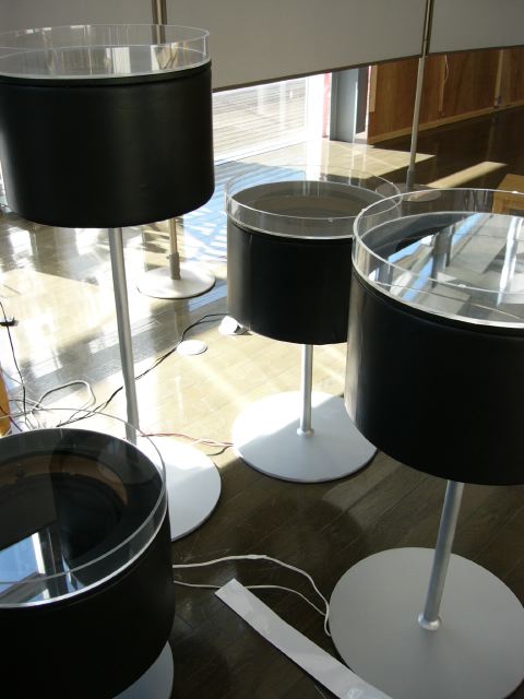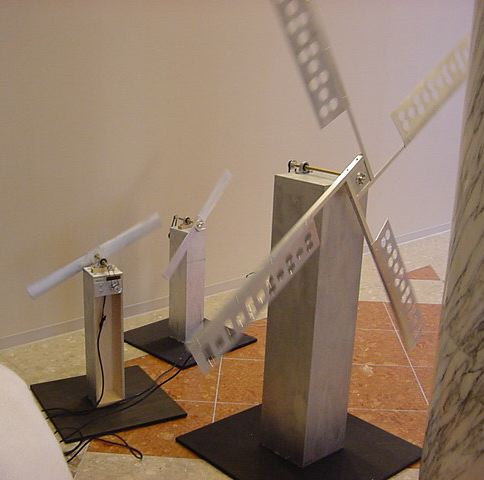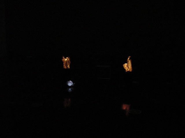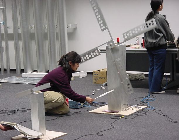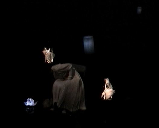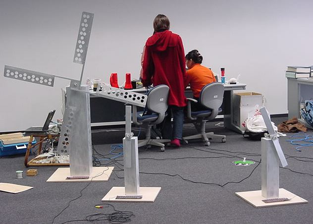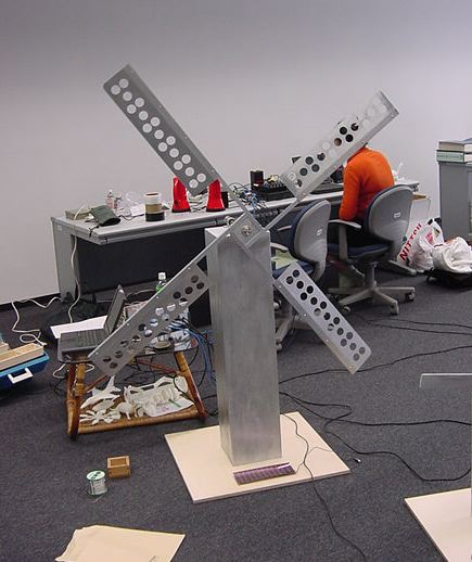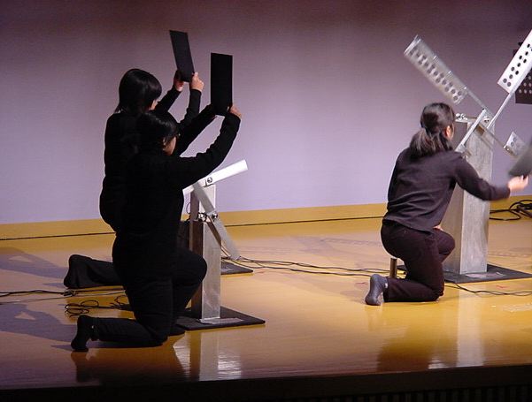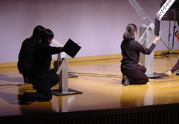 1 big windmill and 3 small windmills rotate reacting with lighting sensors. This is a live performance on the stage with the installation works.
