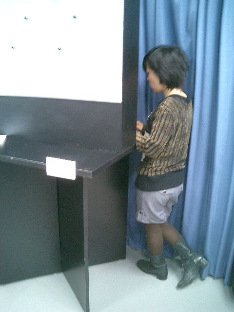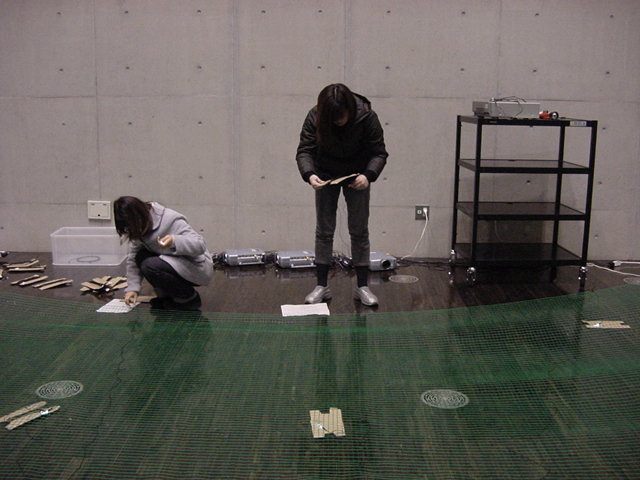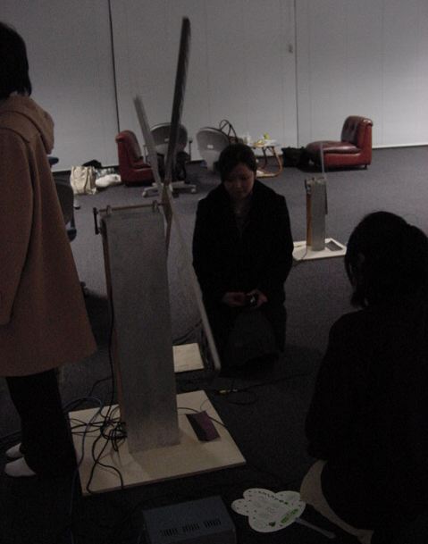 4 plasma monitors, 2 projected "curved surface screens" and 14 pillars compose "Passage". Some sounds are generated and some images change when people passes this passage and when people touch metal objects.