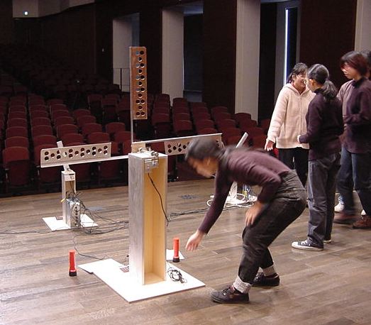 People plays the harp without strings. The sound and graphics are generated with the optical beam sensor. 13 "nonvisible strings" corresponds to the music scale in the vertical direction. Three "nonvisible strings" in horizontal direction change octaves.