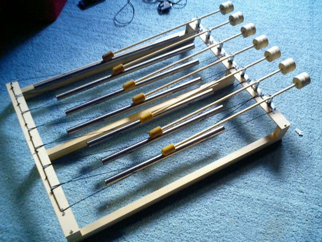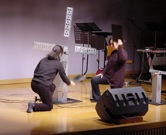 Music is played beating the metal pipe arranged in surroundings one after another when the train model that installs the electrode in the rail runs. The speed and the direction of the train model change depending on the remote control operation of people or the sound of the hall (volume).