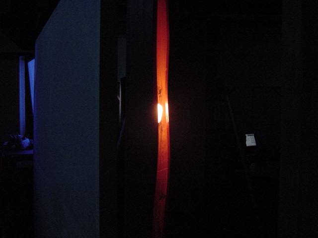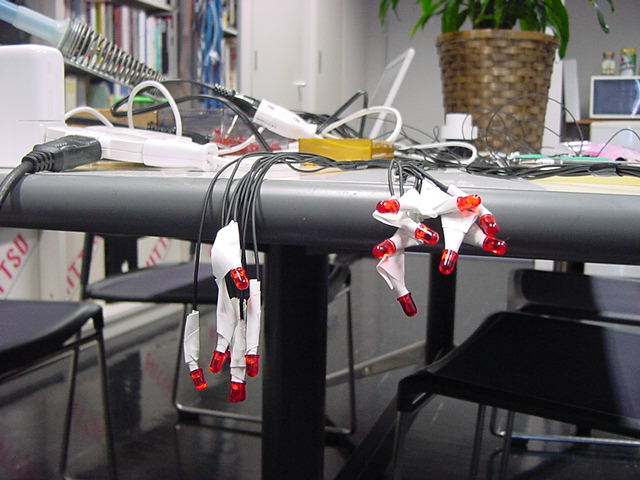 This is an installation work that draws the picture on the screen and generates the sound. Creator performs as live performance. On the other side of the screen, there is an illuminant of infrared rays LED following with the magnet, and it draws in this while following by the image recognition of the video camera on the other side of the screen. The controls such as a color, patterns, and color changes are done with the controller and the glove of original production.