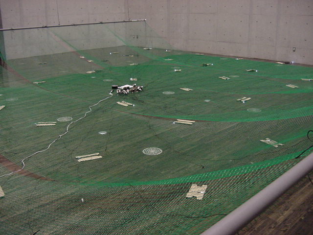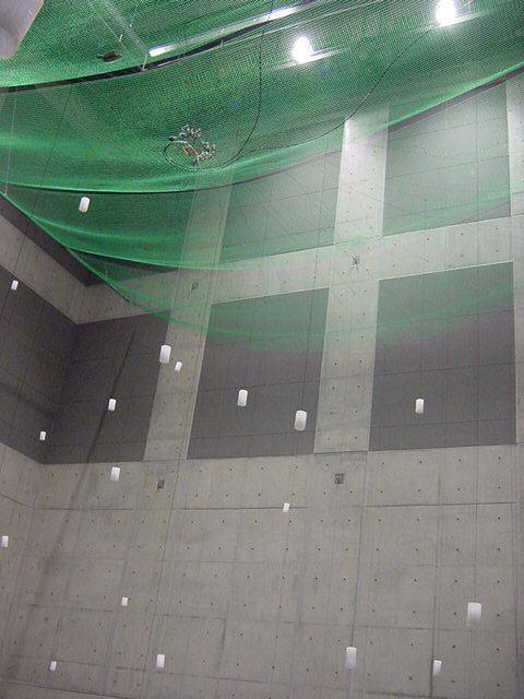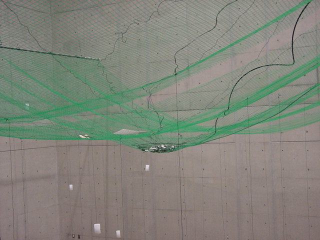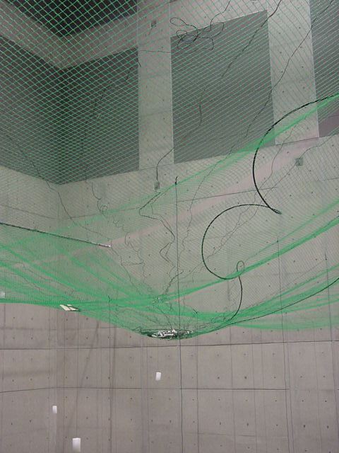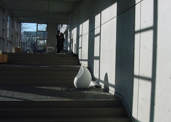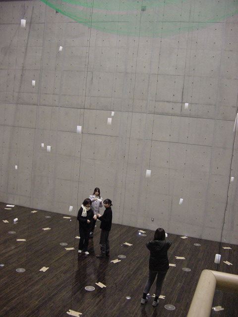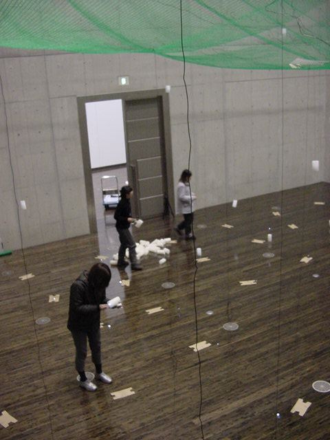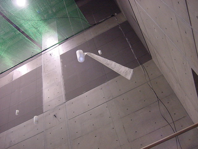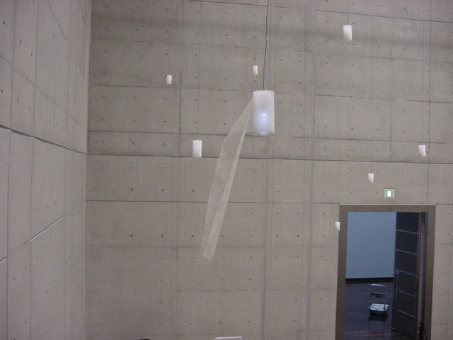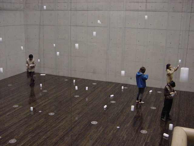 It is a huge hourglass to which 4000 Stirorne balls fall one by one. When a small hourglass is upset by people, movie projected to the falling ball is changed. And movie projected to the balls on the floor is changed at the same time.