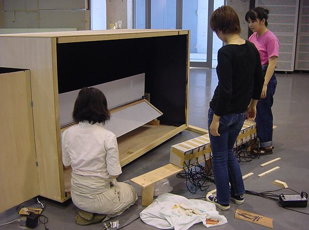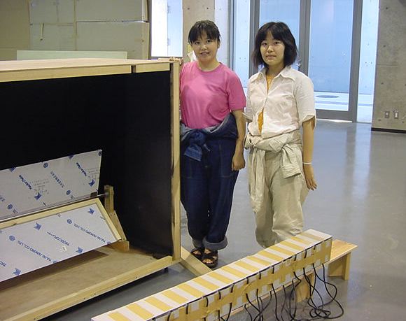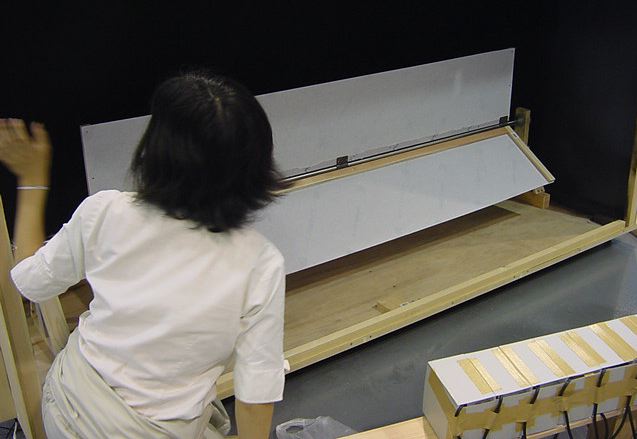 When people looks into the peephole of the big box, 16 flash lamps emit light one after another, then "Shadowgraph" moves as animation.
