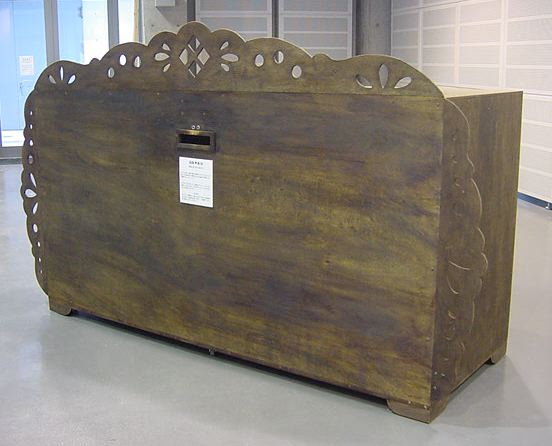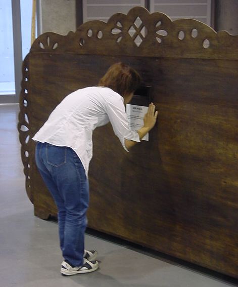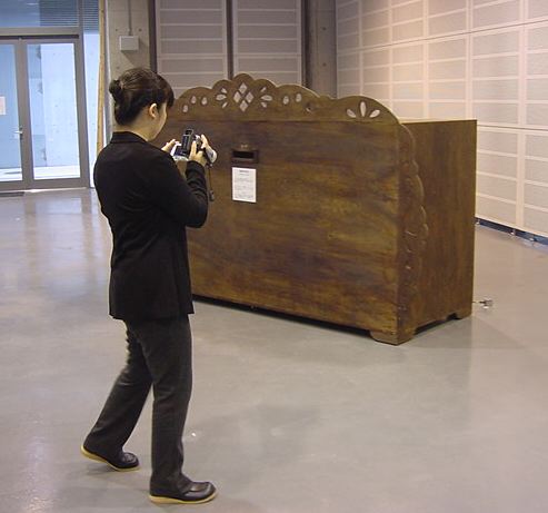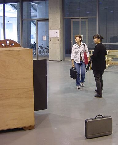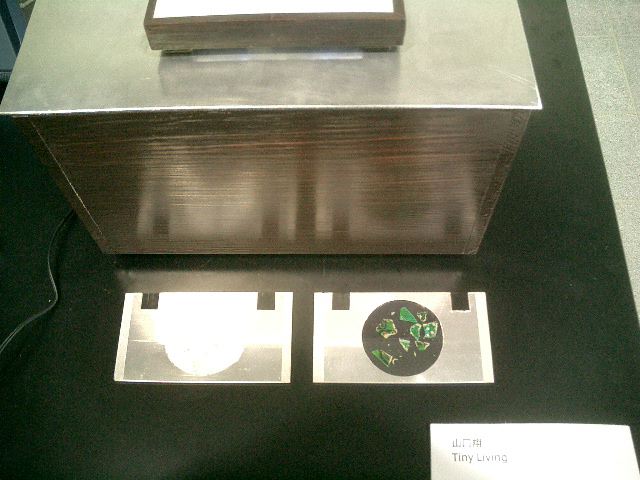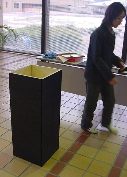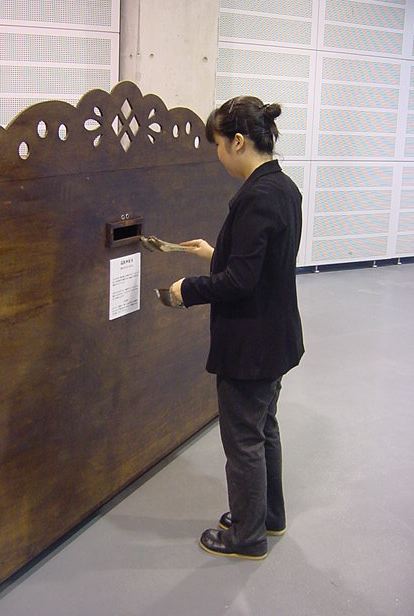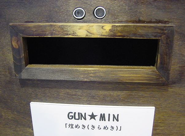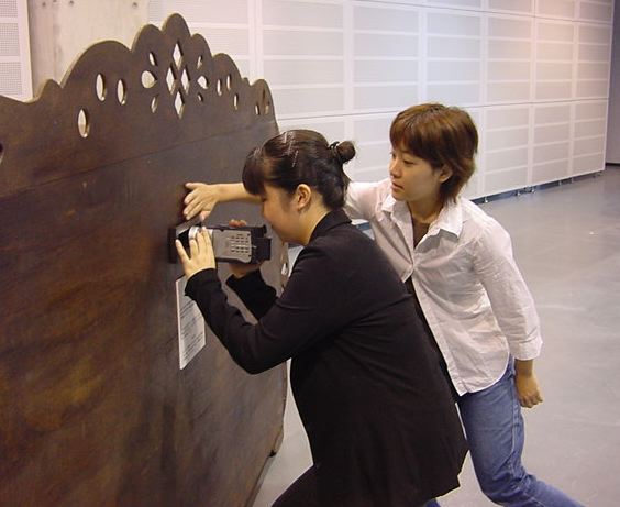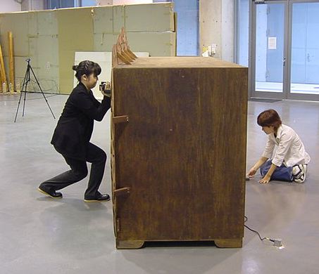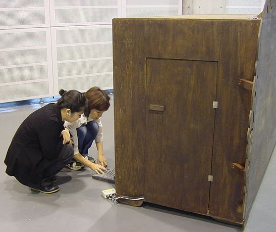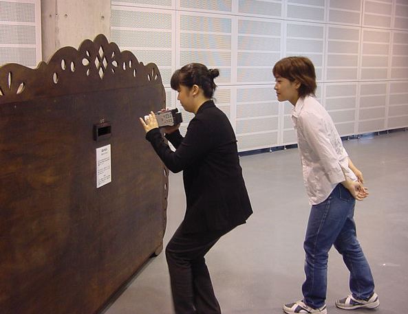 This work is composed of five boxes. There is a round eyehole in each box, and when people looks it into, "Happiness" is found respectively. Only one box appropriates the ear and hears the sound of "Happiness".