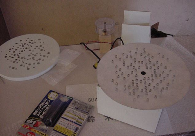 When people turns the anemometer on the wind-watching chicken,the projected image changes, and 123 blue LEDs rotate like the whirl.