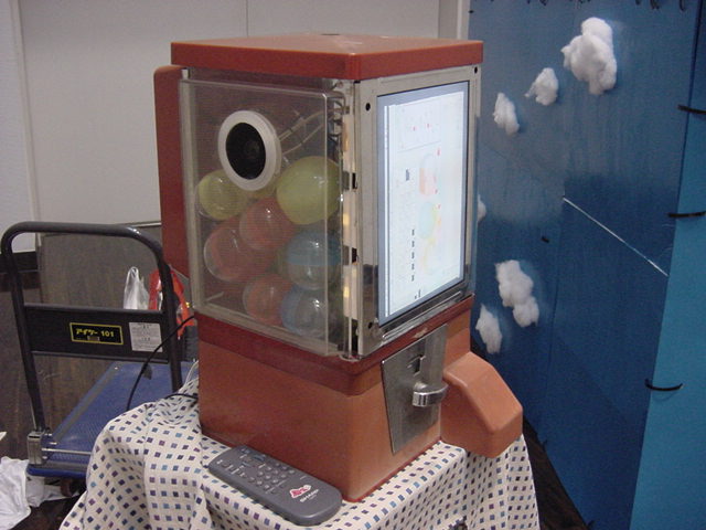 People puts 100YEN coin in the coin slot and works the dial. Then, various Movie is displayed from the inside instead of the capsule that comes out with the toy.