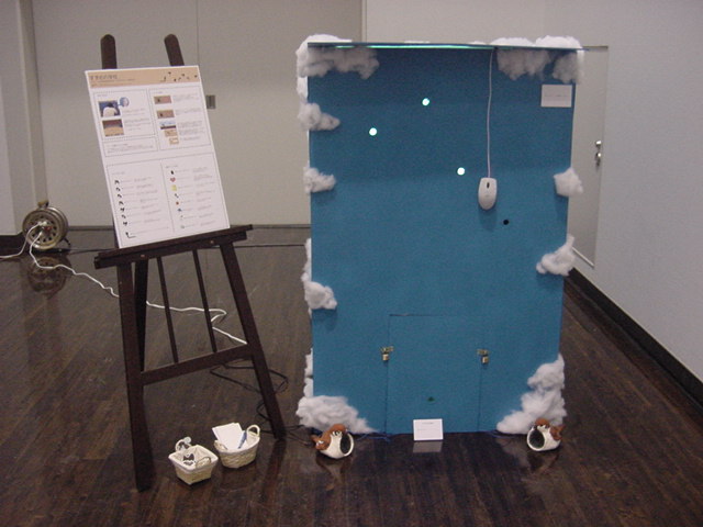 People looks into the eyehole of the hut. The mouse is applied to the wall and it operates it. Sparrows of various characters are manipulated, and it enjoys a communication each other and the change in scenery.